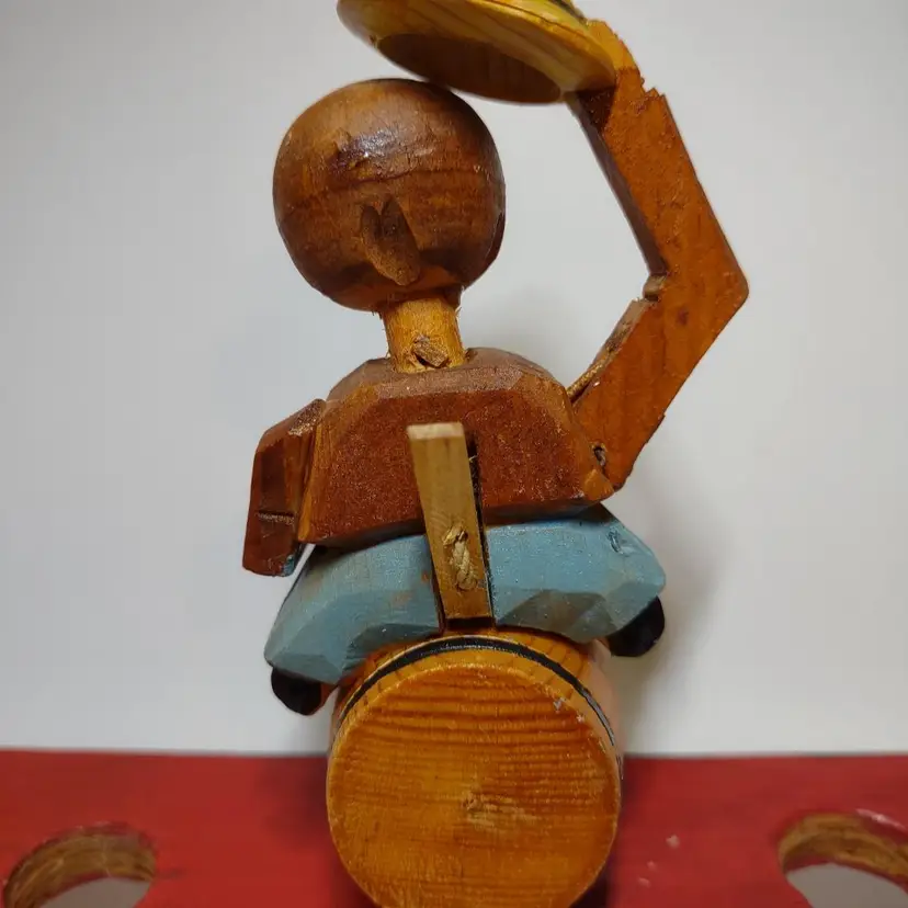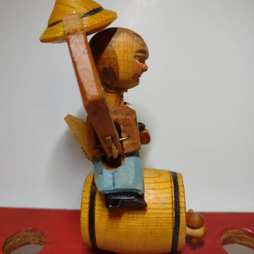 This ANRI Seated Man Tips Hat Bottle Stopper Carved Puppet Barware Vintage Mechanical is an essential item for any bar. It is handmade and carved from wood with beautiful carvings. Its design features a man in a seated position and tipping his hat to its audience. It is the perfect gift for a friend or a loved one.