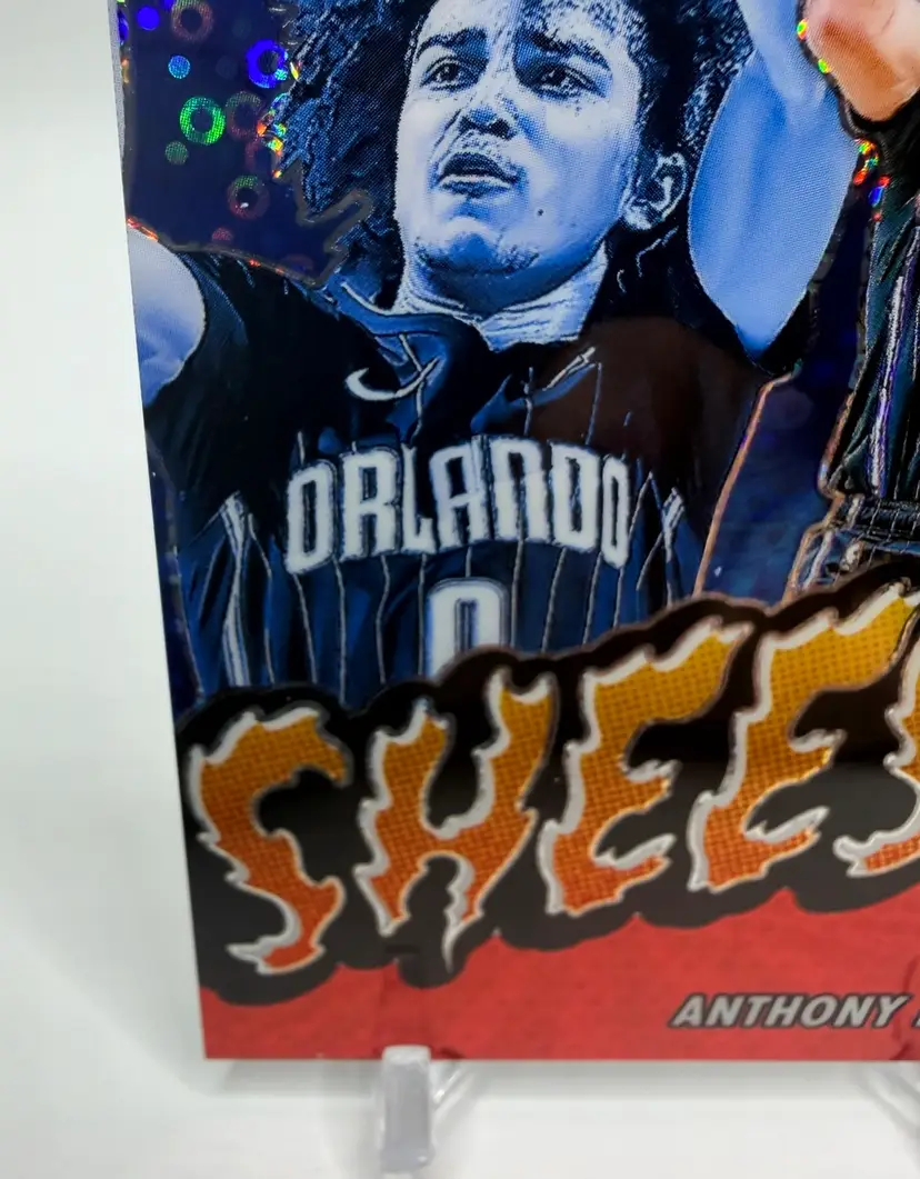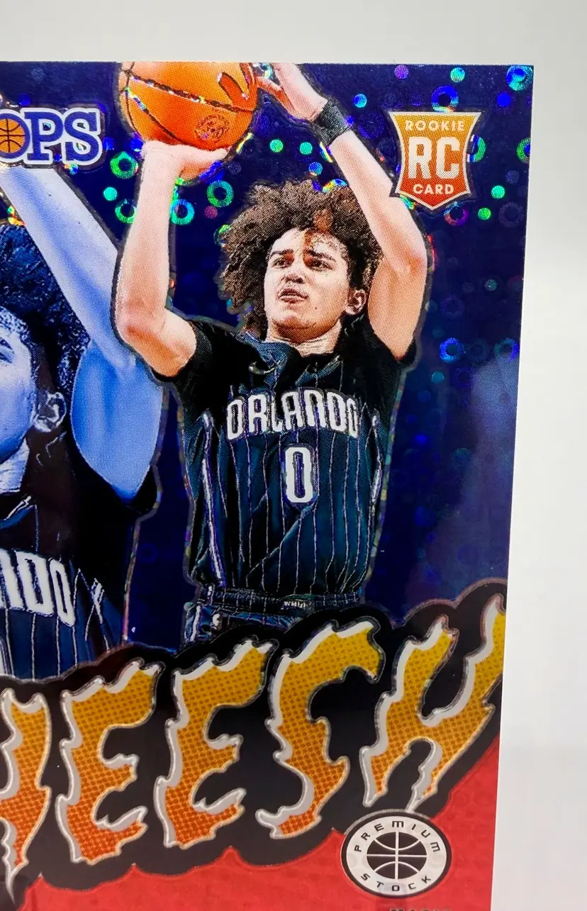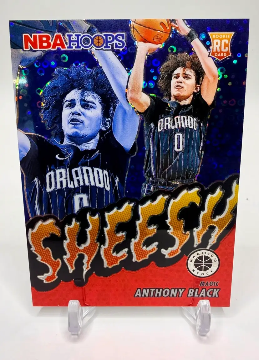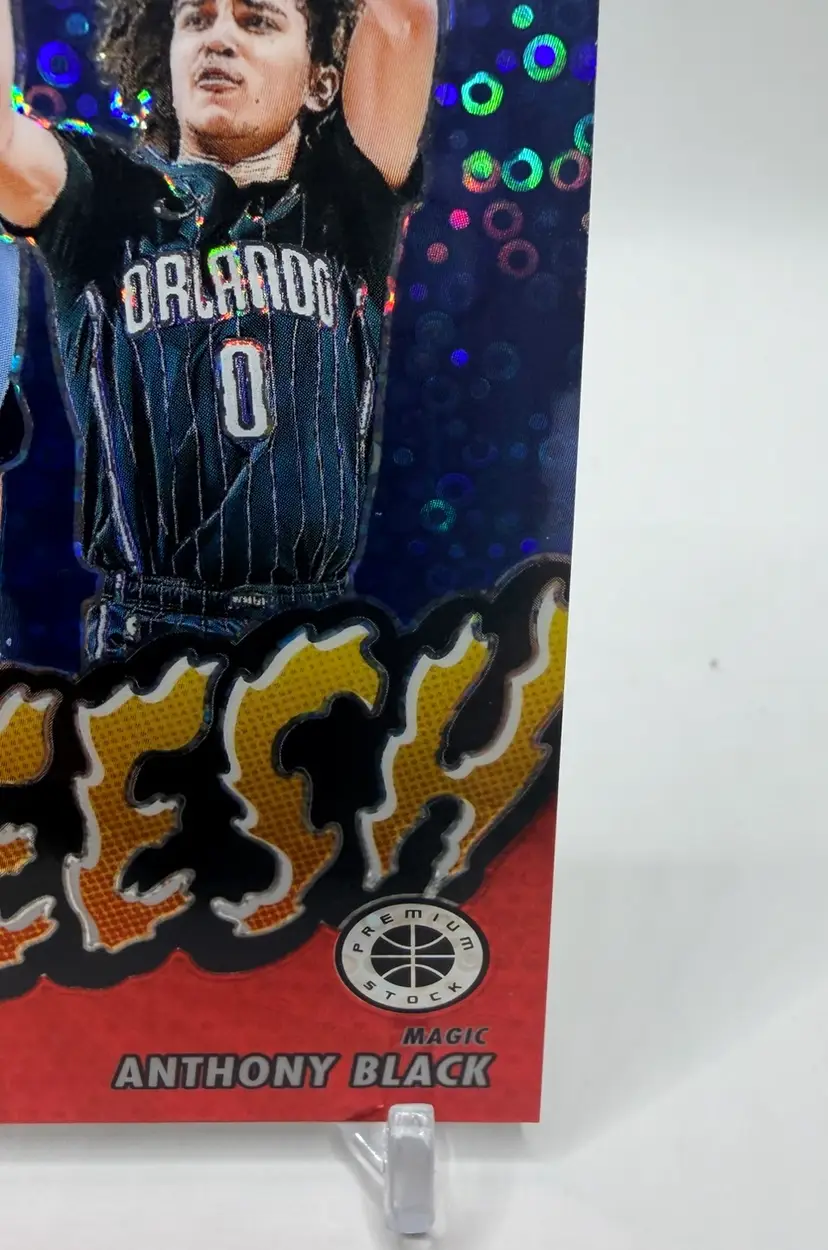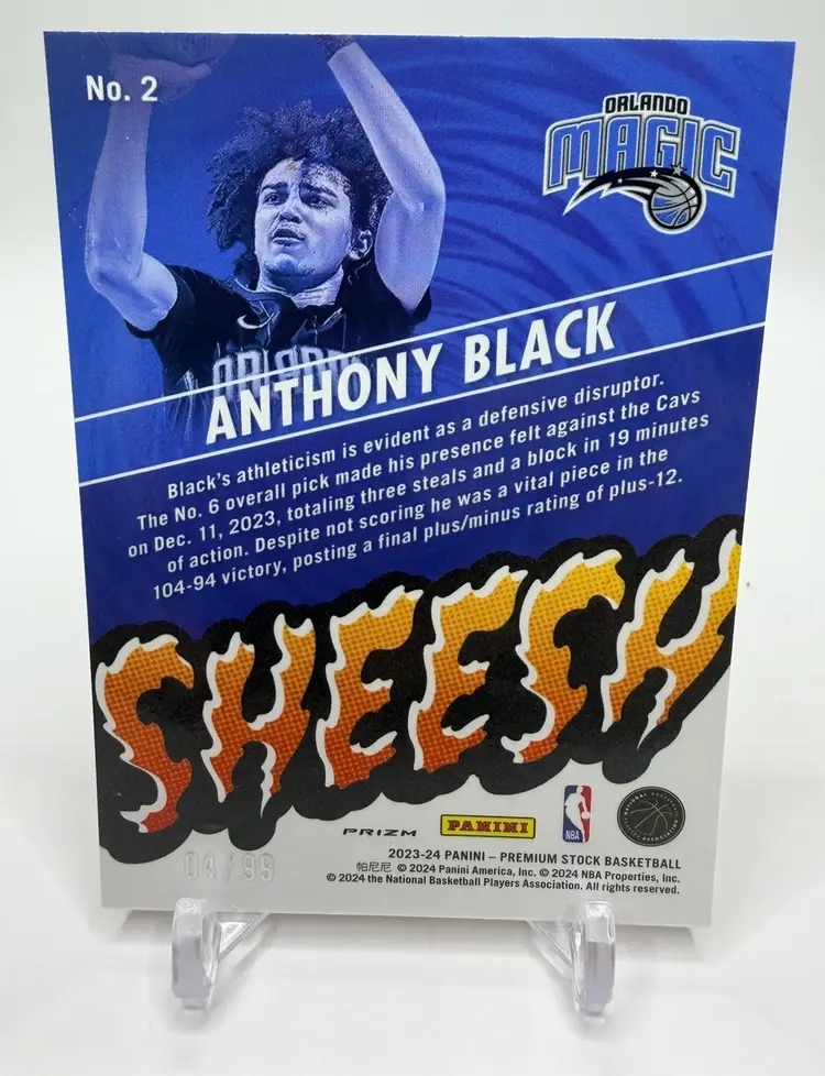 2023-2024 NBA Hoops Premium Stock trading card featuring Anthony Black of the Orlando Magic. This card is a Sheesh insert set with a limited print run of only 99, making it a rare and sought-after collectible for basketball fans. Please review the photos carefully to assess the condition of the cards. We do our best to provide clear, detailed images, especially for cards with noticeable flaws. Please note that some raw cards may show light wear, so we encourage close inspection. Cards will be shipped securely.Thank you for checking out our store and for your support! I'm on Instagram as @915_rookie_rush_trading_cards.