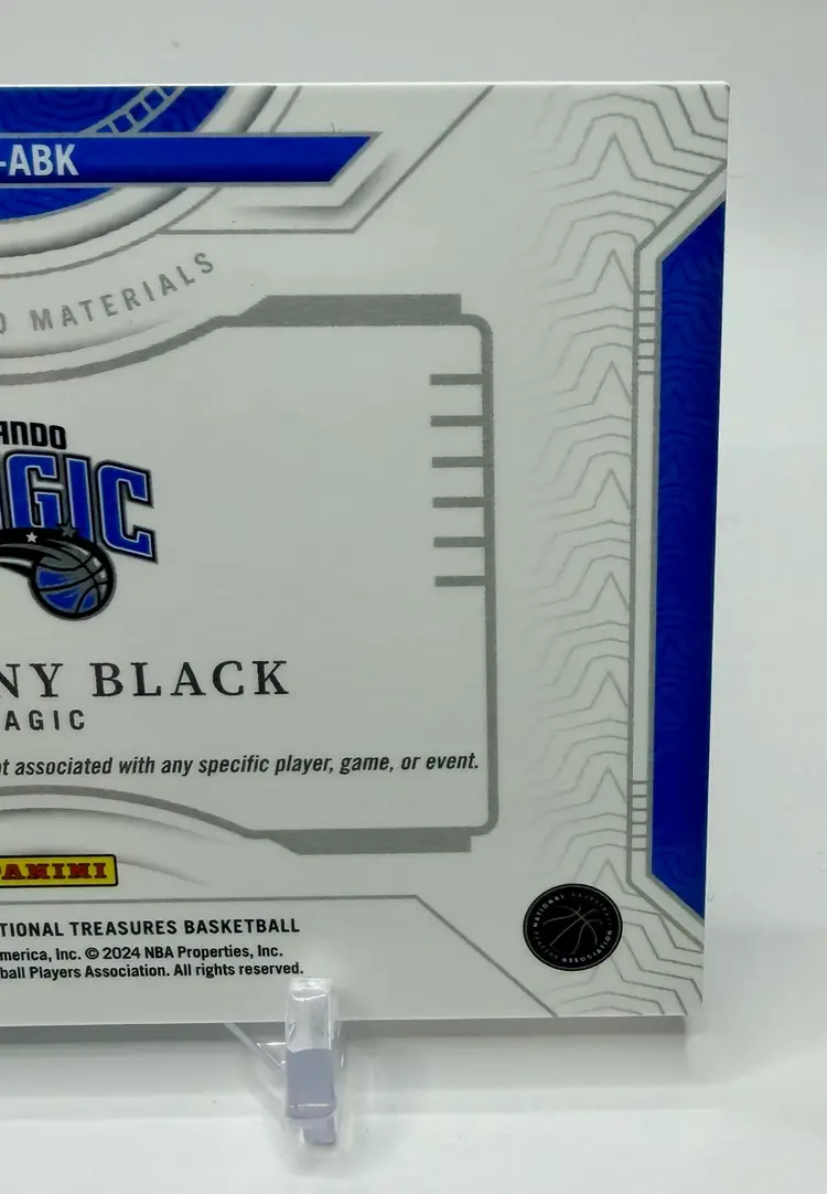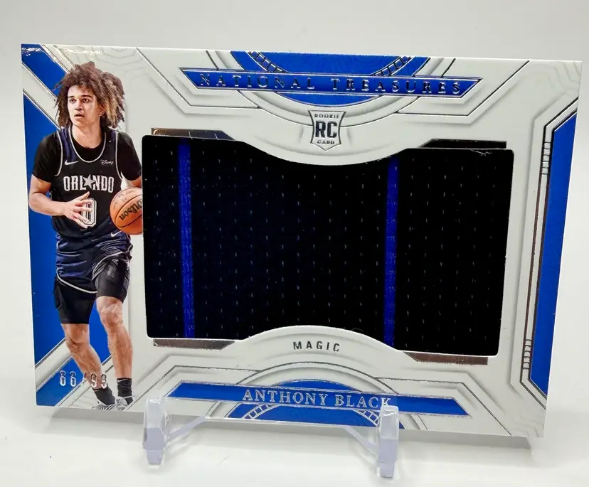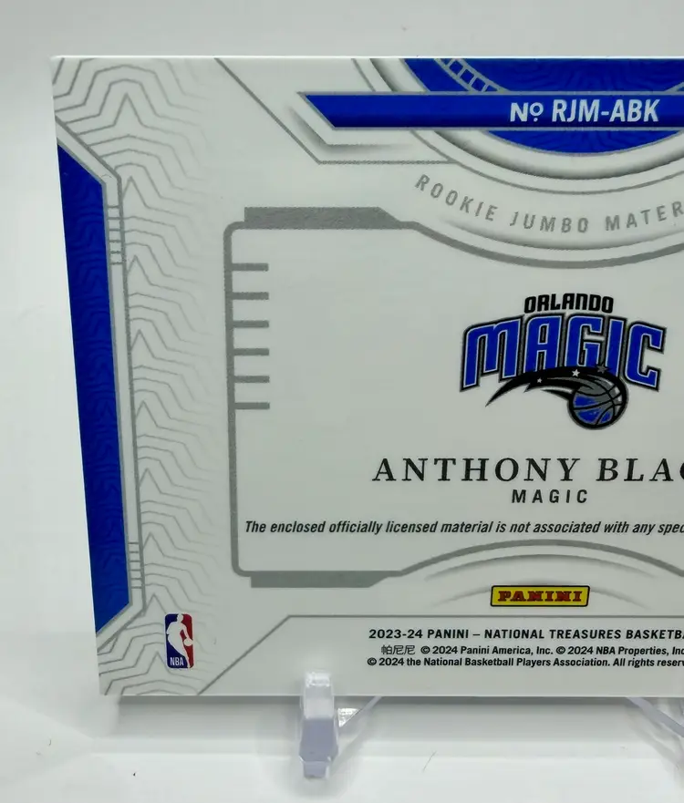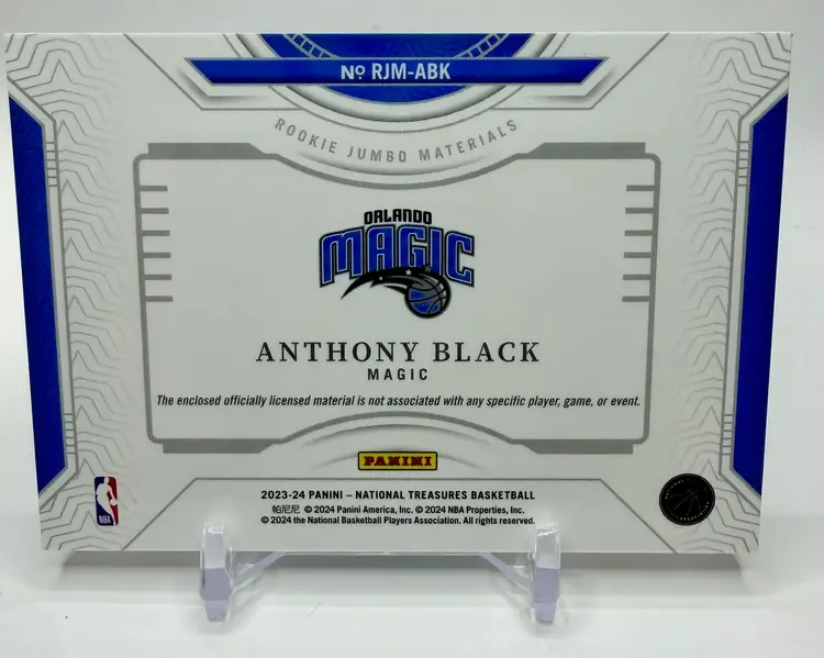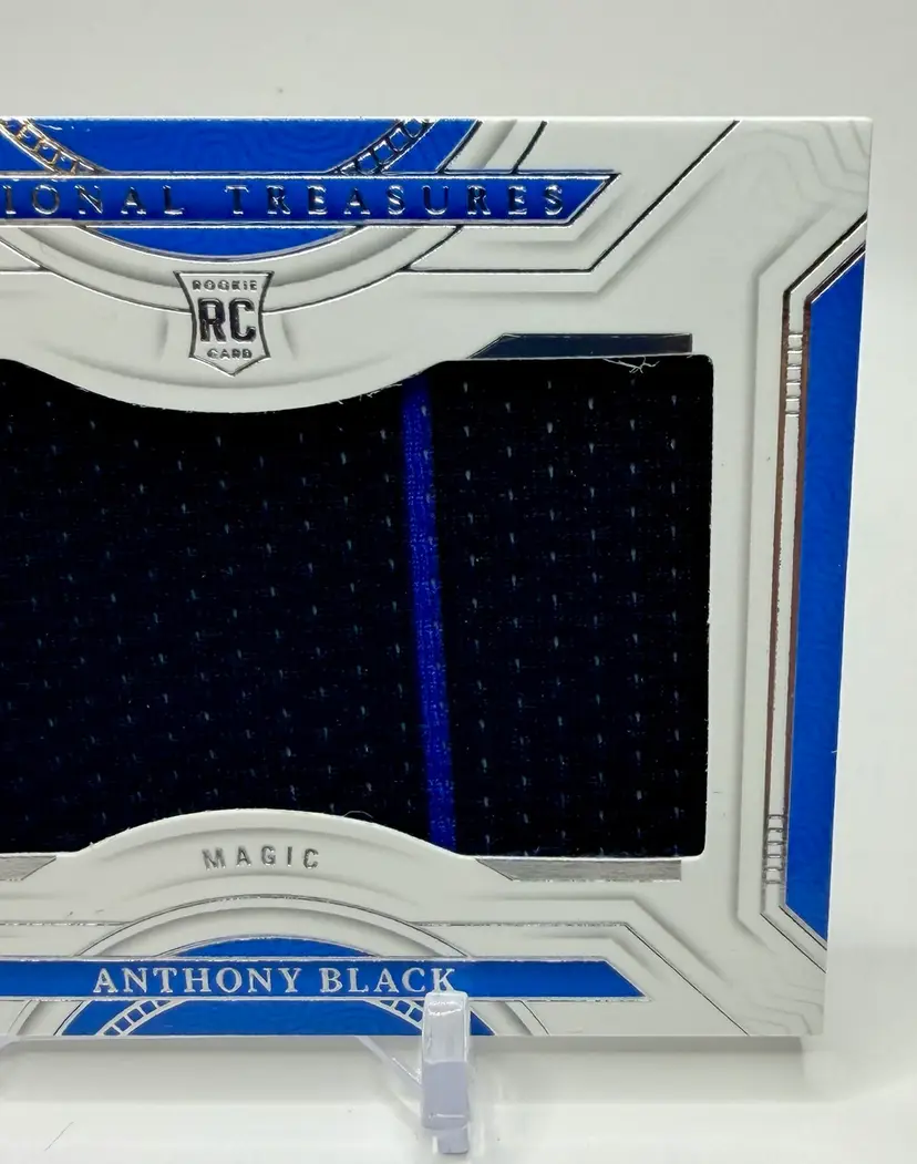 Anthony Black 2023-24 National Treasures Rookie Jumbo Patch /99 Magic RC trading card is a highly sought-after collectible for basketball fans. Manufactured by Panini, this original card features a jumbo patch of Anthony Black's Orlando Magic jersey, making it a valuable addition to any sports trading card collection. Please review the photos carefully to assess the condition of the cards. We do our best to provide clear, detailed images, especially for cards with noticeable flaws. Please note that some raw cards may show light wear, so we encourage close inspection. Cards will be shipped securely