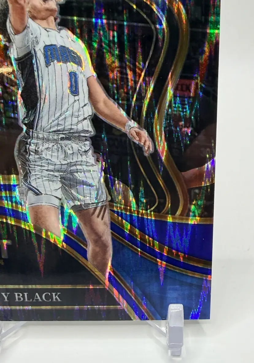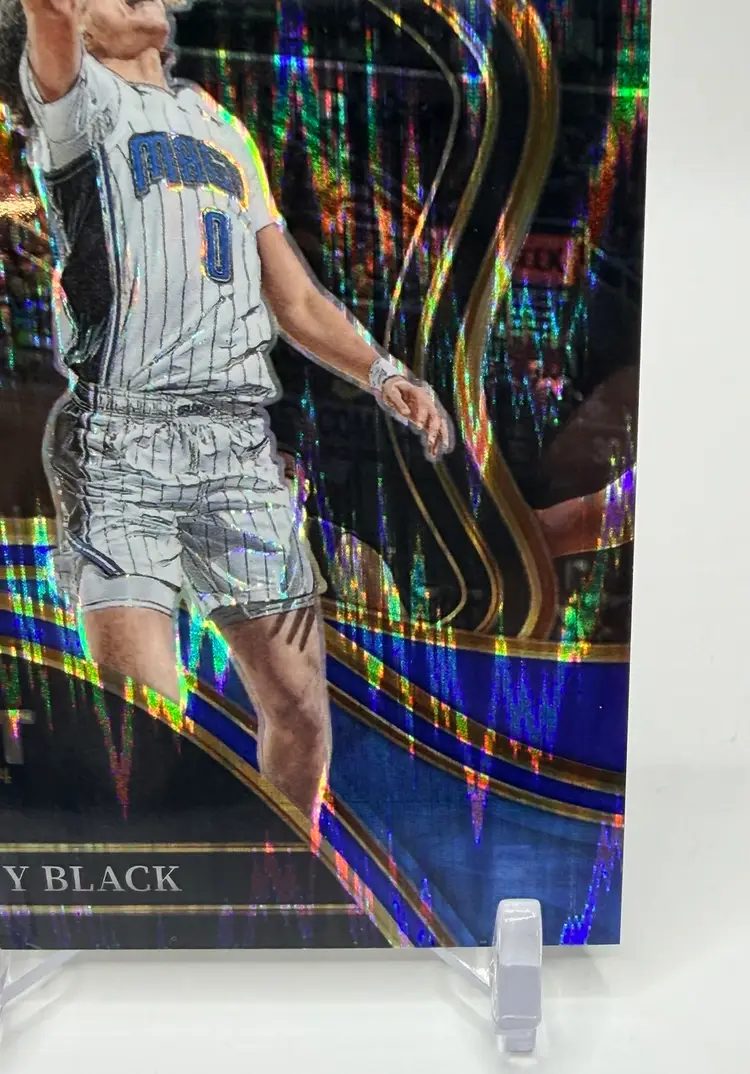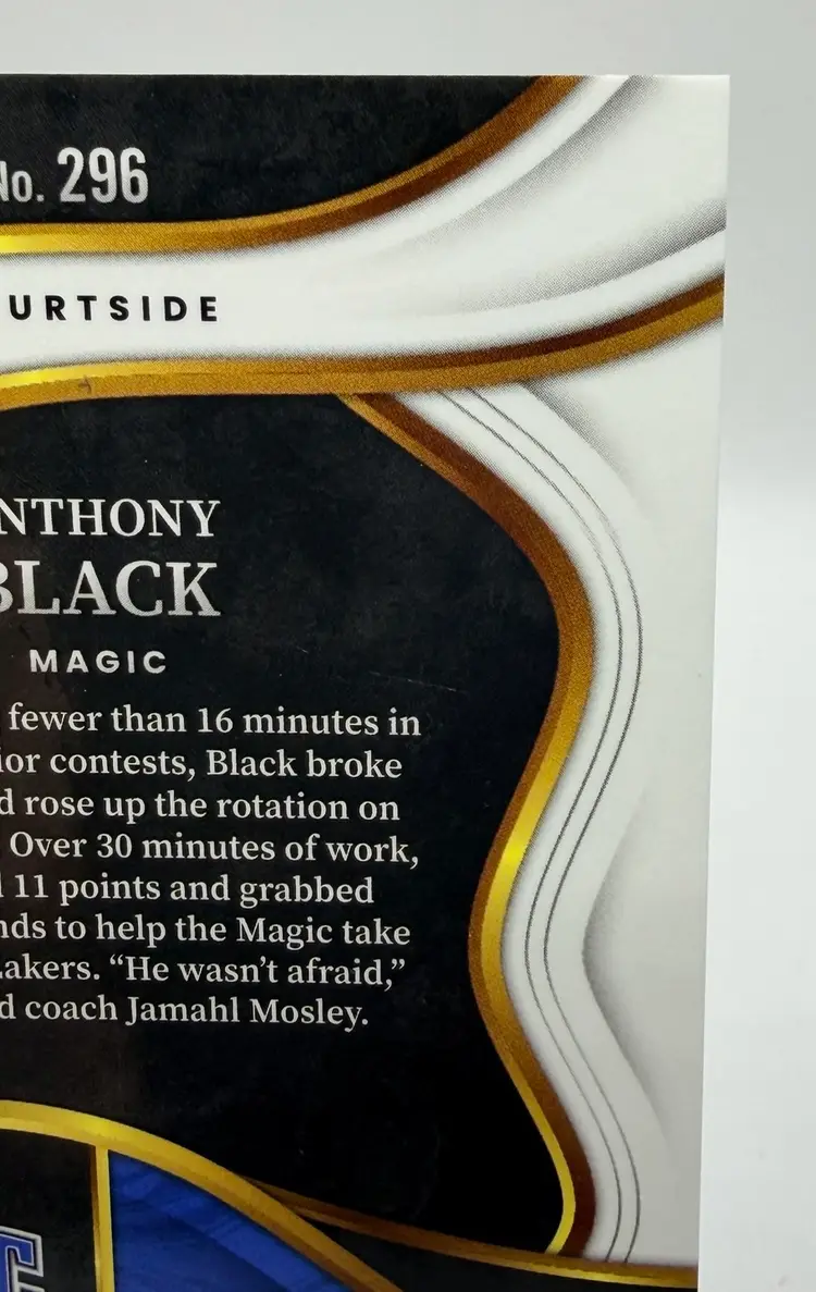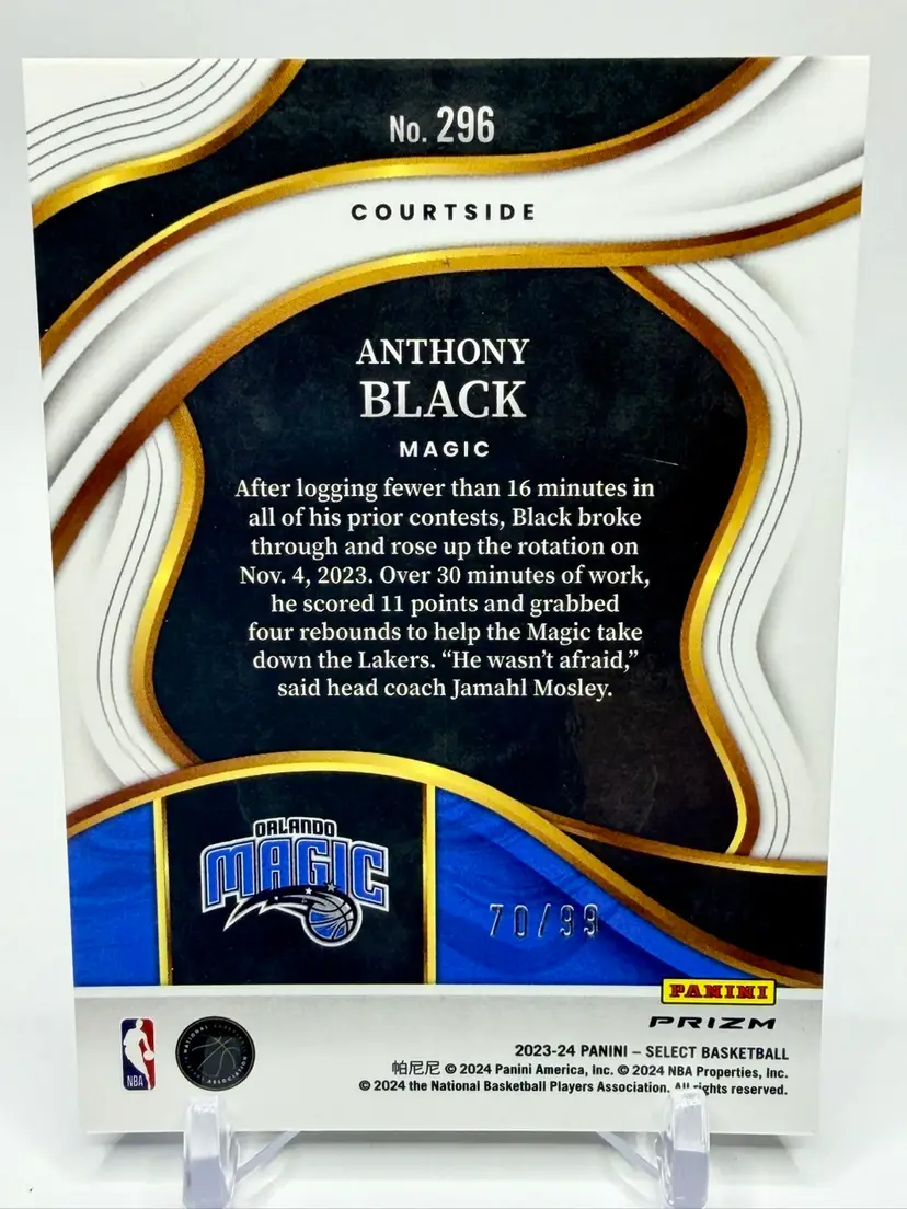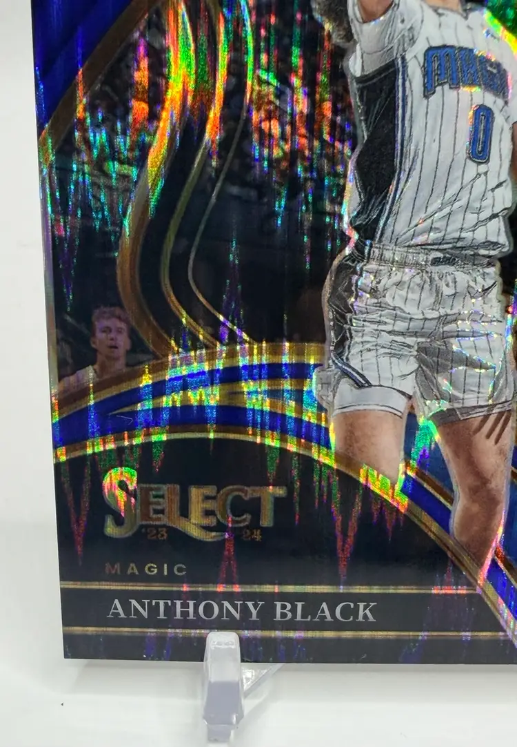 2023-24 Panini Select Courtside #296 Blue Flash Prizm /99 Rookie trading card featuring Anthony Black from the Orlando Magic in the National Basketball Association (NBA). This original sports trading card is part of the Panini Select set and is serial numbered, making it a rare and collectible item for basketball fans and card enthusiasts. Please review the photos carefully to assess the condition of the cards. We do our best to provide clear, detailed images, especially for cards with noticeable flaws. Please note that some raw cards may show light wear, so we encourage close inspection. Cards will be shipped securely. Thank you for checking out our store and for your support! I'm on Instagram as @915_rookie_rush_trading_cards.