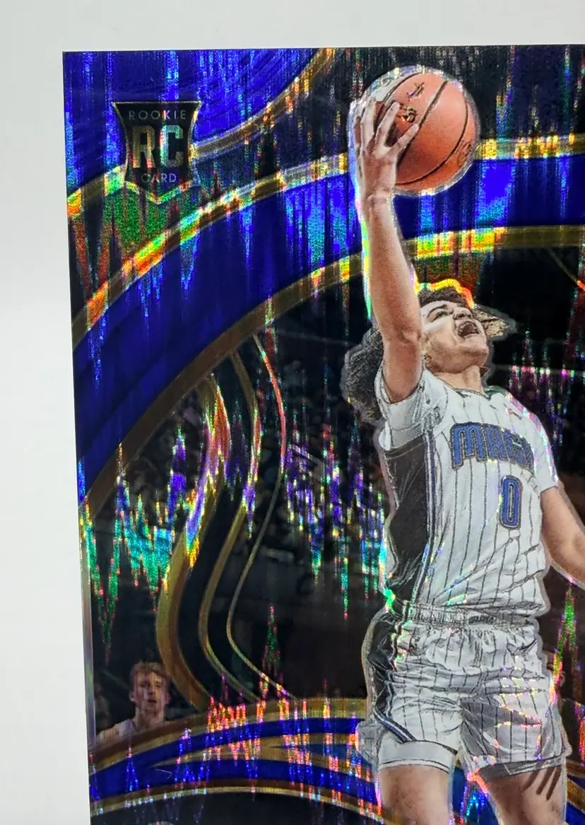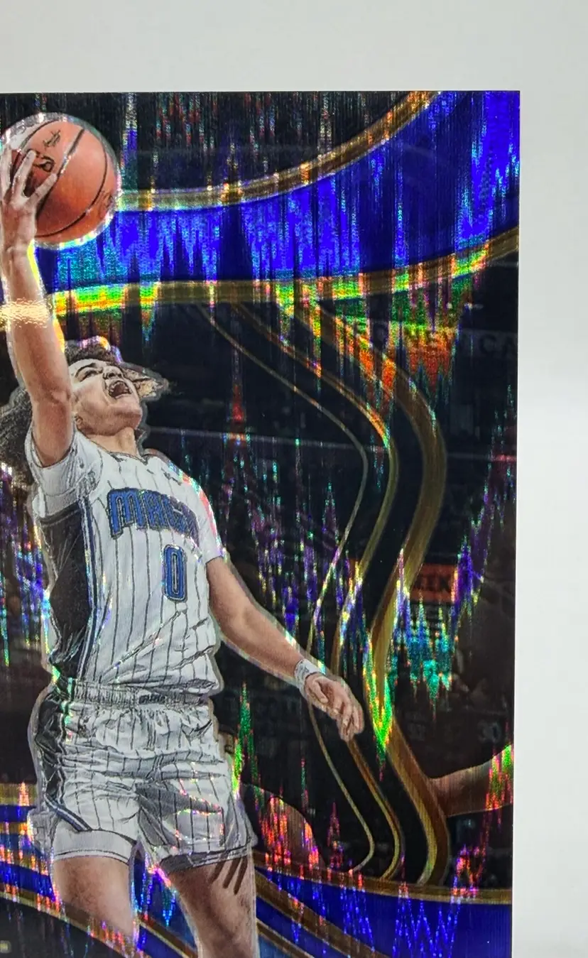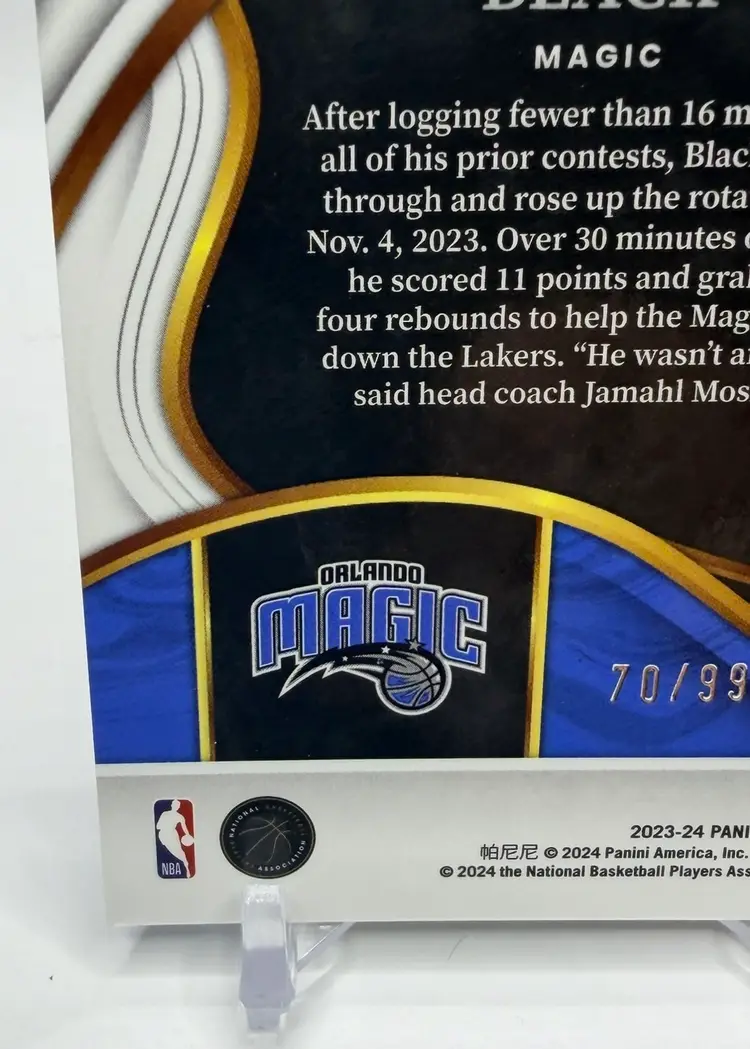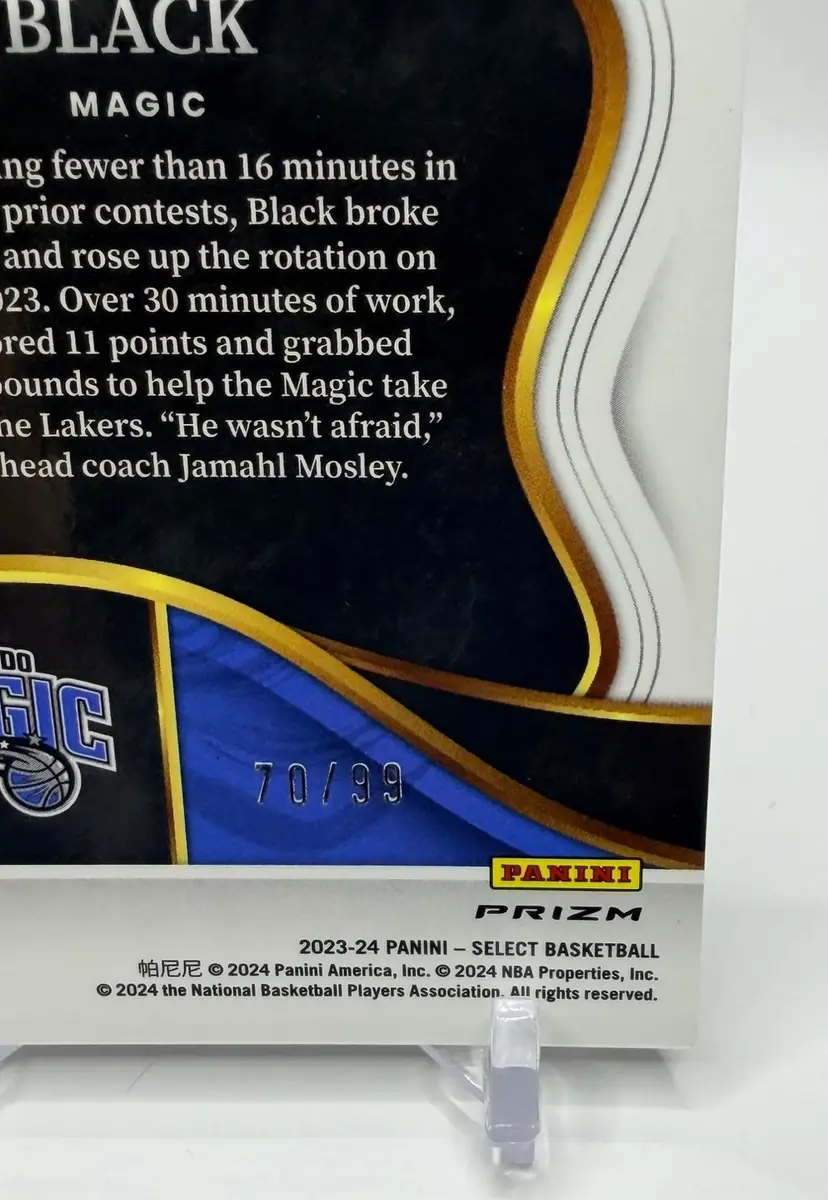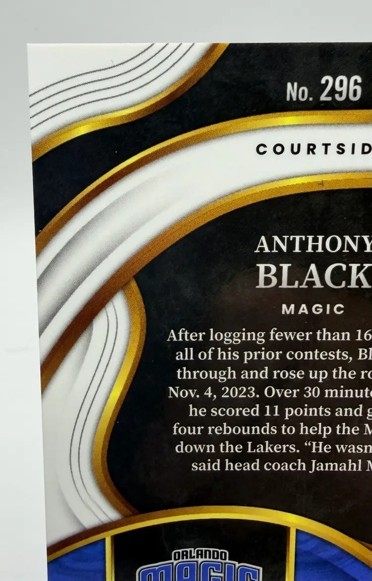 2023-24 Panini Select Courtside #296 Blue Flash Prizm /99 Rookie trading card featuring Anthony Black from the Orlando Magic in the National Basketball Association (NBA). This original sports trading card is part of the Panini Select set and is serial numbered, making it a rare and collectible item for basketball fans and card enthusiasts. Please review the photos carefully to assess the condition of the cards. We do our best to provide clear, detailed images, especially for cards with noticeable flaws. Please note that some raw cards may show light wear, so we encourage close inspection. Cards will be shipped securely. Thank you for checking out our store and for your support! I'm on Instagram as @915_rookie_rush_trading_cards.