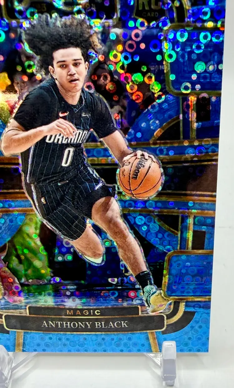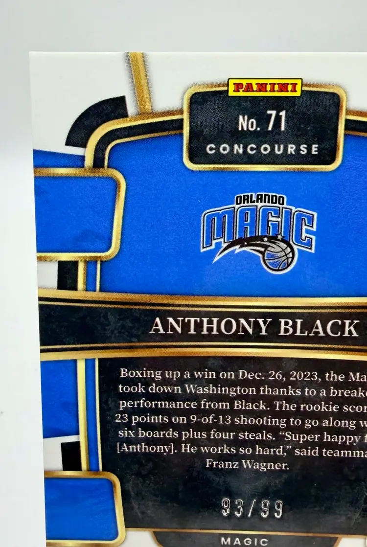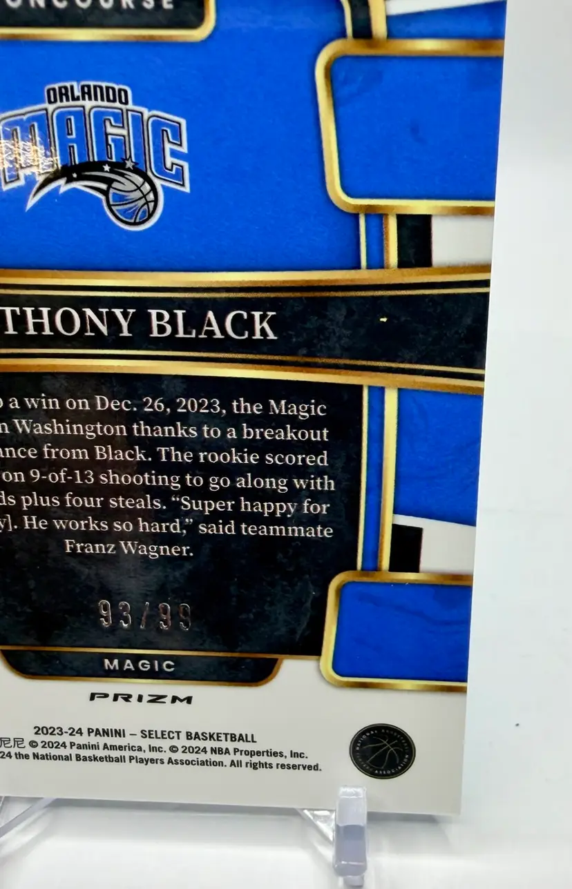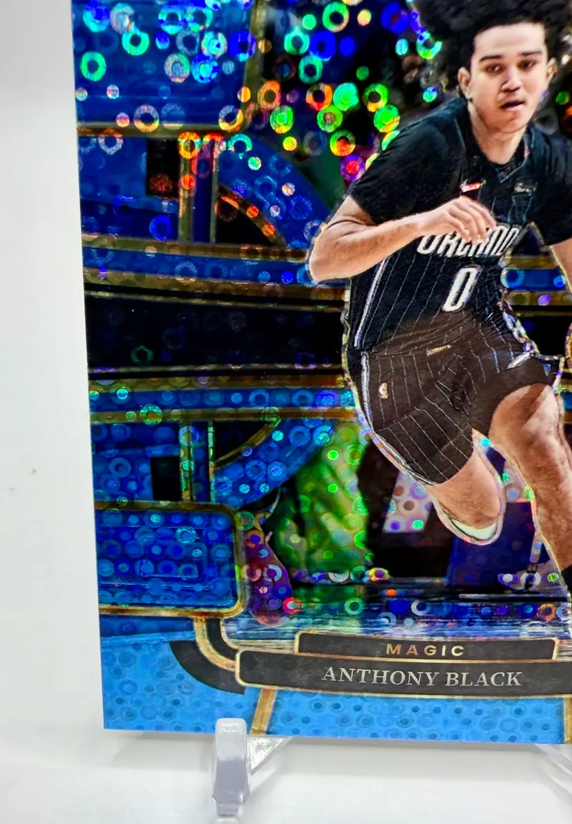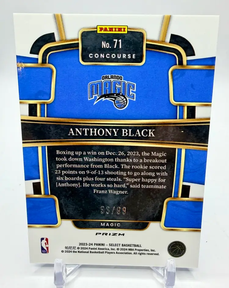2023-24 Select Concourse Rookie Light Blue Disco trading card featuring Anthony Black of the Orlando Magic in the National Basketball Association (NBA). This limited edition card has a print run of 99 and is an original release by the manufacturer, Select. The card is serial numbered and part of the Blue Disco parallel variety, making it a sought-after collectible for basketball fans and card enthusiasts alike.