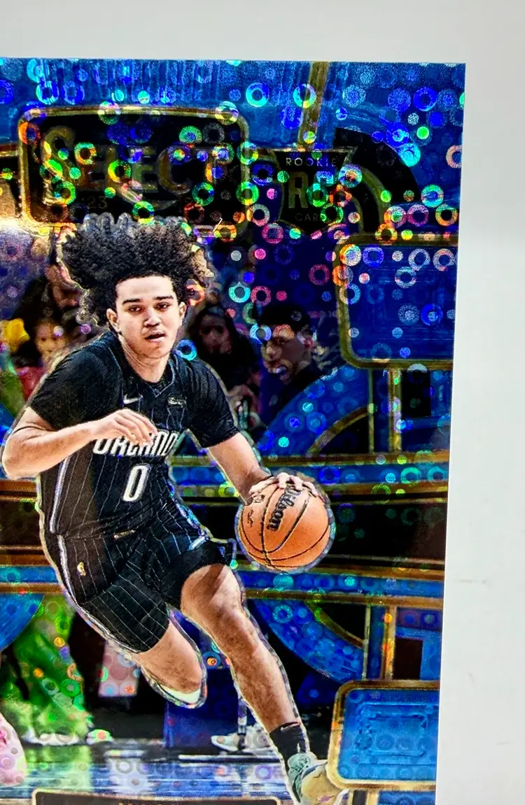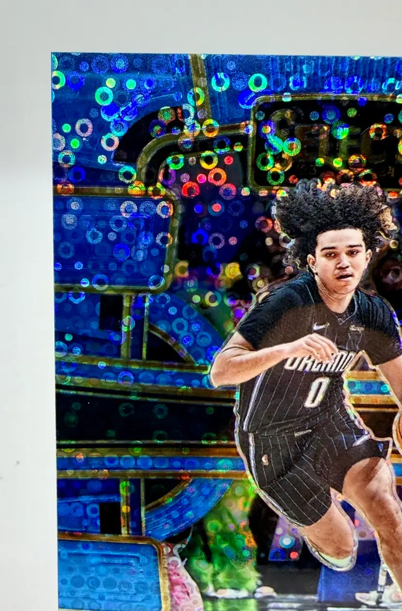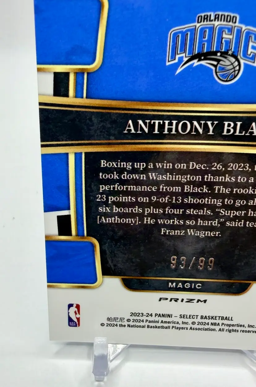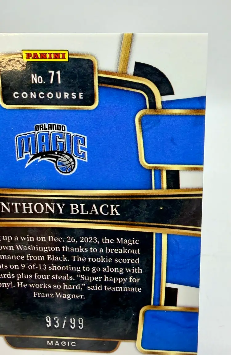 2023-24 Select Concourse Rookie Light Blue Disco trading card featuring Anthony Black of the Orlando Magic in the National Basketball Association (NBA). This limited edition card has a print run of 99 and is an original release by the manufacturer, Select. The card is serial numbered and part of the Blue Disco parallel variety, making it a sought-after collectible for basketball fans and card enthusiasts alike.