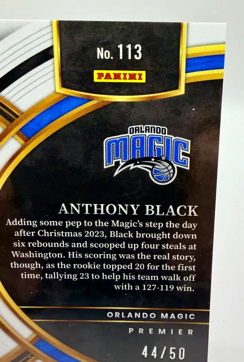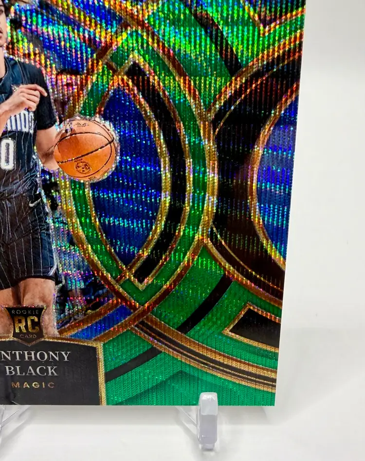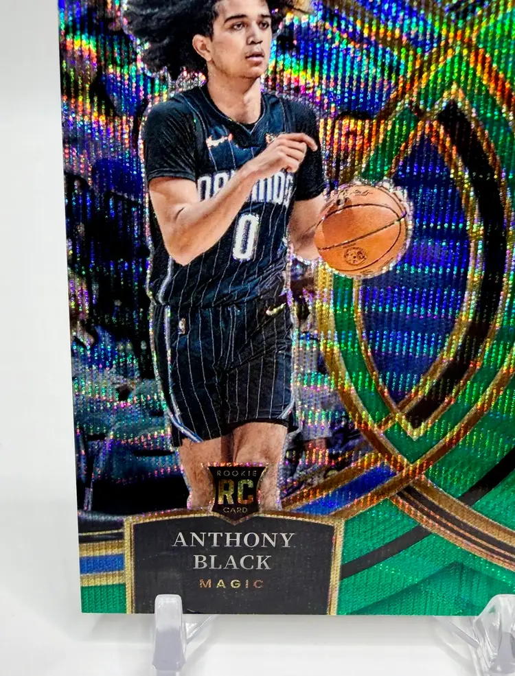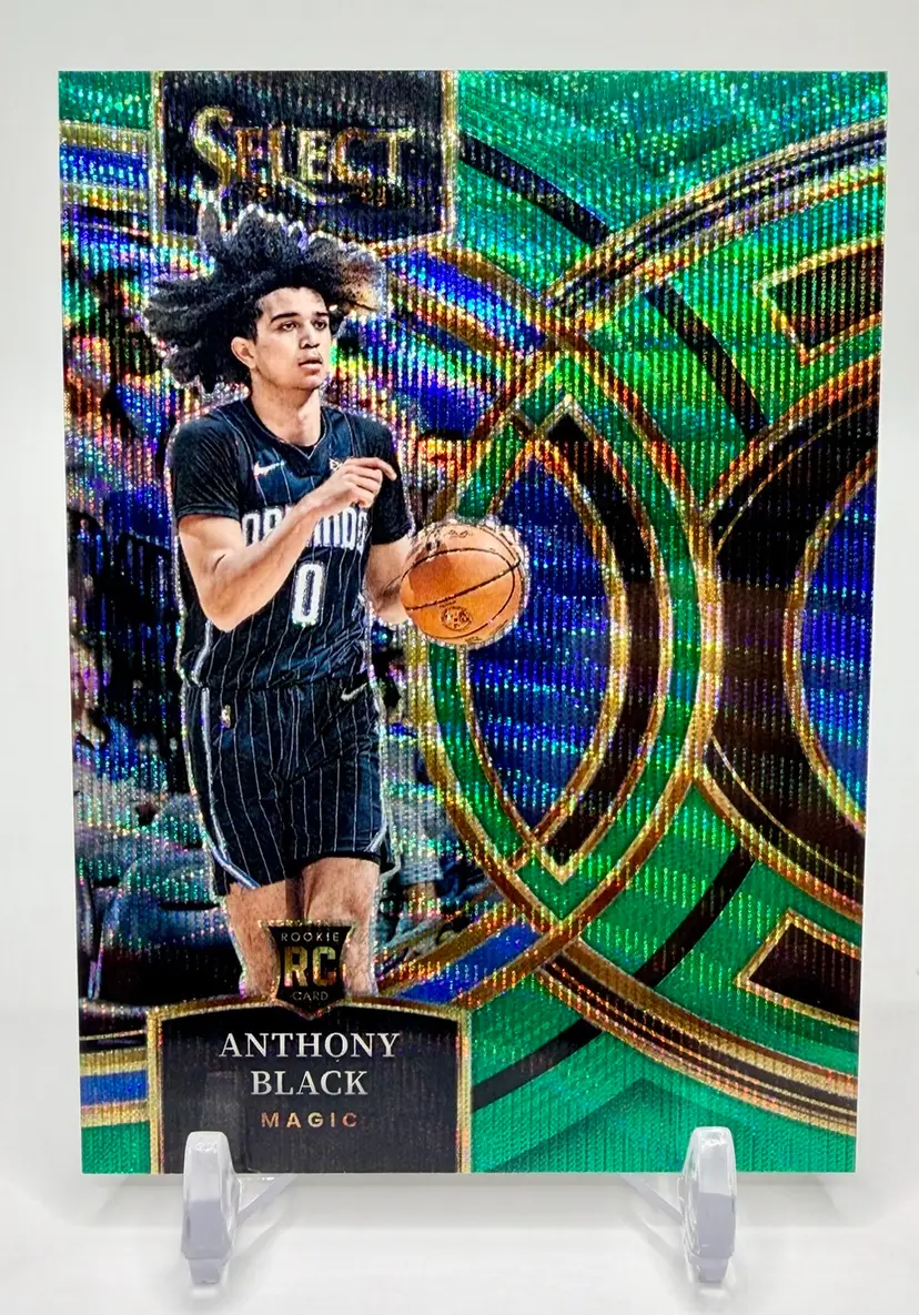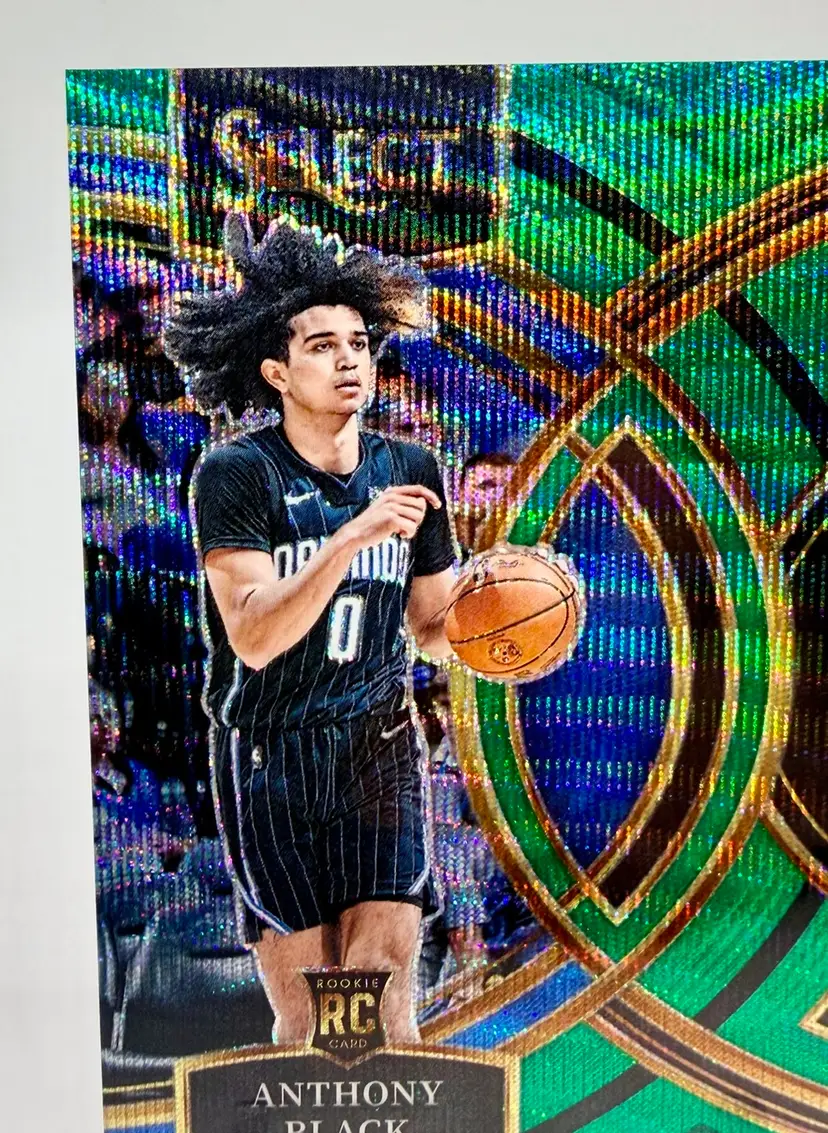 Anthony Black 2023-24 Select Premier Level Rookie Green Wave Prizm card is a limited edition sports trading card featuring the basketball player Anthony Black from the Orlando Magic. This original card is serial numbered out of 50 and part of the 2023-24 Panini Select set, with a parallel variety in Green Wave Prizm Please review the photos carefully to assess the condition of the cards. We do our best to provide clear, detailed images, especially for cards with noticeable flaws. Please note that some raw cards may show light wear, so we encourage close inspection. Cards will be shipped securely.