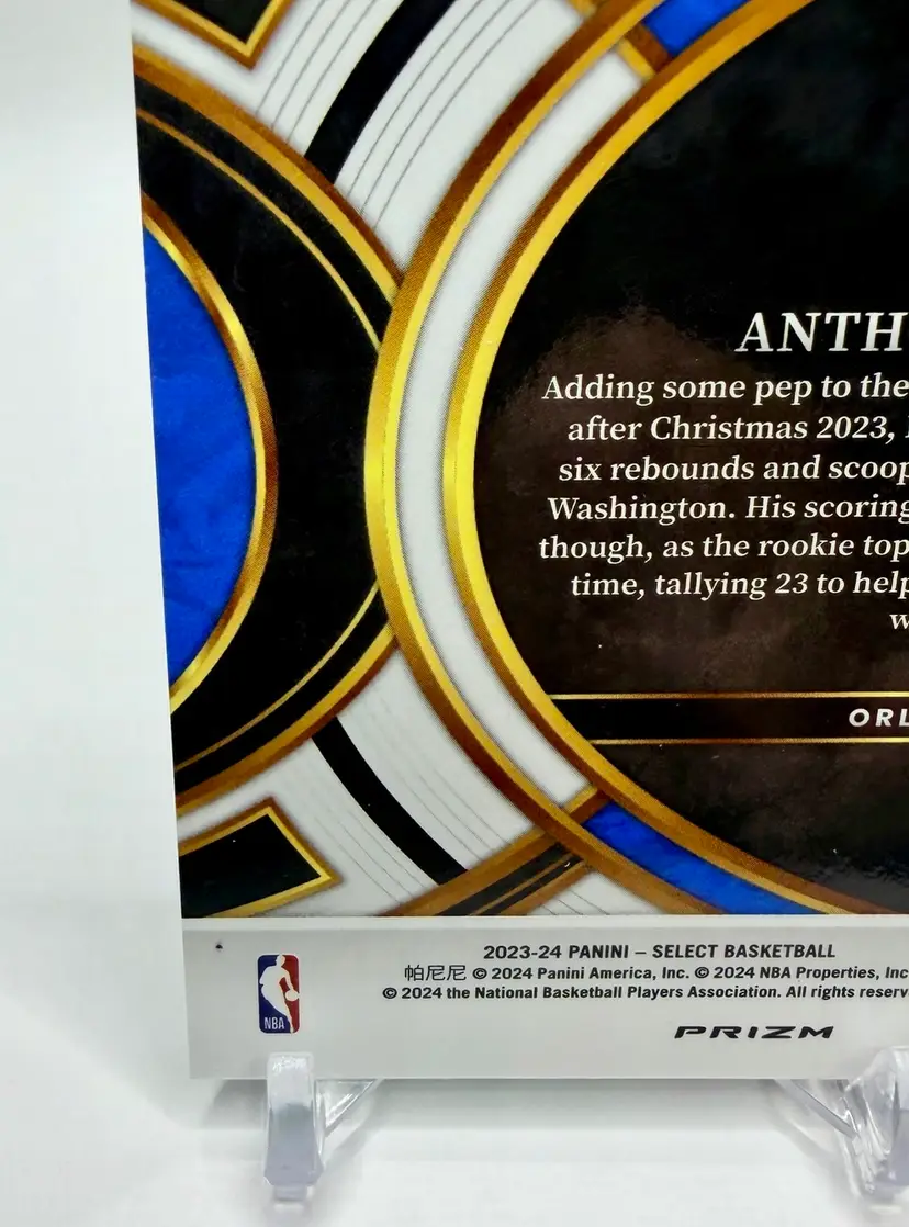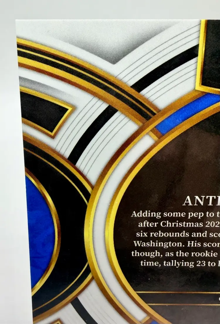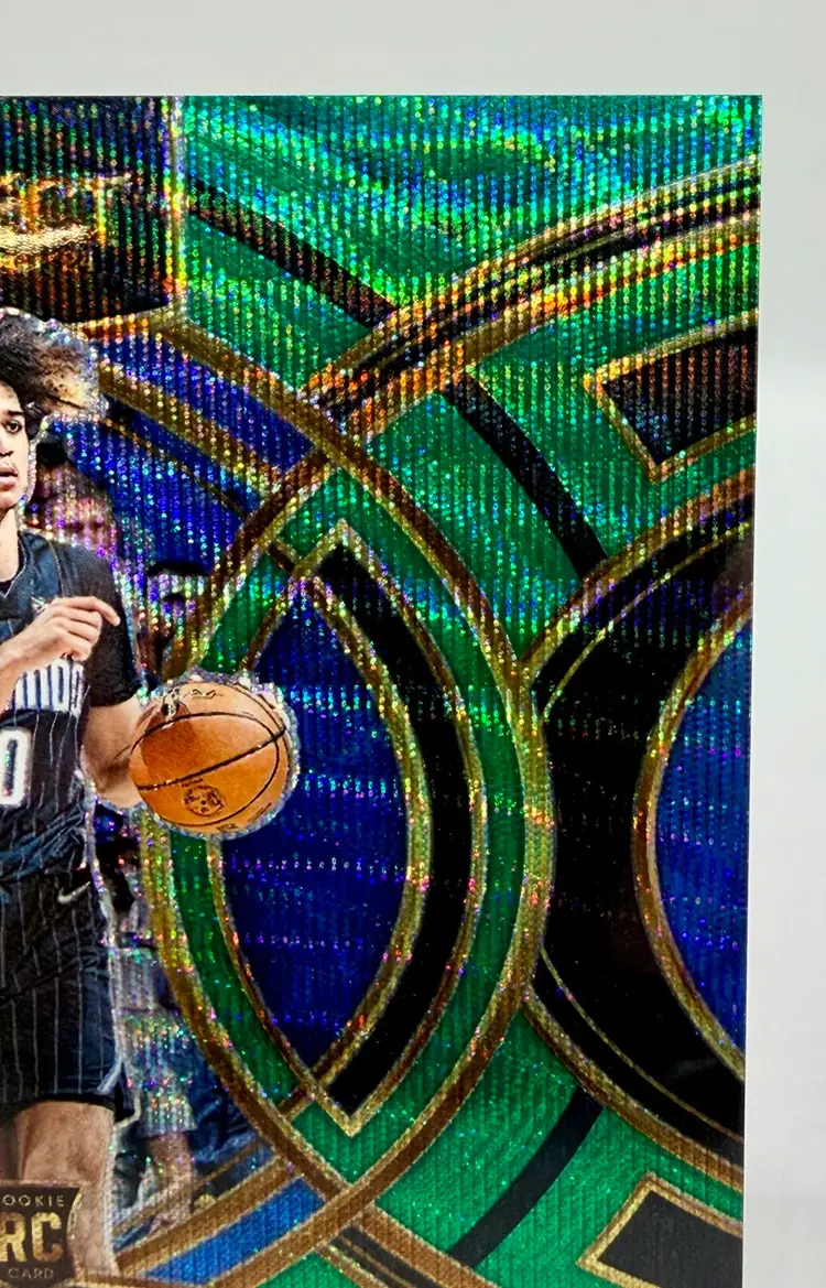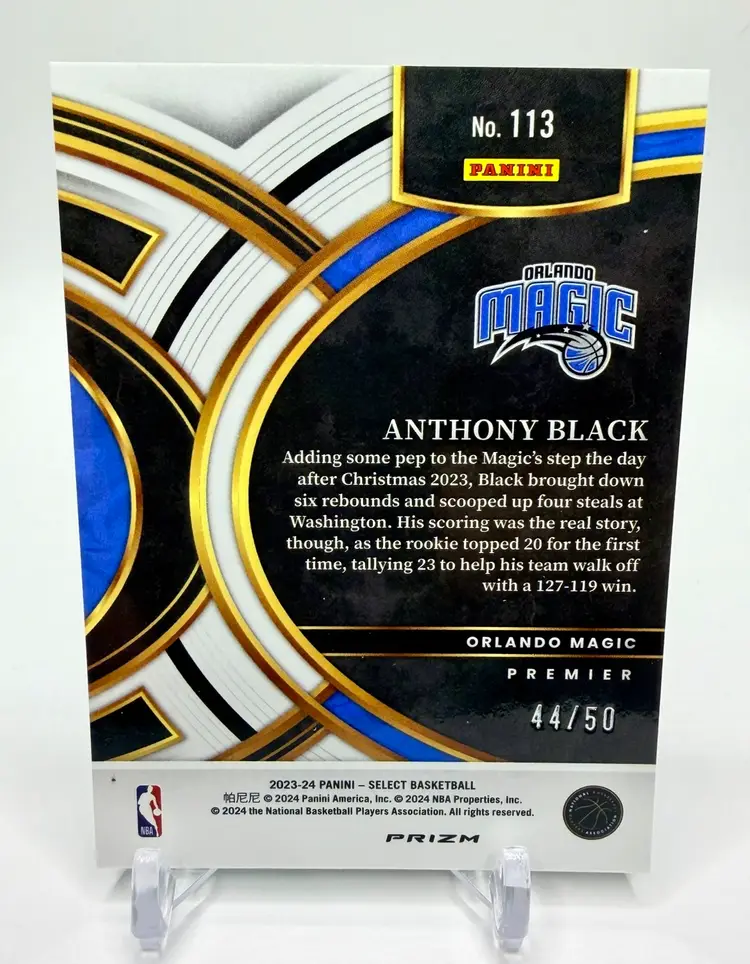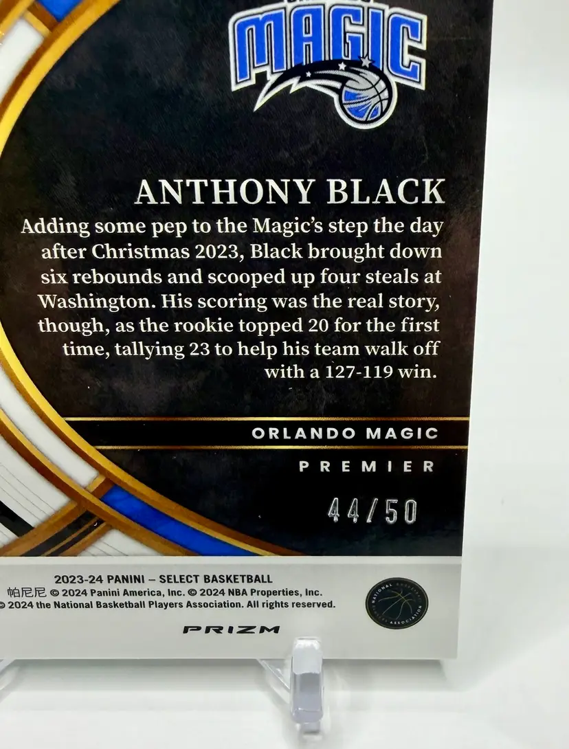 Anthony Black 2023-24 Select Premier Level Rookie Green Wave Prizm card is a limited edition sports trading card featuring the basketball player Anthony Black from the Orlando Magic. This original card is serial numbered out of 50 and part of the 2023-24 Panini Select set, with a parallel variety in Green Wave Prizm Please review the photos carefully to assess the condition of the cards. We do our best to provide clear, detailed images, especially for cards with noticeable flaws. Please note that some raw cards may show light wear, so we encourage close inspection. Cards will be shipped securely.