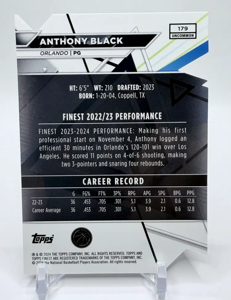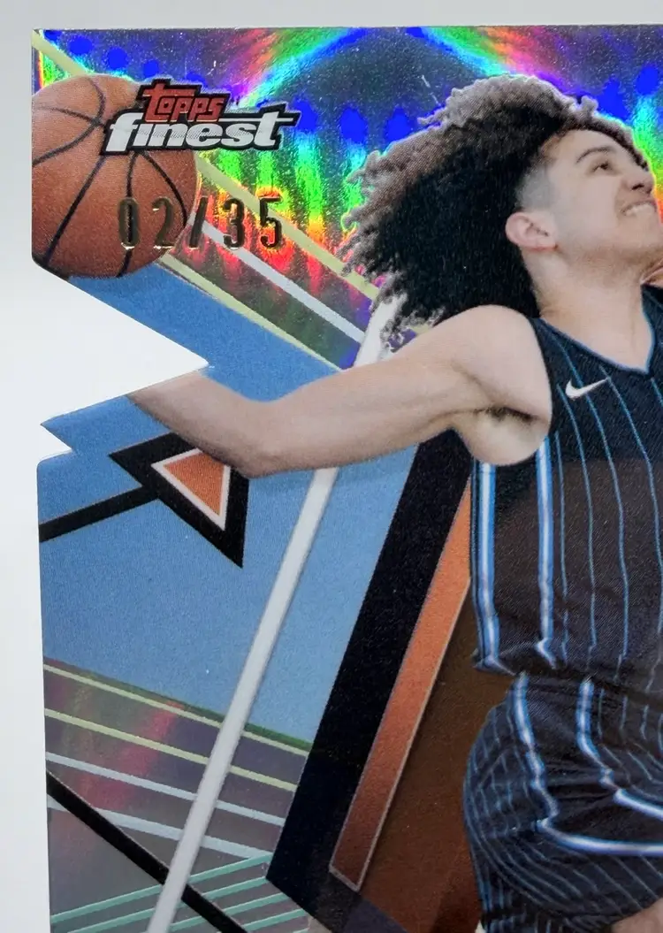 2023-24 Topps Finest trading card featuring Anthony Black of the Orlando Magic. This card is a Die-Cut Refractor /35 rookie card, making it a highly sought-after collectible for fans and collectors of basketball memorabilia. Please review the photos carefully to assess the condition of the cards. We do our best to provide clear, detailed images, especially for cards with noticeable flaws. Please note that some raw cards may show light wear, so we encourage close inspection. Cards will be shipped securely. Thank you for checking out our store and for your support! I'm on Instagram as @915_rookie_rush_trading_cards.