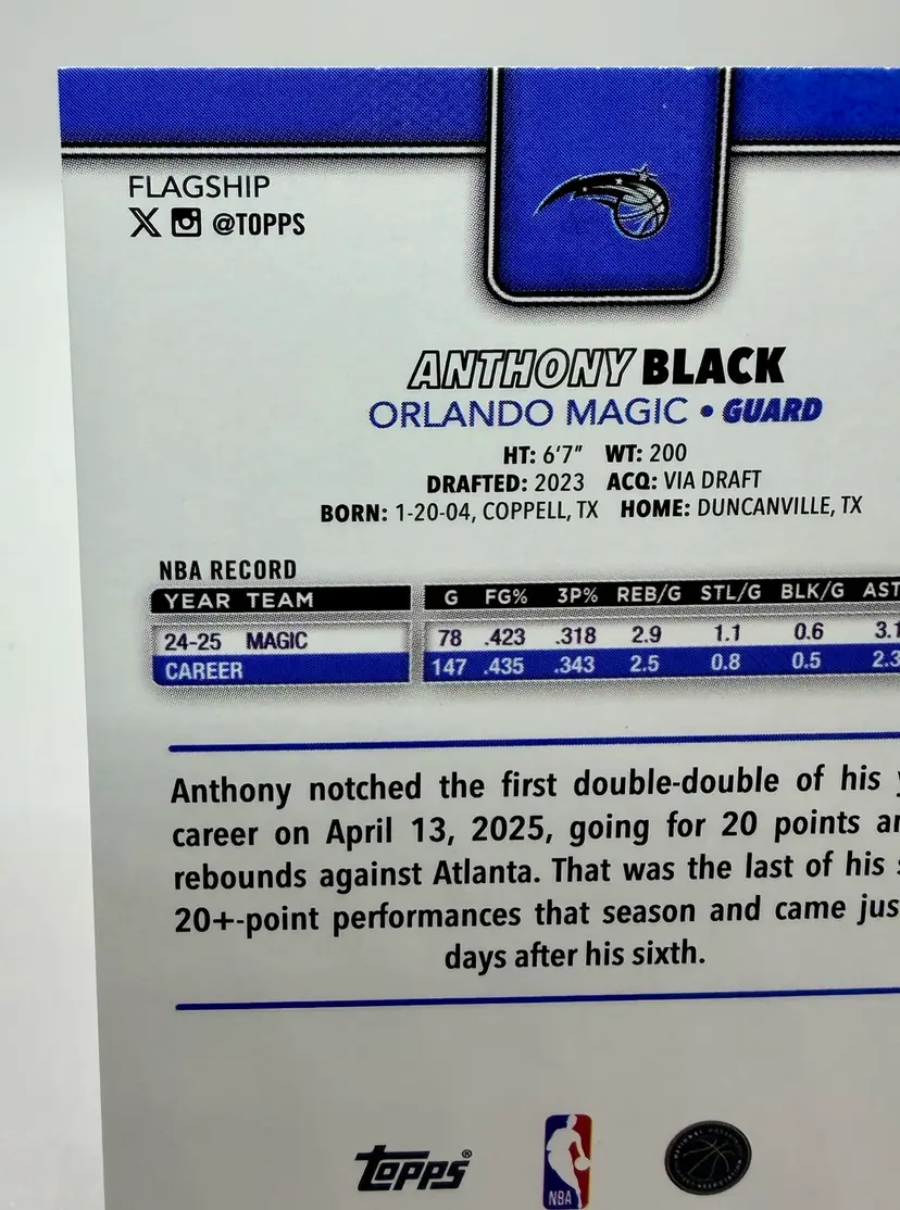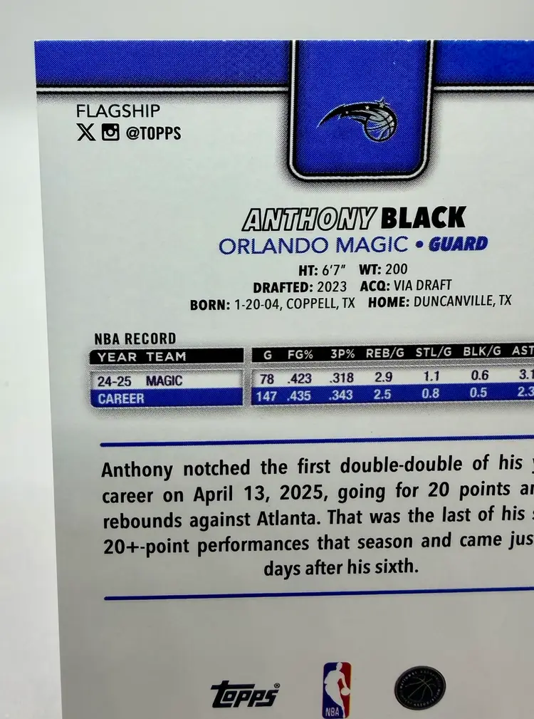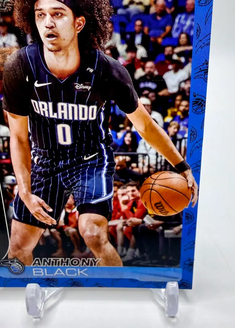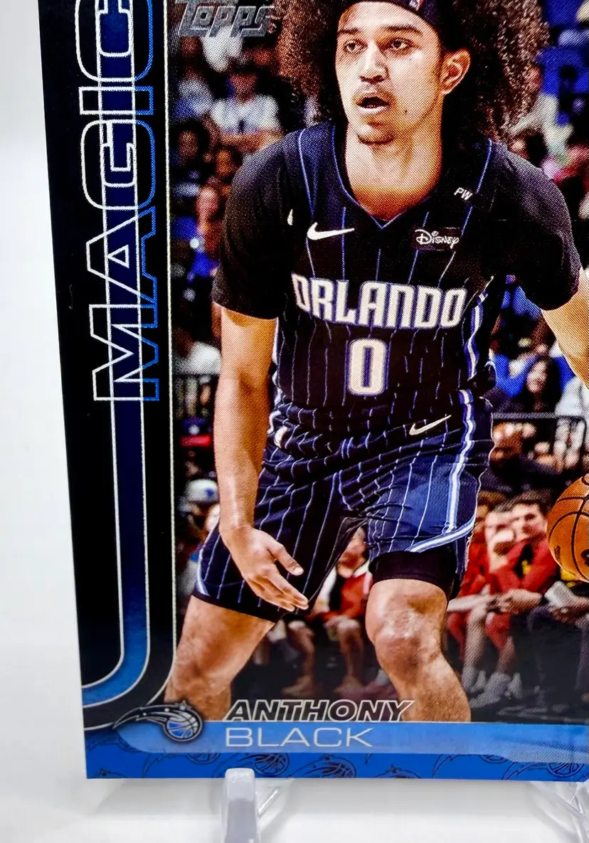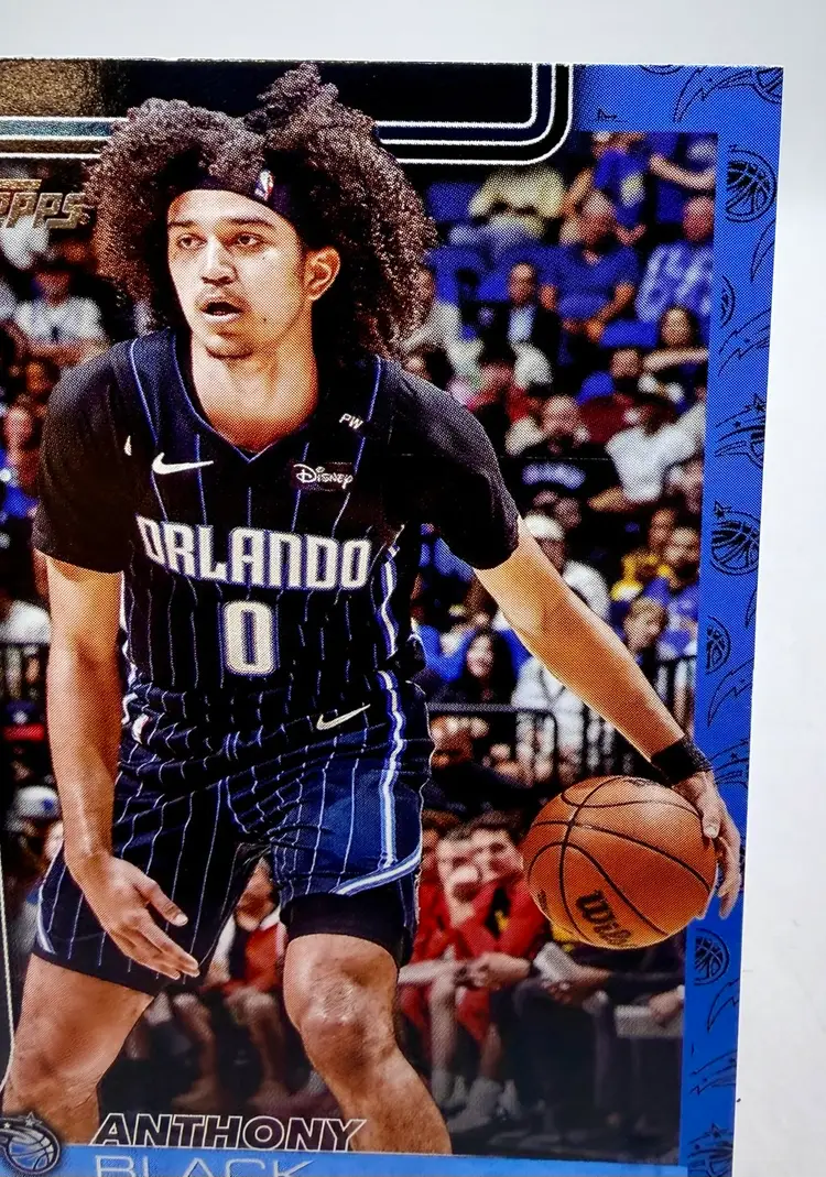 2025-26 Topps basketball trading card featuring Anthony Black from the Orlando Magic. This specific card is a special Team Color Border variation, making it a valuable addition to any sports trading card collection. Please check the pictures for the condition the cards. We do our best to provide clear images, especially for any cards with noticeable flaws. Some raw cards may show wear, so take a close look. Cards will be shipped securely.