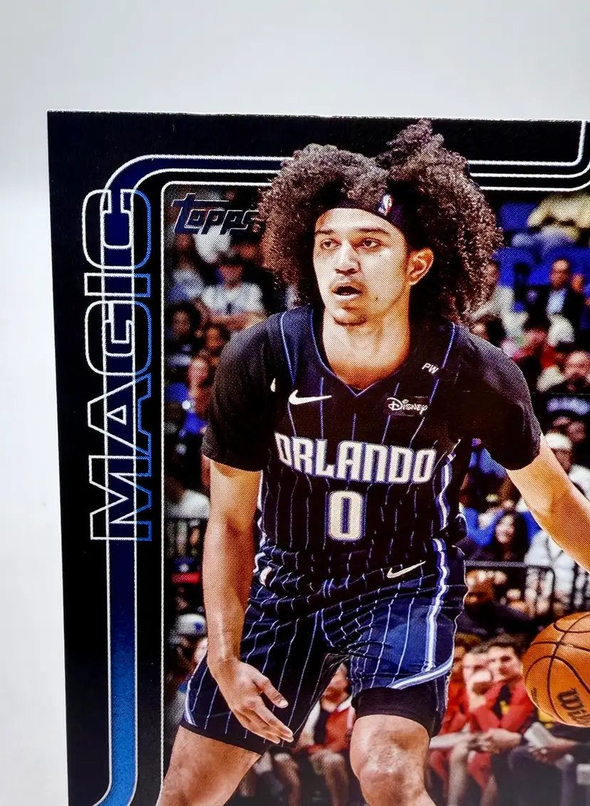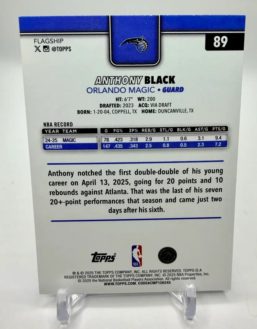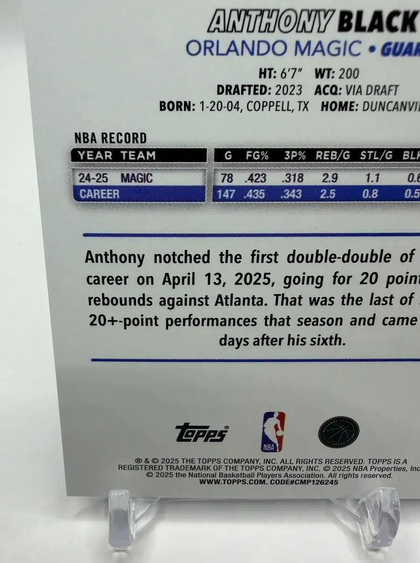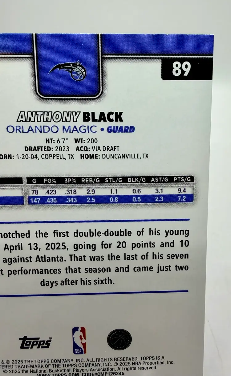 2025-26 Topps basketball trading card featuring Anthony Black from the Orlando Magic. This specific card is a special Team Color Border variation, making it a valuable addition to any sports trading card collection. Please check the pictures for the condition the cards. We do our best to provide clear images, especially for any cards with noticeable flaws. Some raw cards may show wear, so take a close look. Cards will be shipped securely.