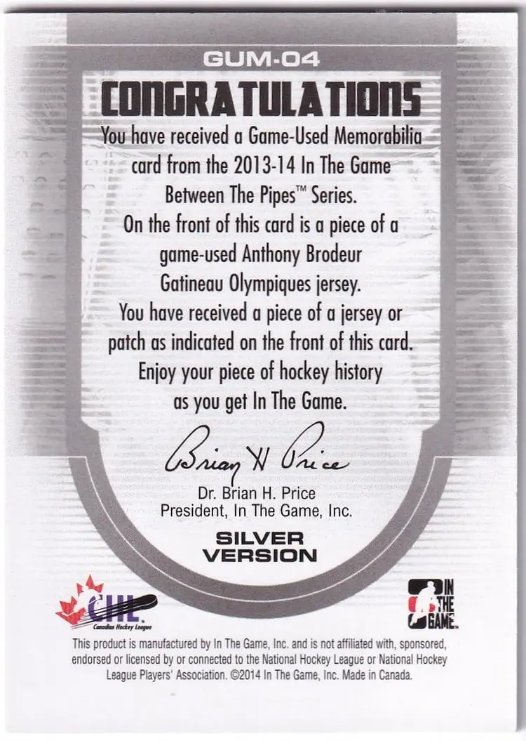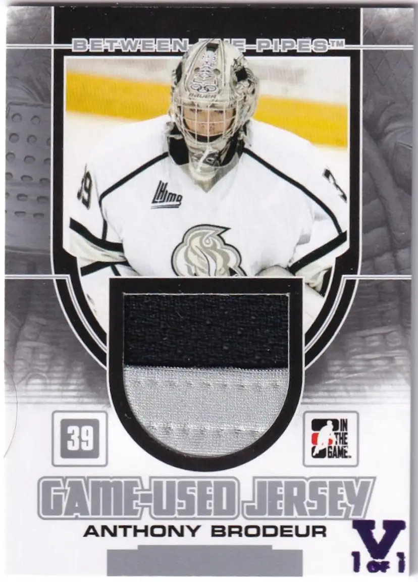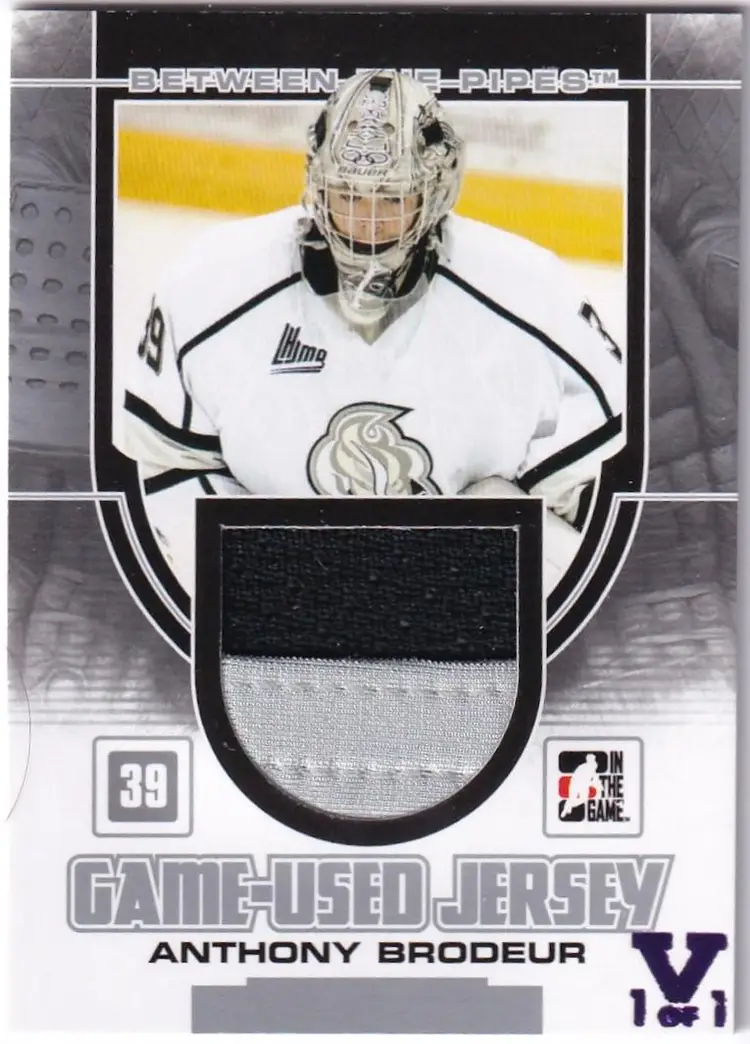 2013-14 Between the Pipes Jerseys Silver #GUM04 Anthony Brodeur ITG Vault Purple 1 of 1