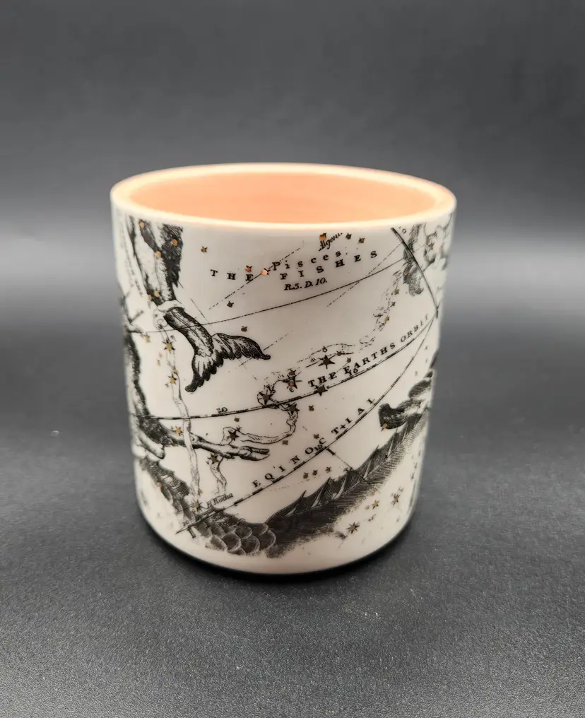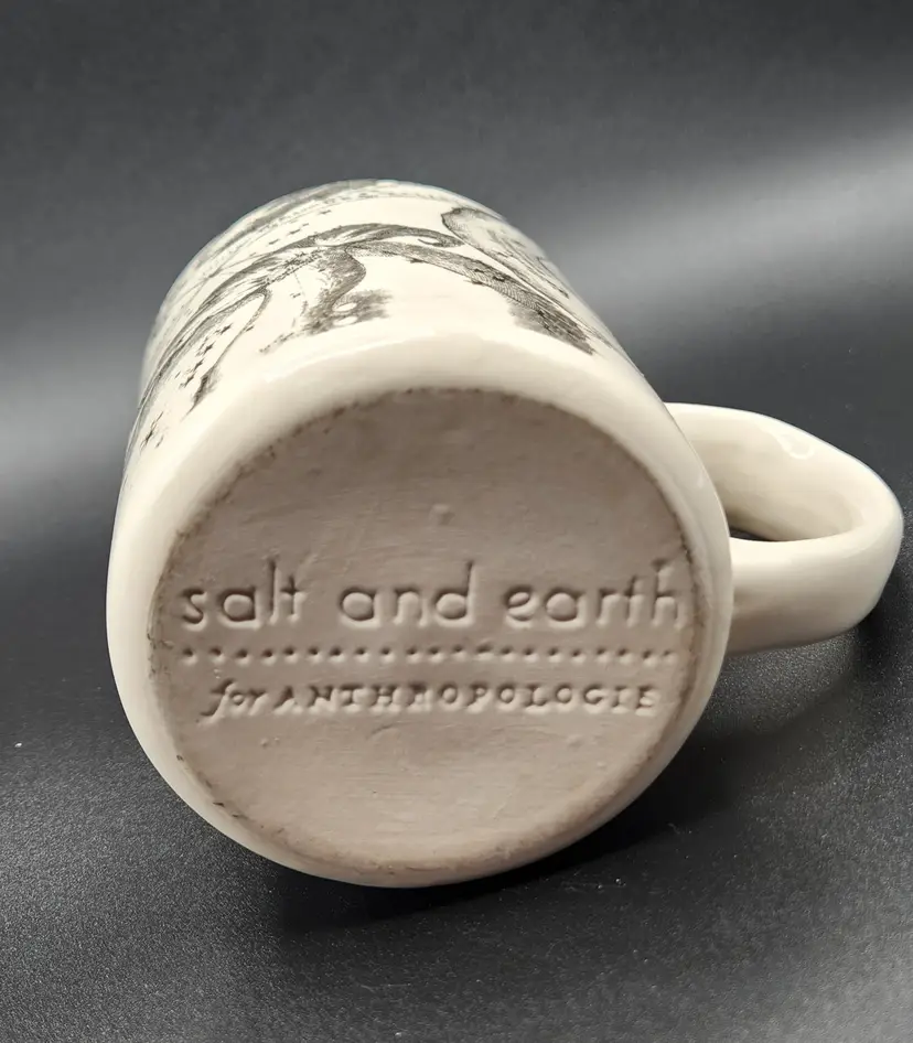 Anthropologie Salt and Earth Aries coffee mug features celestial artwork and gold stars from the collection designed by Malia Landis. 4" tall.