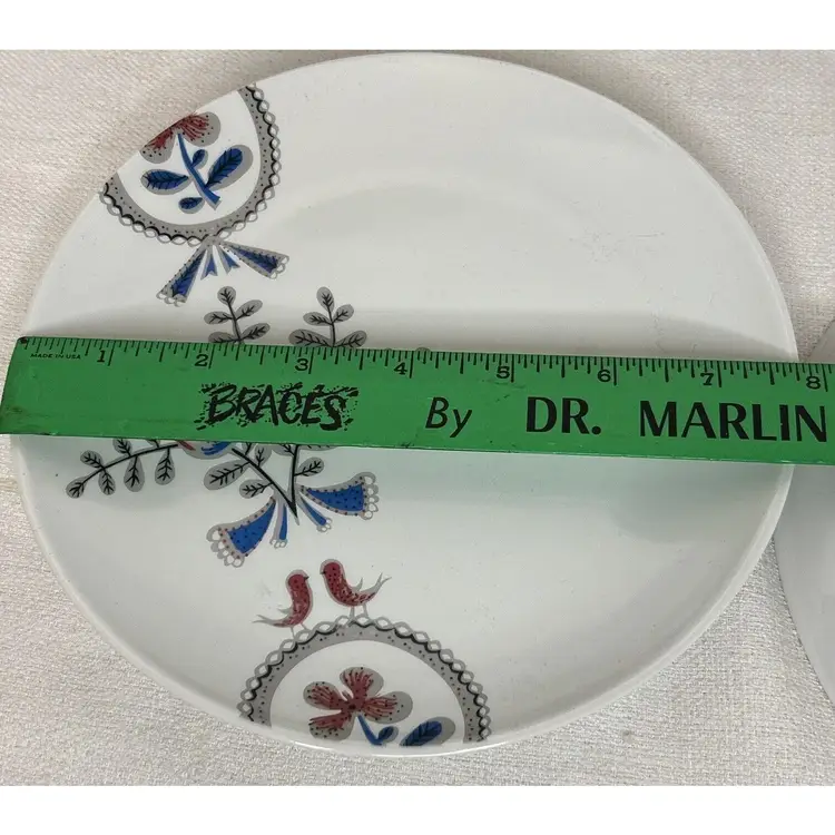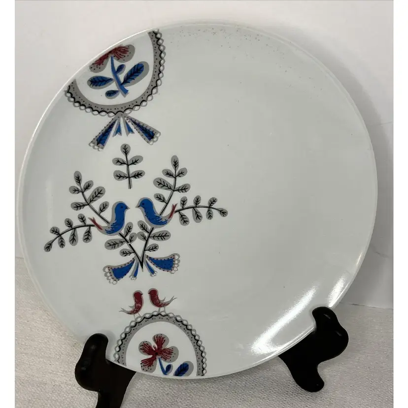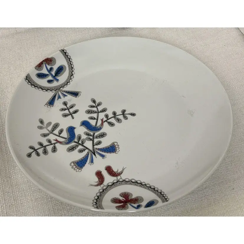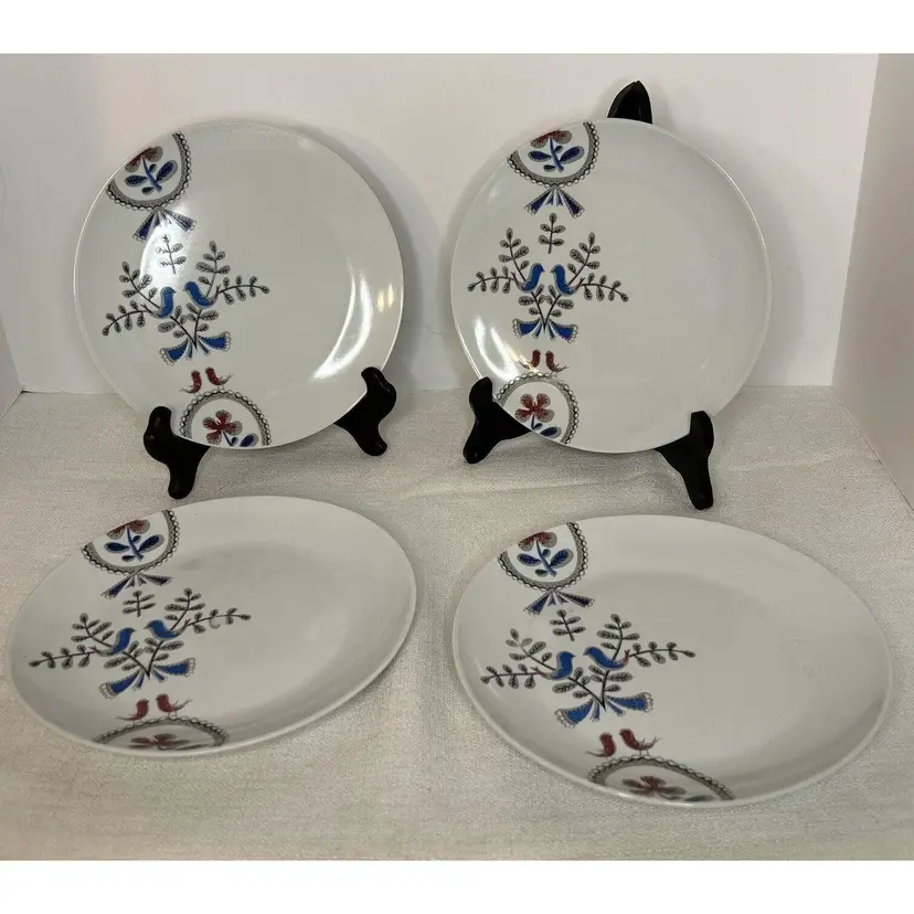 Add a touch of elegance to your dining table with this beautiful four-piece Anthropologie plate set. Each salad or dessert features an intricate mid-century modern design of blue and red love birds on intricate tree branches.. The plates are made of high-quality porcelain and ceramic, ensuring durability and longevity. These eight-inch plates are perfect for serving salads or desserts. They are microwave and dishwasher safe, making them easy to clean and maintain.