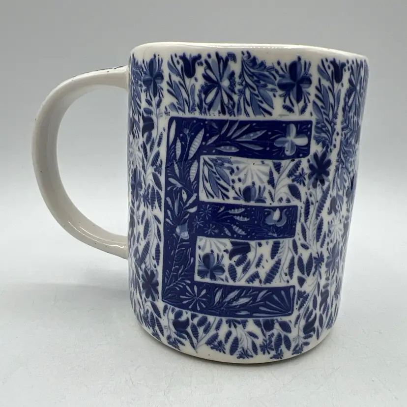 Anthropologie Folksong Monogram Letter E Blue White Stoneware Mug Floral