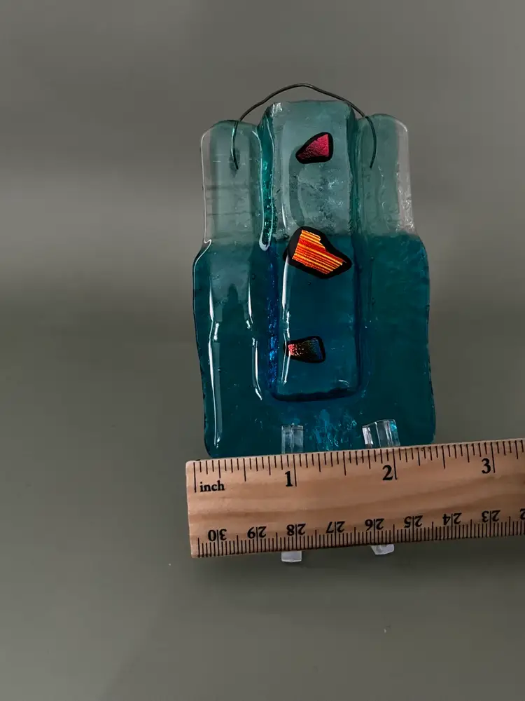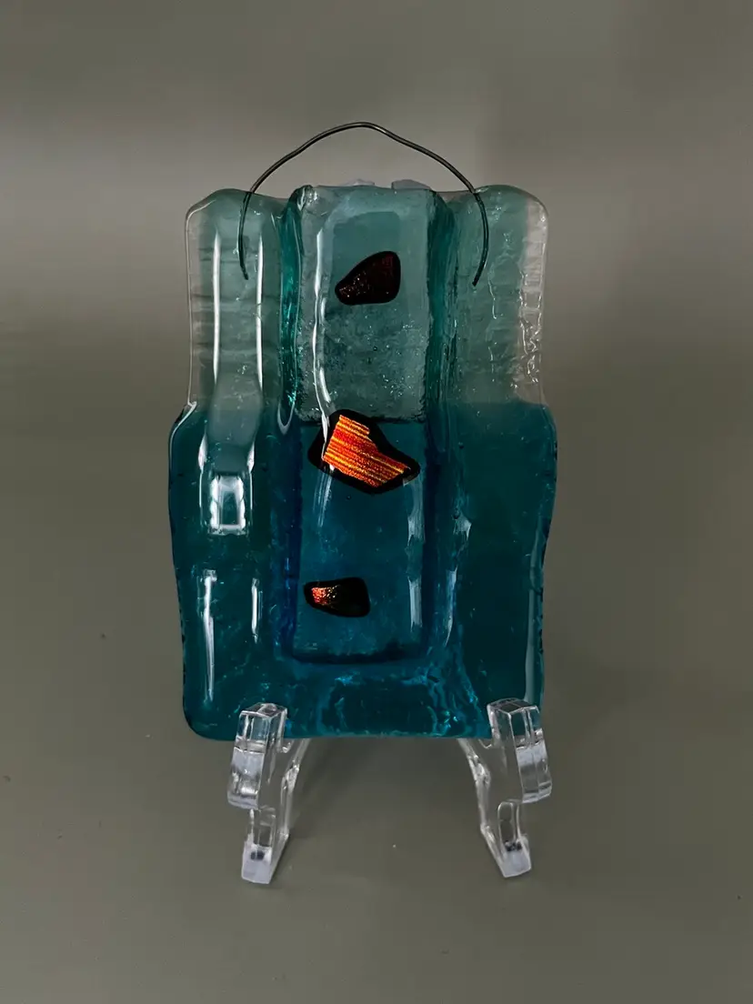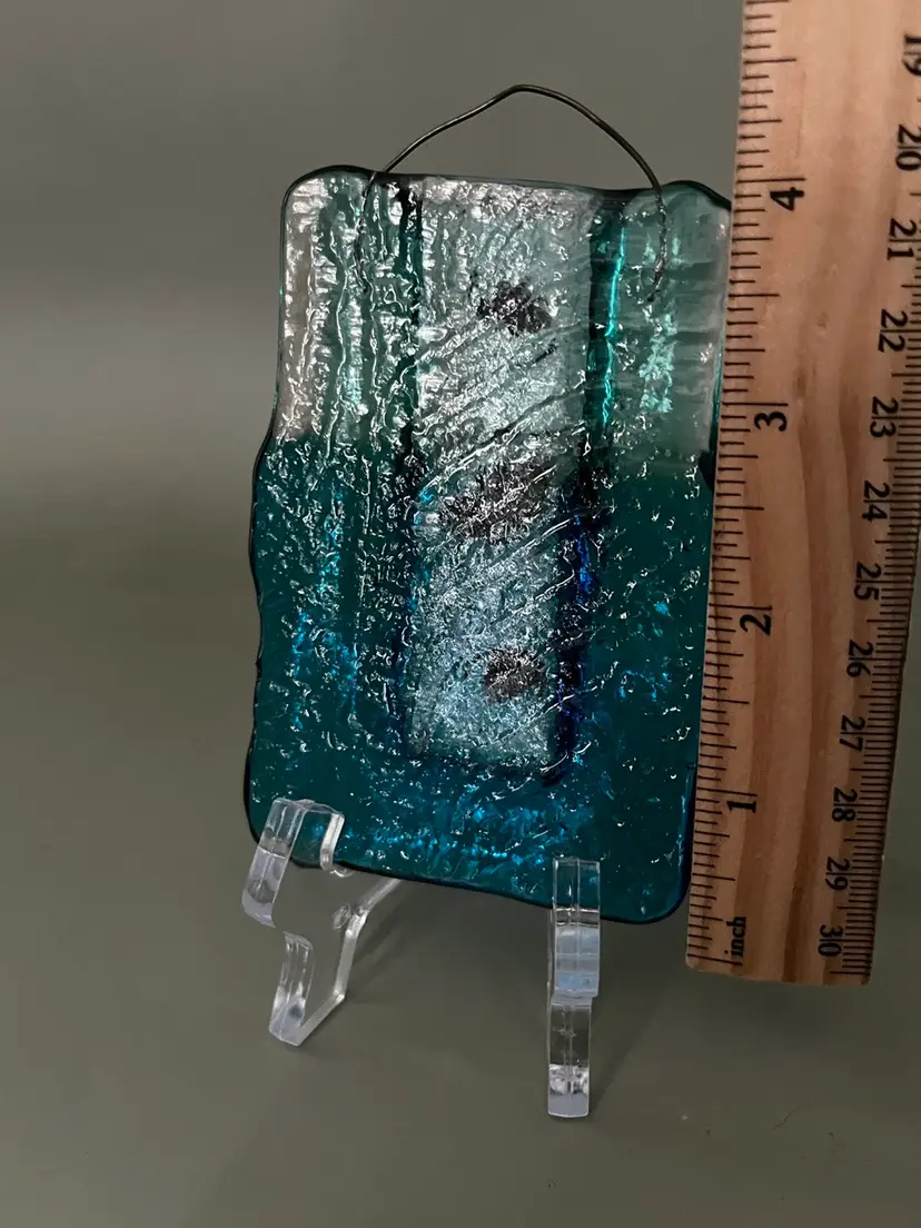 Handmade fused glass wall pocket originally sold by Anthropologie. Features layered teal blue glass with rippled texture and embedded dichroic glass accents that shimmer with rainbow tones in the light. Comes with original wire hanger for easy wall or window display. A great modern coastal or boho décor accent for small spaces, gallery walls, or sunlit windows.