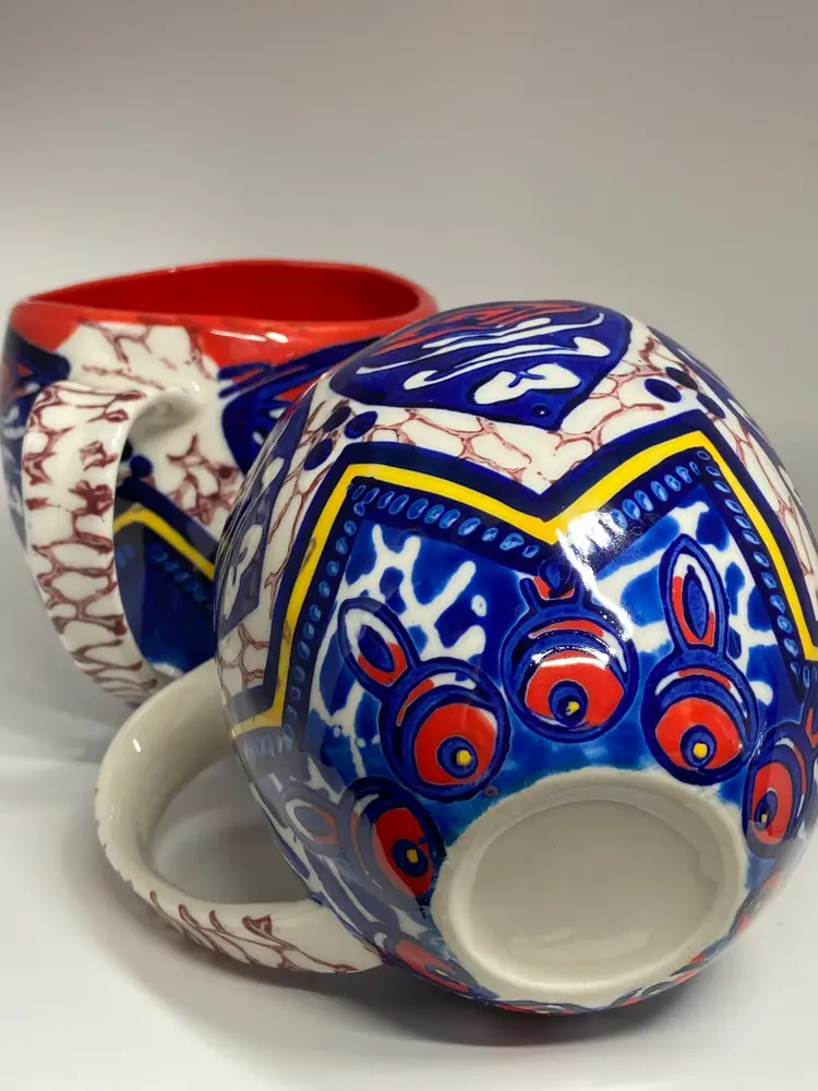 Anthropologie Habari Aztec Printed Ceramic Glossy Coffee Meg in Red, White & Blue