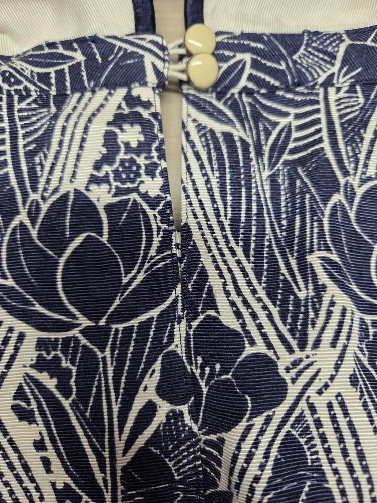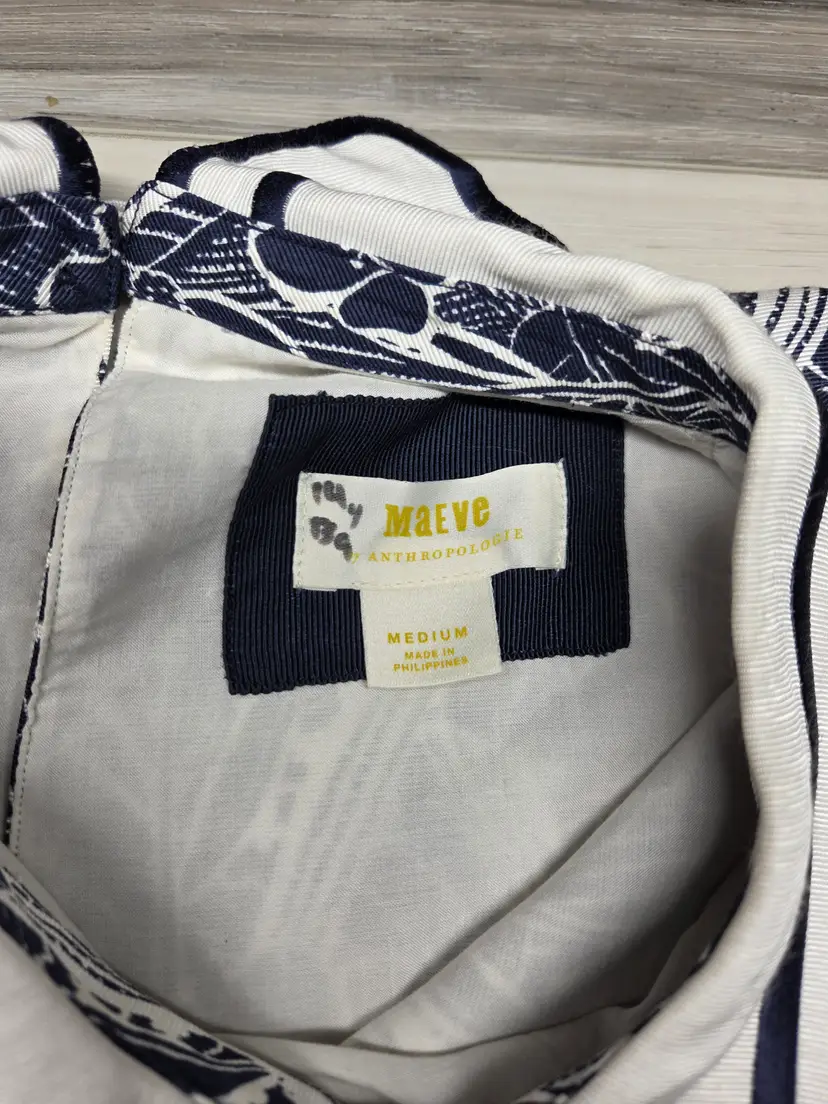 The Anthropologie Maeve Lattice Floral Shift Dress in Blue & White Lotus Flower design is a stylish and versatile option for casual occasions. This sleeveless dress features a collared neckline and button closure, with a knee-length hemline. Made of viscose material, it is perfect for a medium-sized woman looking for a comfortable and chic outfit. The blue and white floral pattern adds a touch of femininity to the shift style, making it a lovely choice for any woman's wardrobe