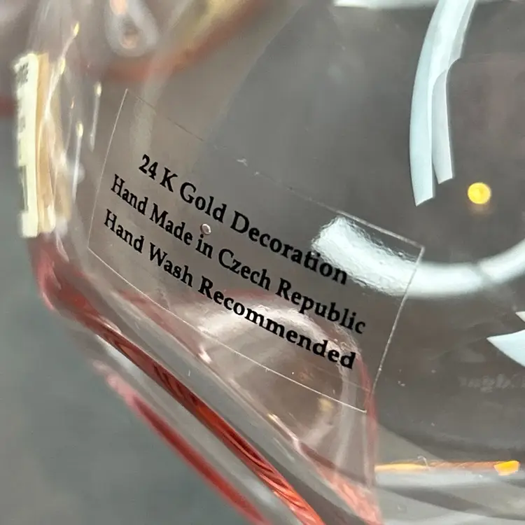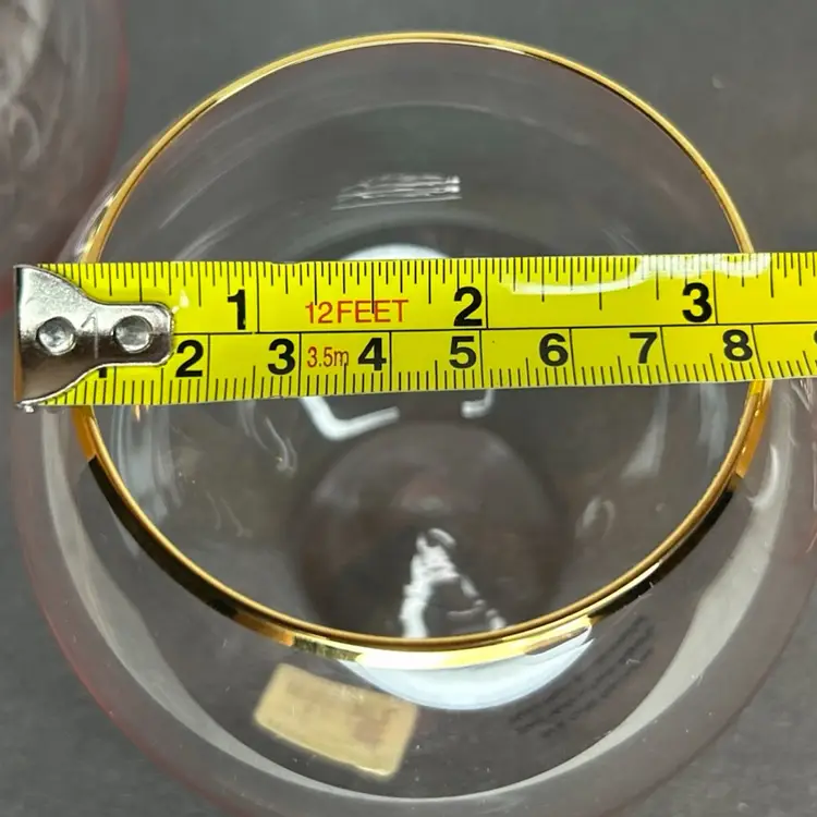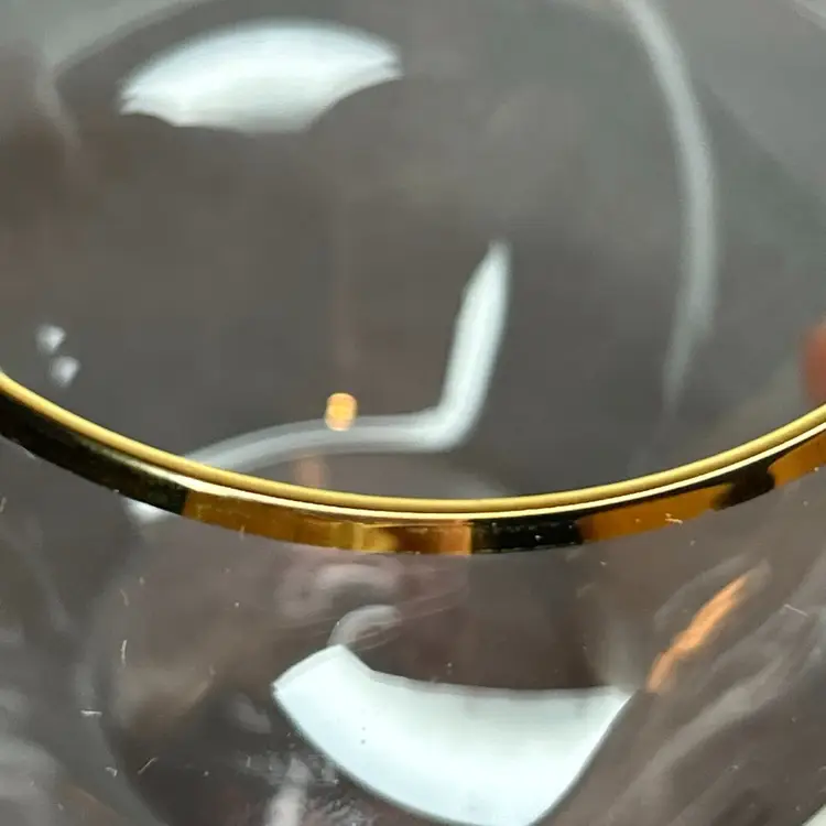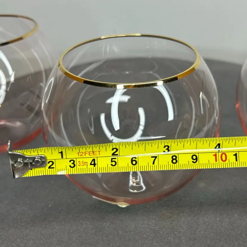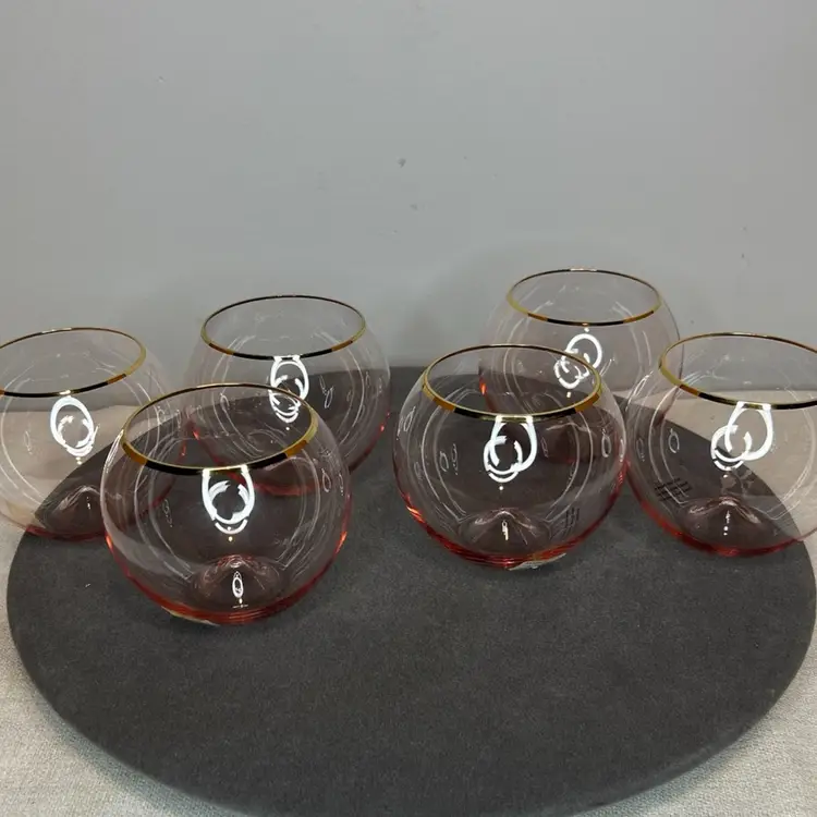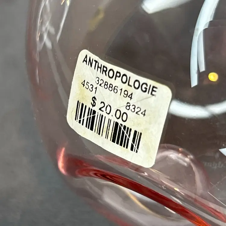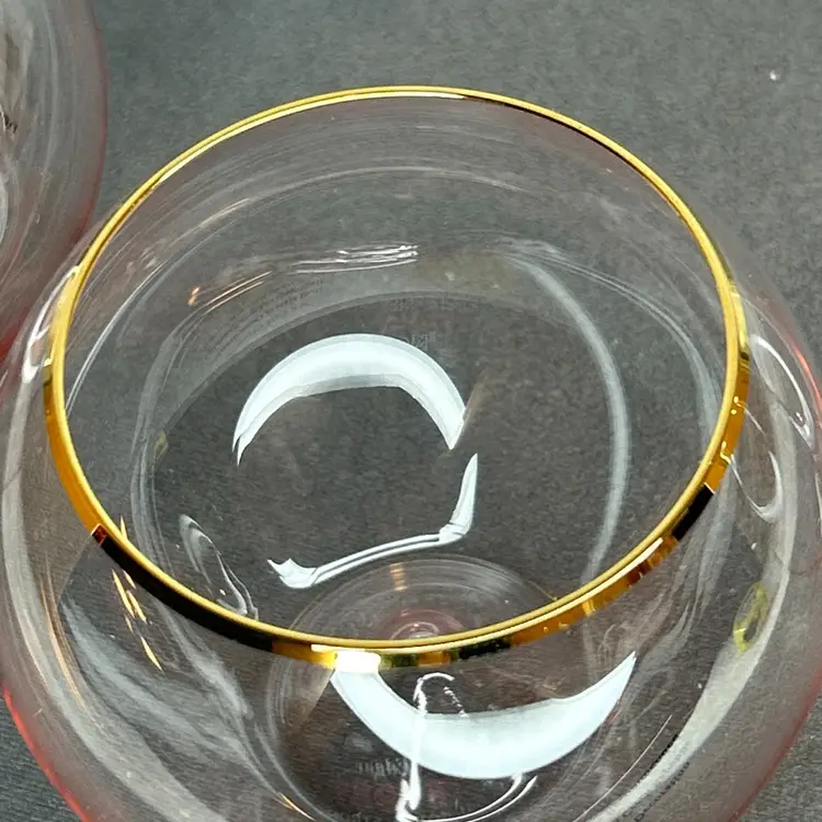 These Anthropologie pink stemless wine glasses with 24kt gold gilding are a glamorous addition to any table setting. Hand-blown and decorated, this set includes three stemless wine glasses that are sure to elevate your dining experience. The pink color and gold trim add a touch of elegance to your glassware collection, making them perfect for special occasions or everyday use. Cheers to good taste with these stunning wine glasses.