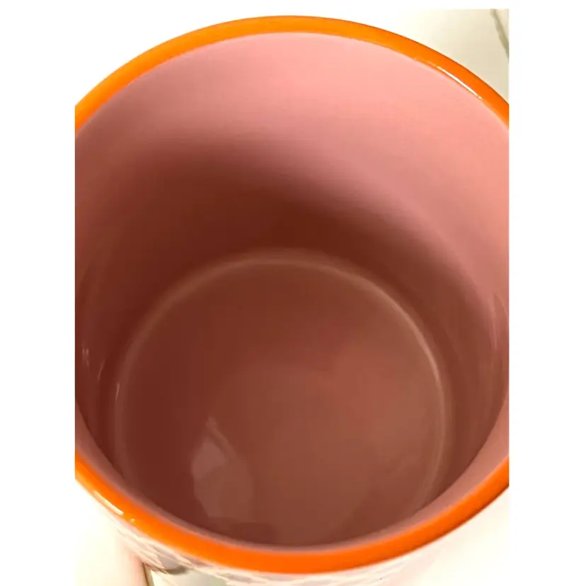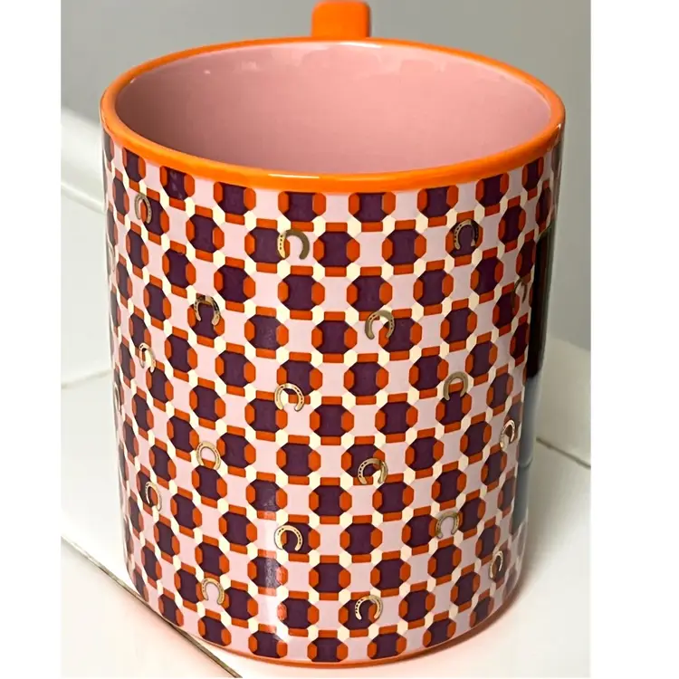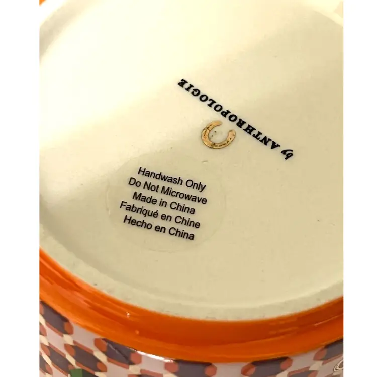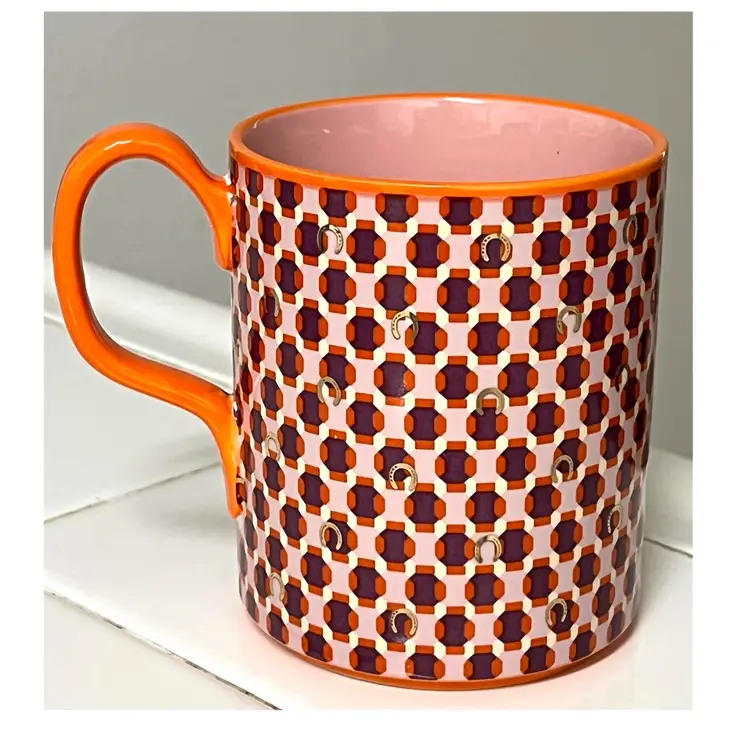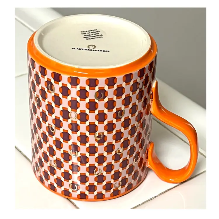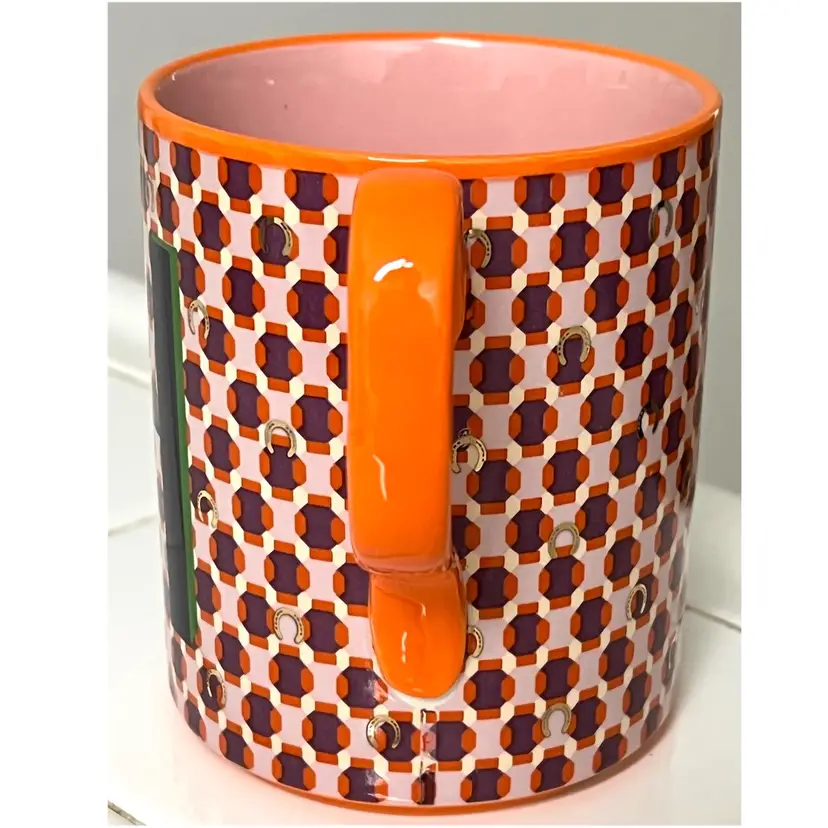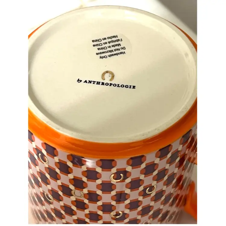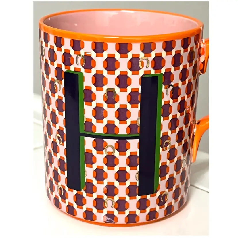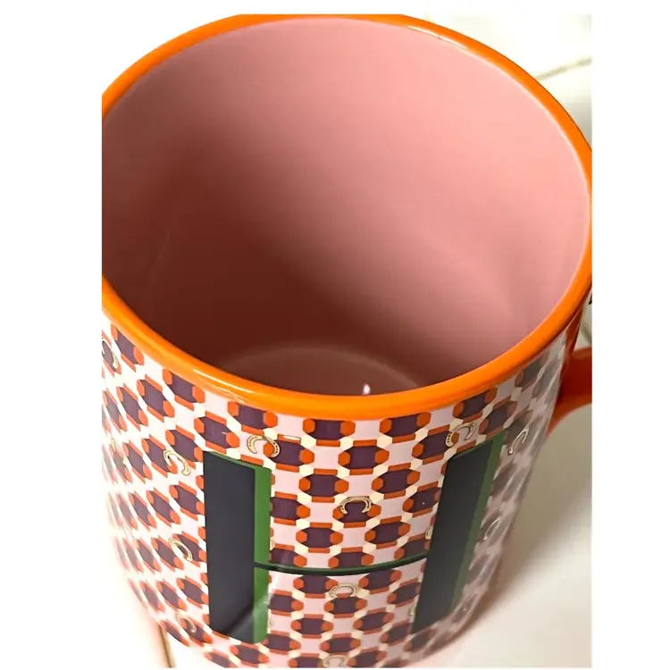 Anthropologie Parker Stoneware Geometric Monogram Letter H Orange Purple Coffee Mug MCM Style 4 in Height, 3.5 in Diameter. 14 oz. No chips