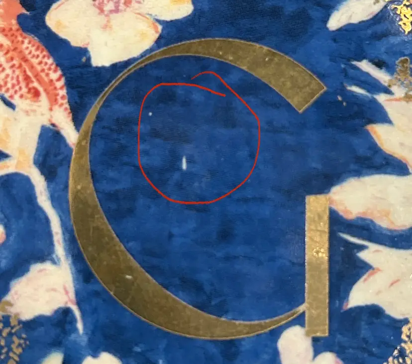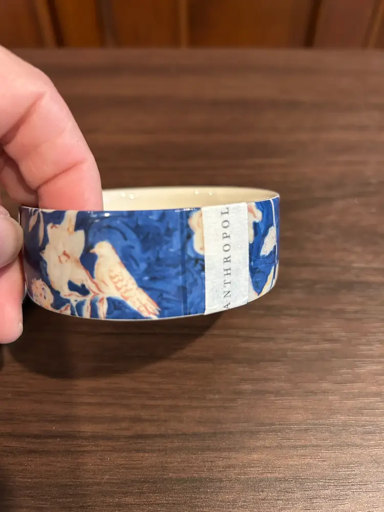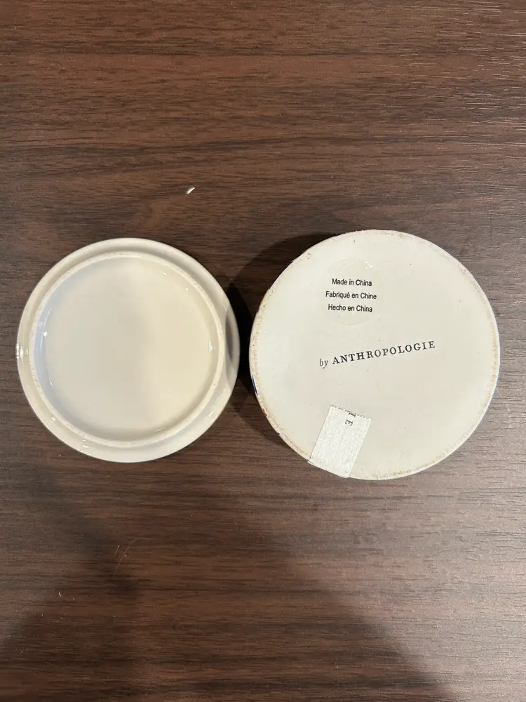 Anthropology trinket box with an initial G on the lid. Measures 3 inches in diameter and about 1 1/4 inches tall with the lid on. Beautiful blue base with light pink florals and birds. Gold around rim of lid. One small callout on lid-white spot from small knick as seen in pictures. It looks like maybe damage from where the lid was taped on, but very minor.