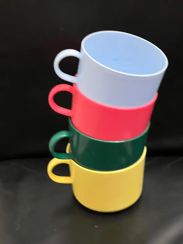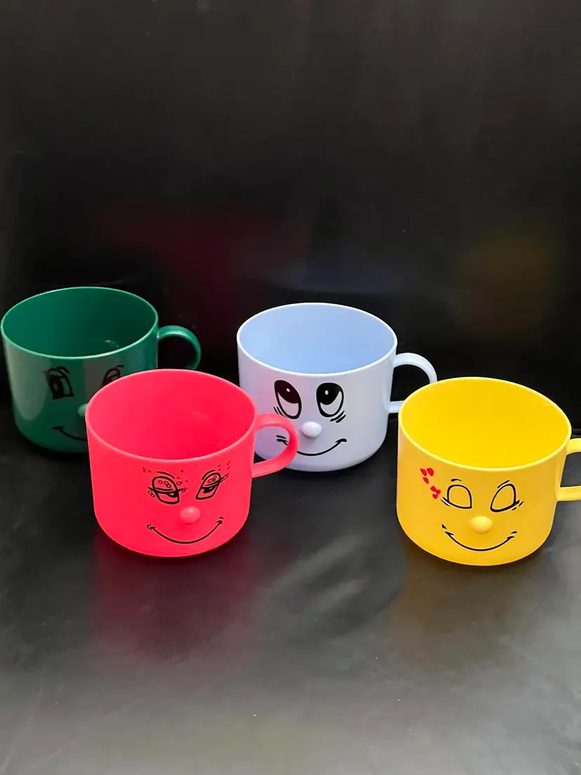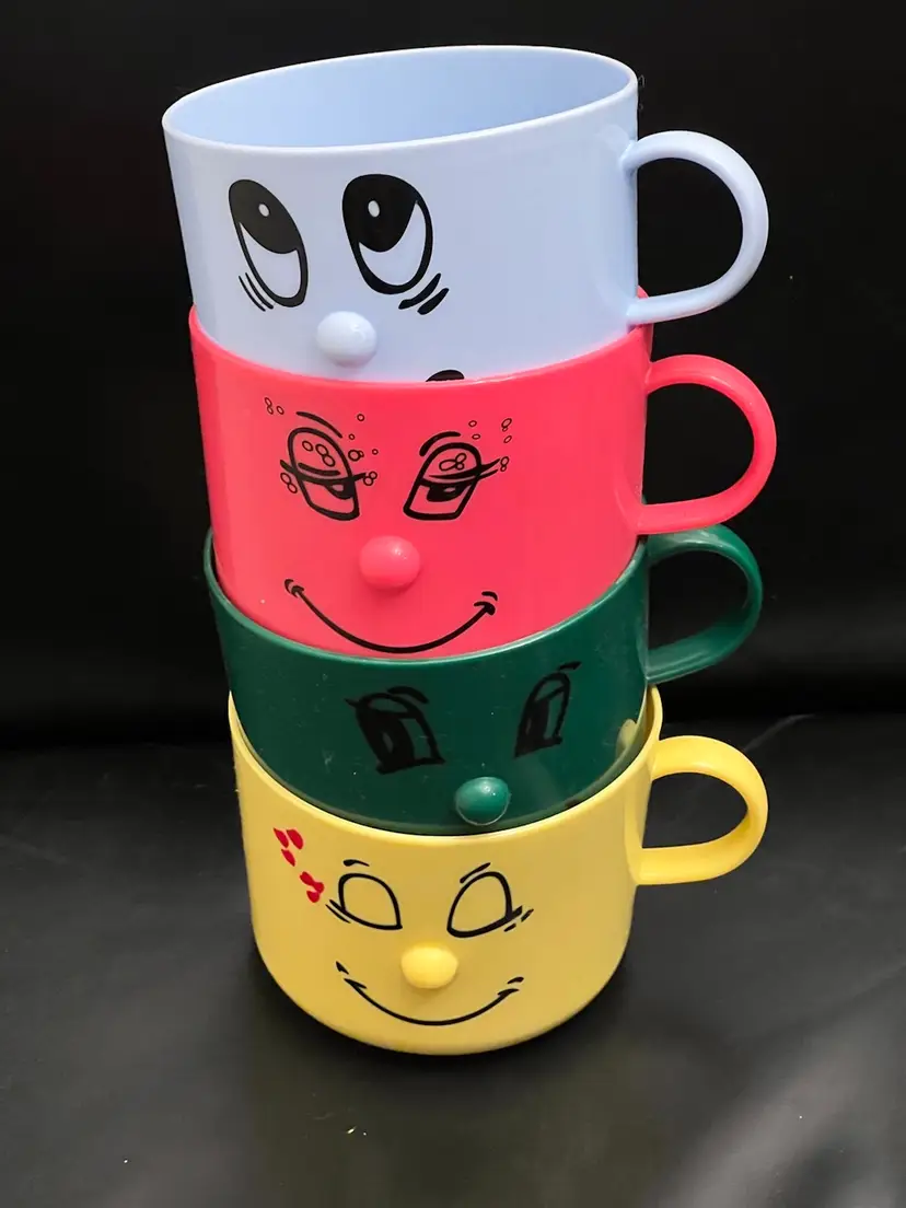 Vintage Dolce Vita anthropomorphic funny face plastic handled mugs, cereal bowls, set of four in yellow, green pink and light blue. Adorable!