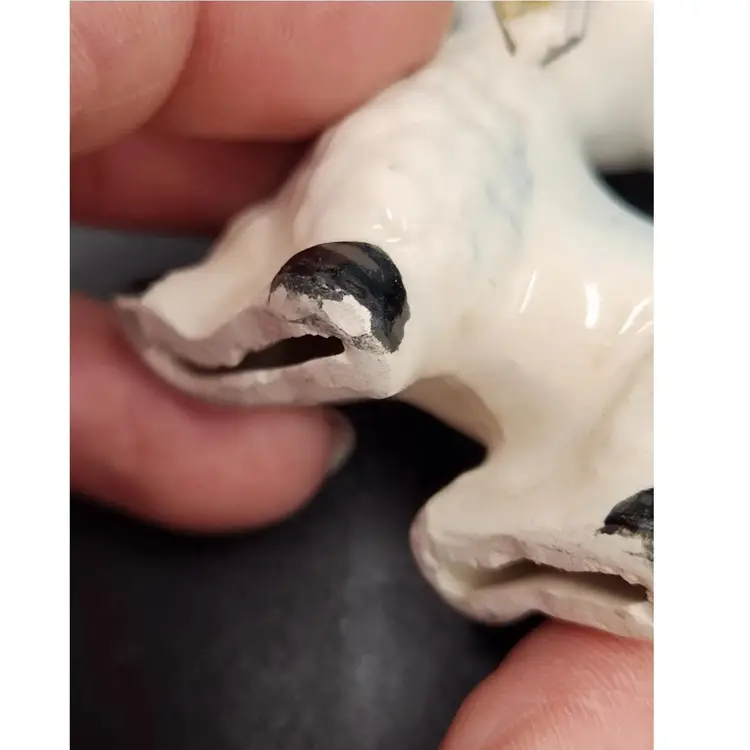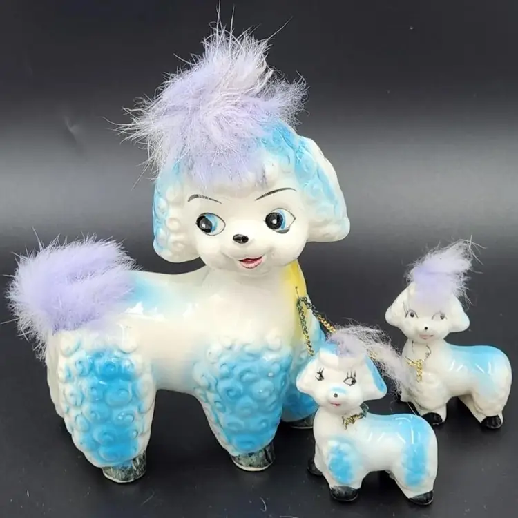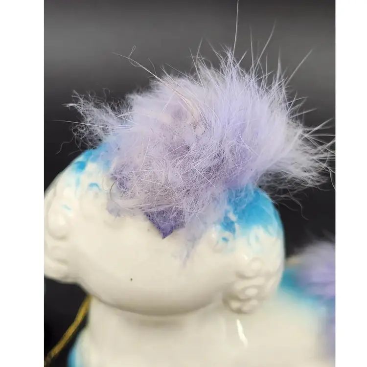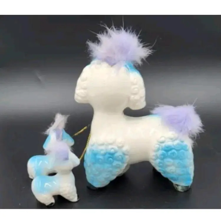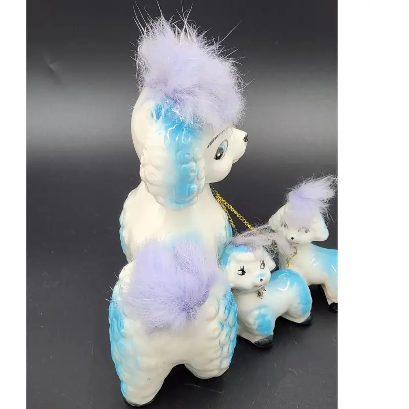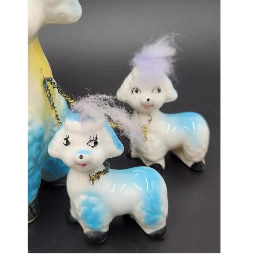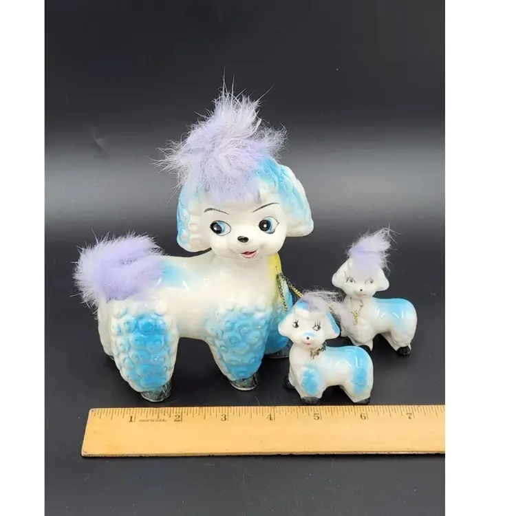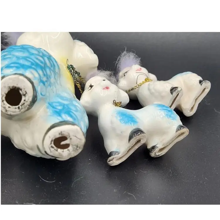 The fur on the puppies is sparse. There is a black spot on the chain. Small chip on the bottom of the one puppies paw. Mommy is 6" Tall by 5" long