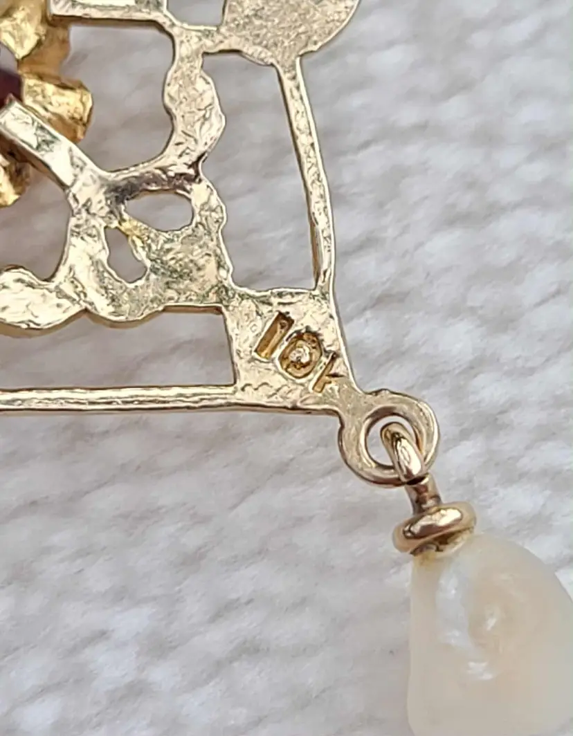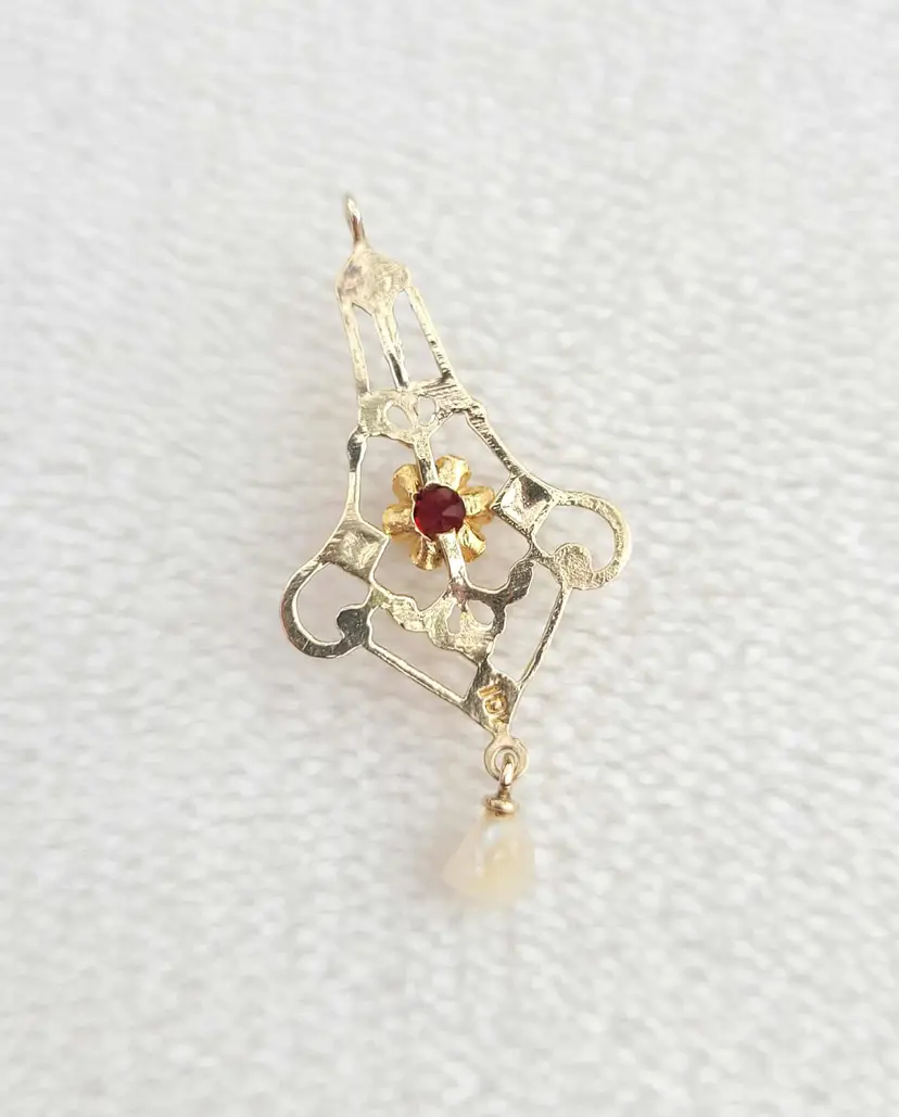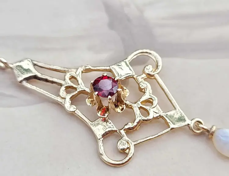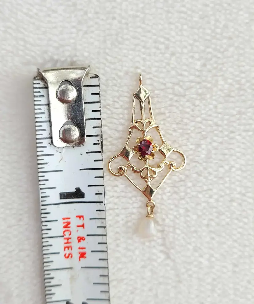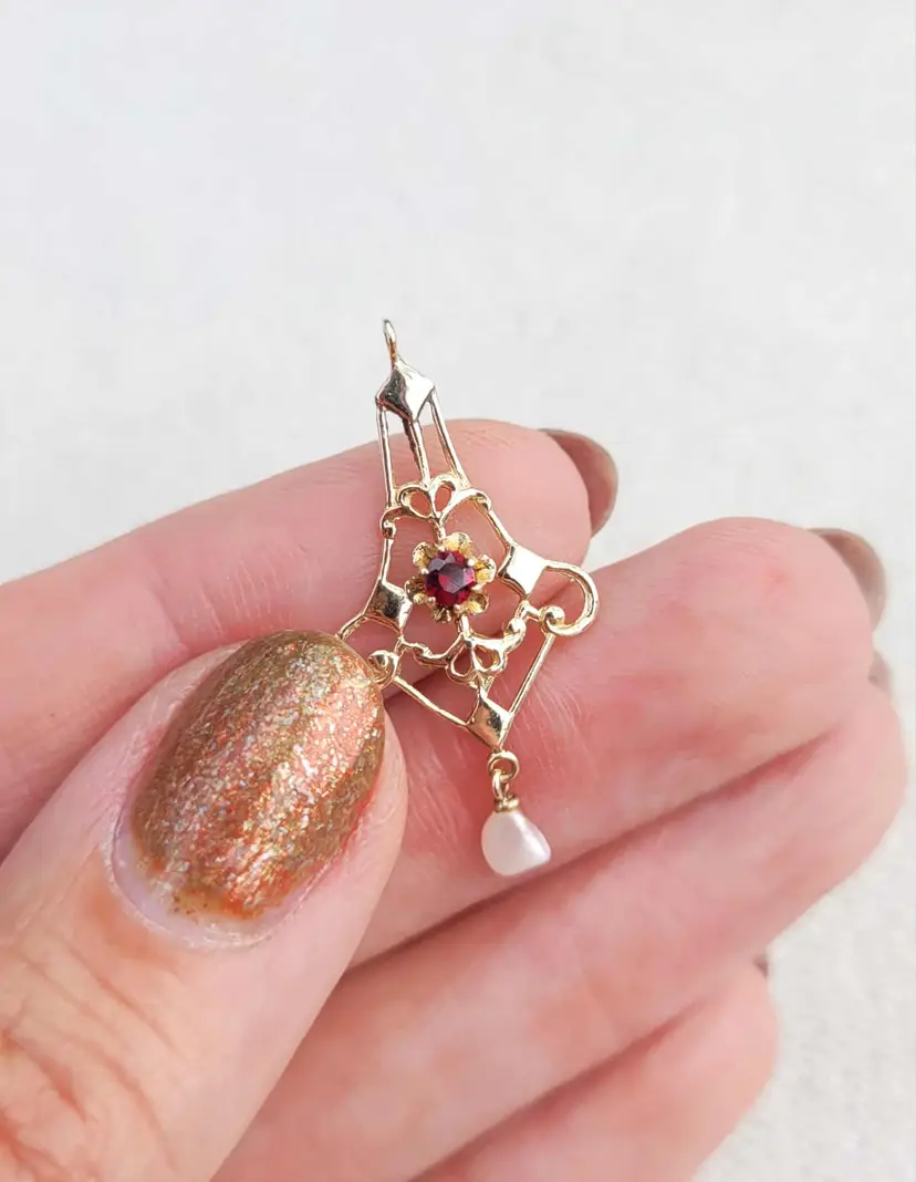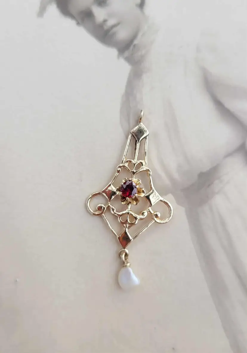 This is a stunning solid 10k yellow gold Victorian Lavalier pendant with a little drop pearl and a wine red genuine garnet center stone.