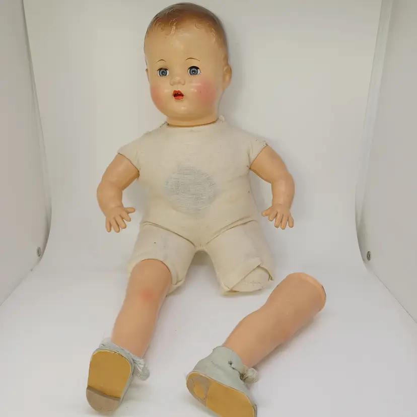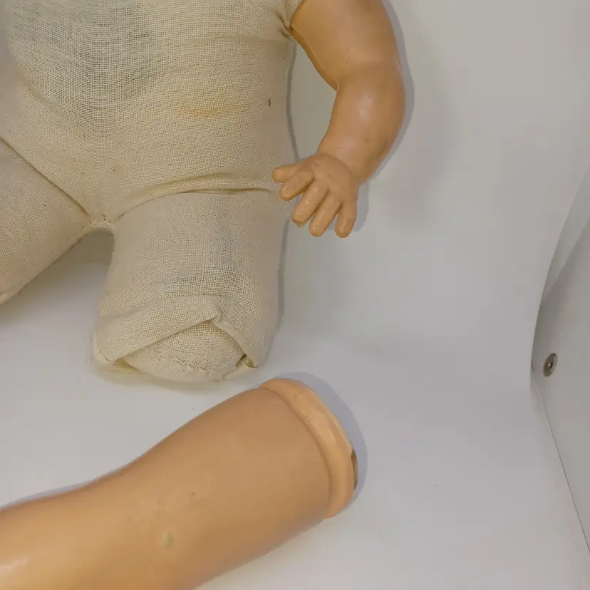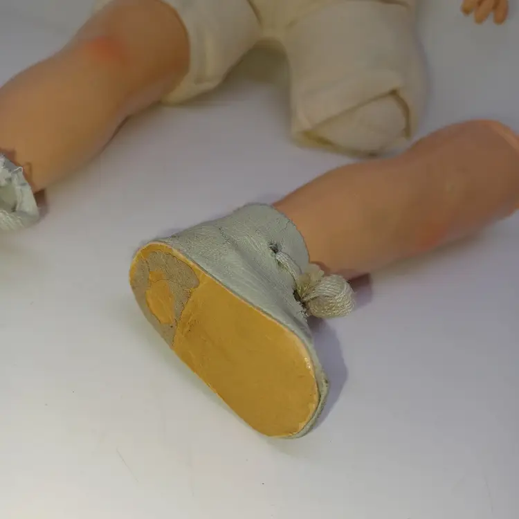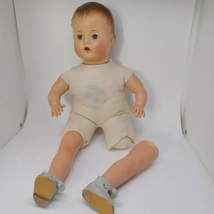 Antique 18" Composition & Cloth Baby Doll, Sleep Eyes, Molded Hair, Crier Box (works), Shoes- one missing heel Leg is in unattached just needs to be wired back on I currently have too many projects so decided to pass this one along to someone who will love to restore this one to its original Glory does have a few scratches chips Etc to the composite but still really in a great beautiful condition please see all pictures as they are the best description