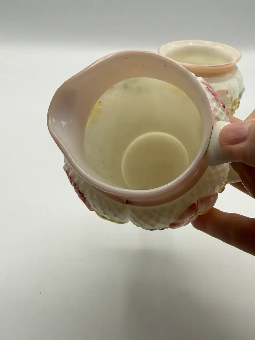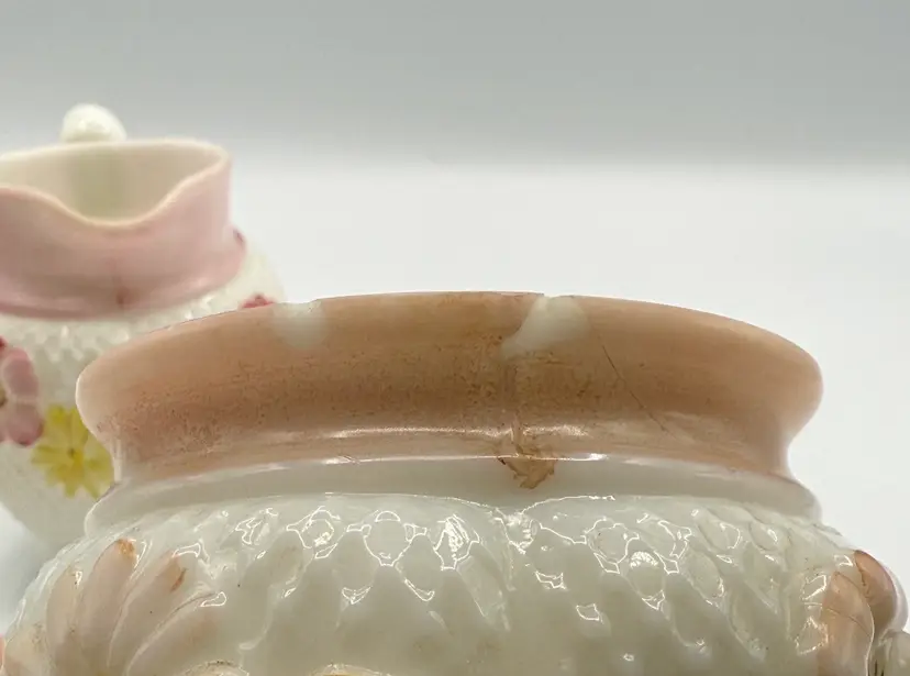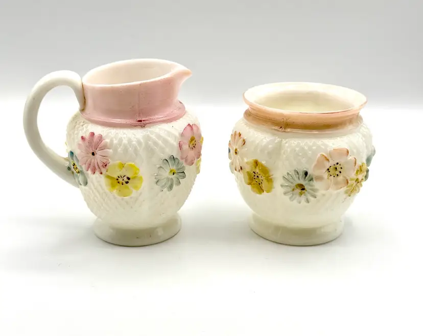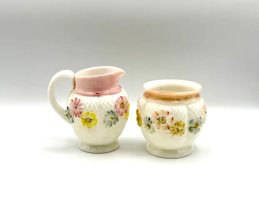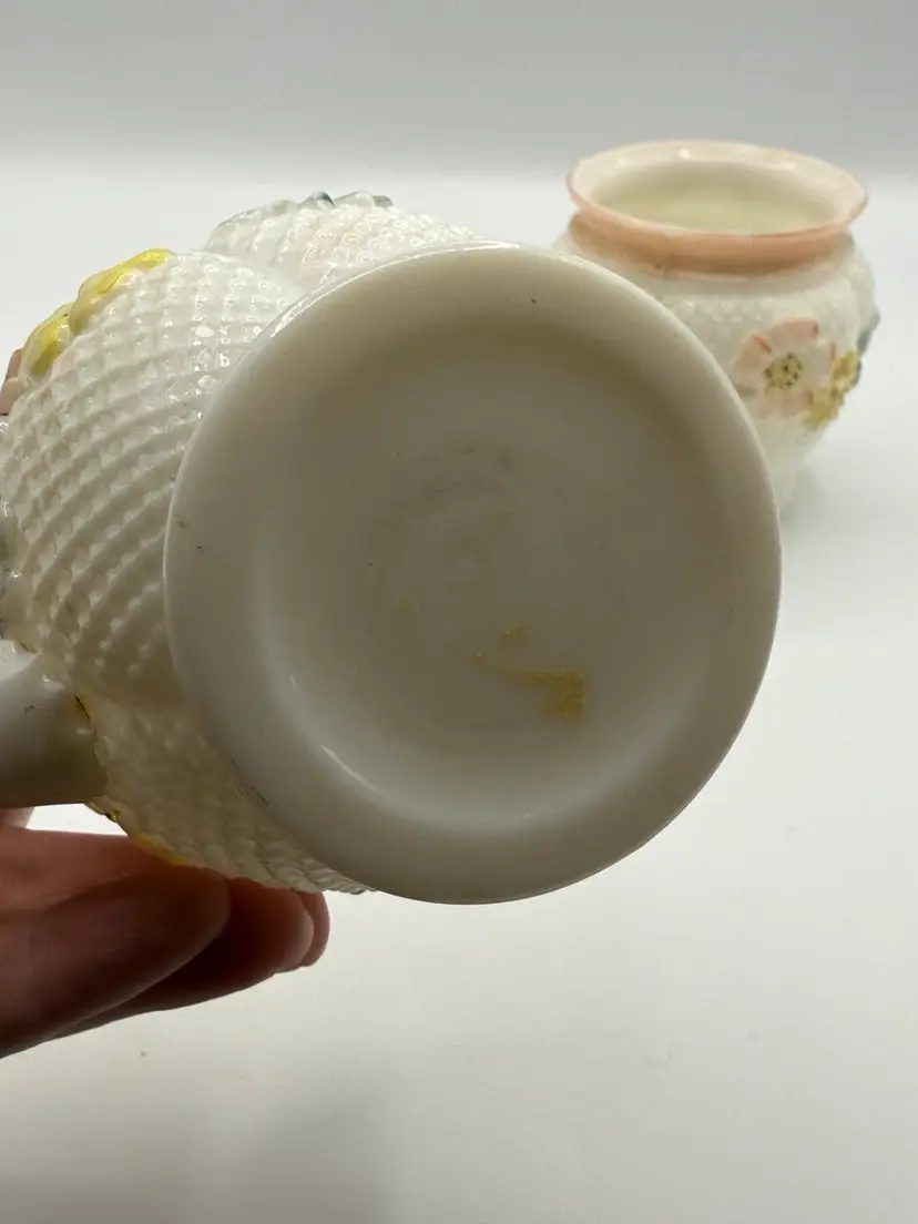 Antique 1800’s Consolidated Glass Cosmos Creamer and Sugar Bowl - Milk Glass. Few flea bites to rim of sugar bowl. Creamer 4.5”, Sugar 4”