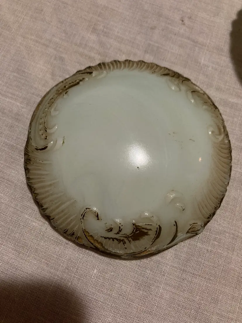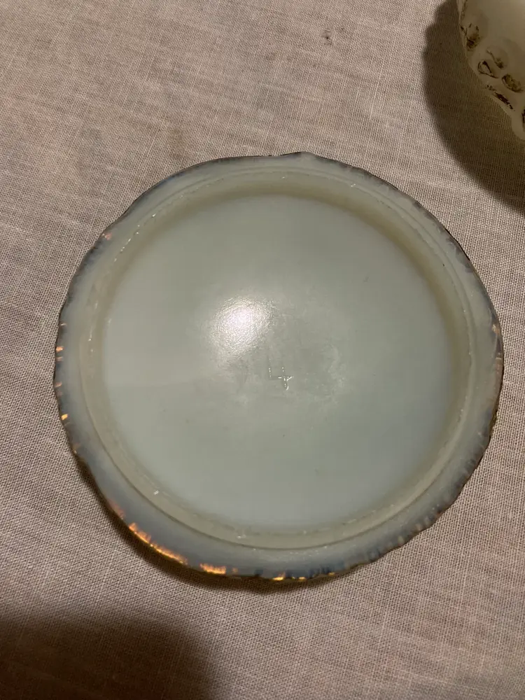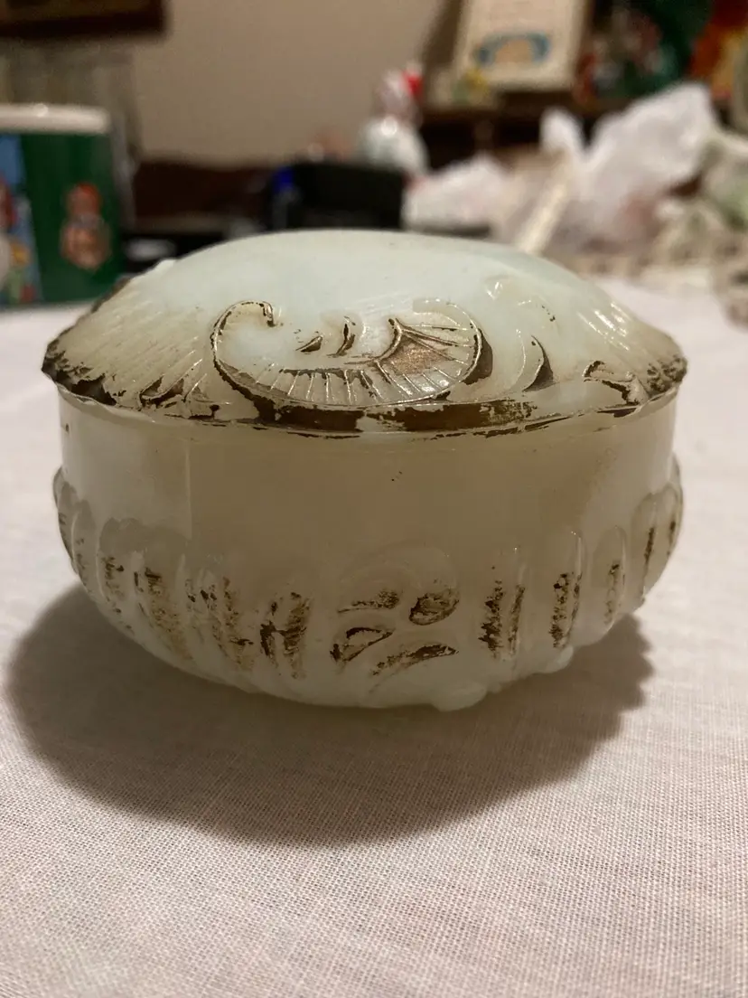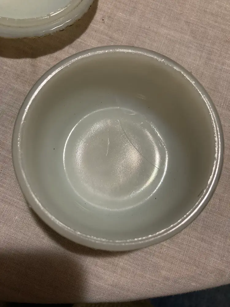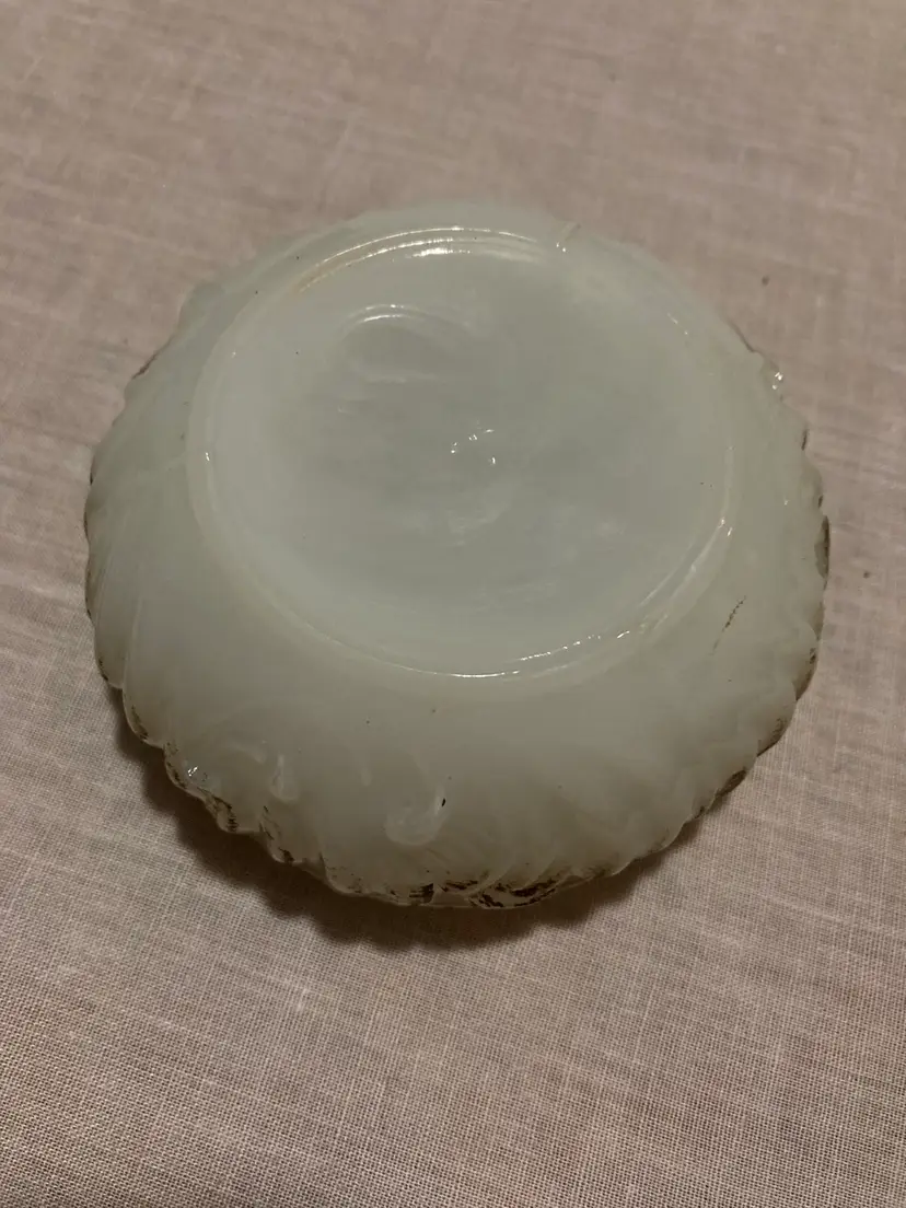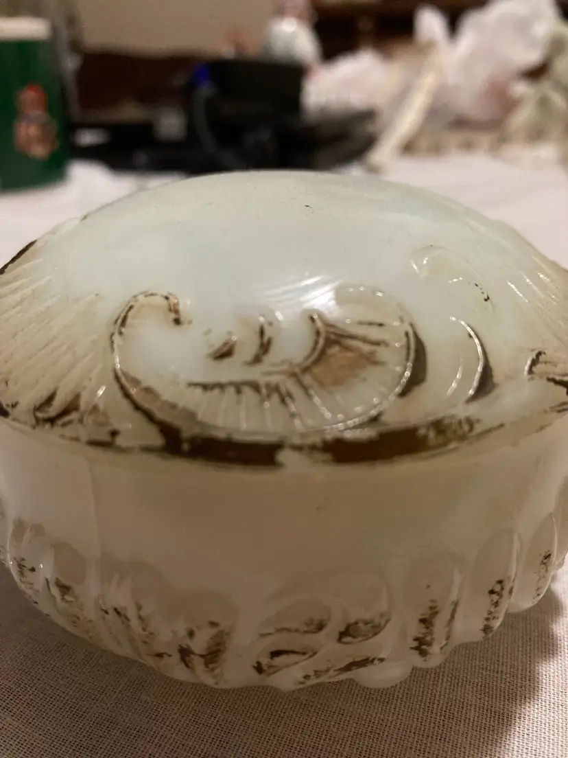 No chips or cracks but it is rough around the inside lip of the lid. This is usual on these antique milk glass pieces.