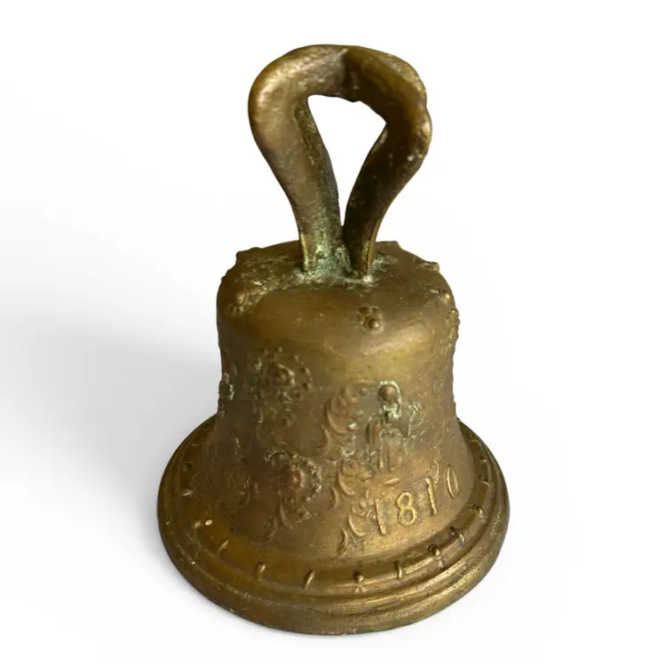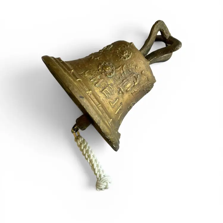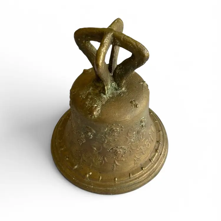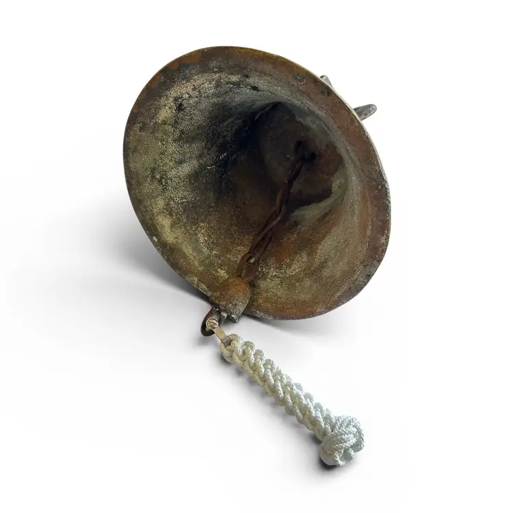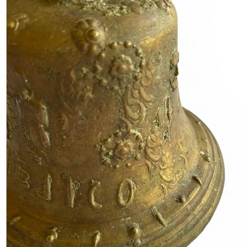 Step into history with this authentic bronze bell from a Spanish Colonial mission in Mexico. Cast in the robust, time-worn style of colonial church bells, this piece carries the patina of centuries and tells a quiet, reverent story of faith and community. Its rugged surface and weathered inscriptions speak to the hands it passed through and the bell’s long vigil over morning prayers and evening chimes. Whether displayed as a standalone artifact or paired with other antiquities for a vignette, this bell brings a tangible connection to the architectural and devotional heritage of Mexican missions.Size: 9" x 10" x 15" (hanging length) | Weight 12 lbs.