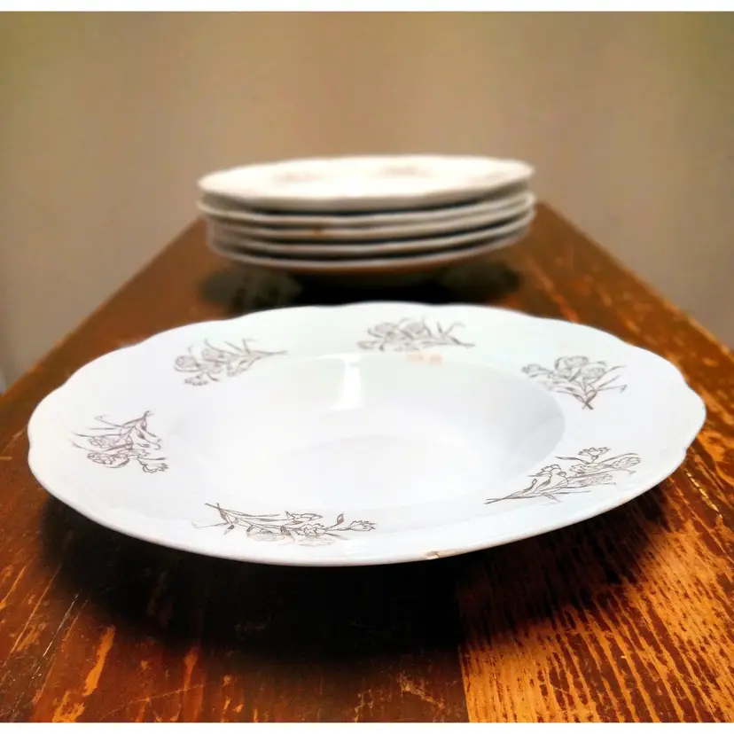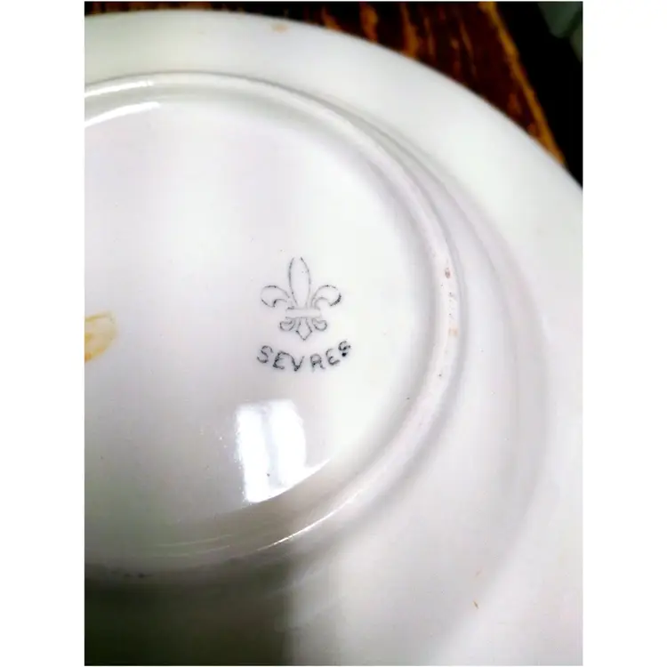 Antique bowls made in France. Sevres fleur de Lis. Gold and white porcelain. One has a small chip as shown in picture. A few have some staining indicative of age