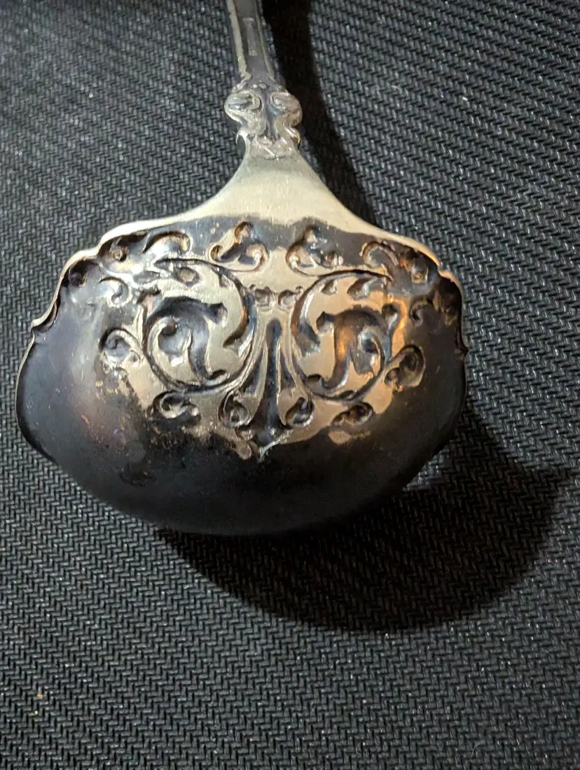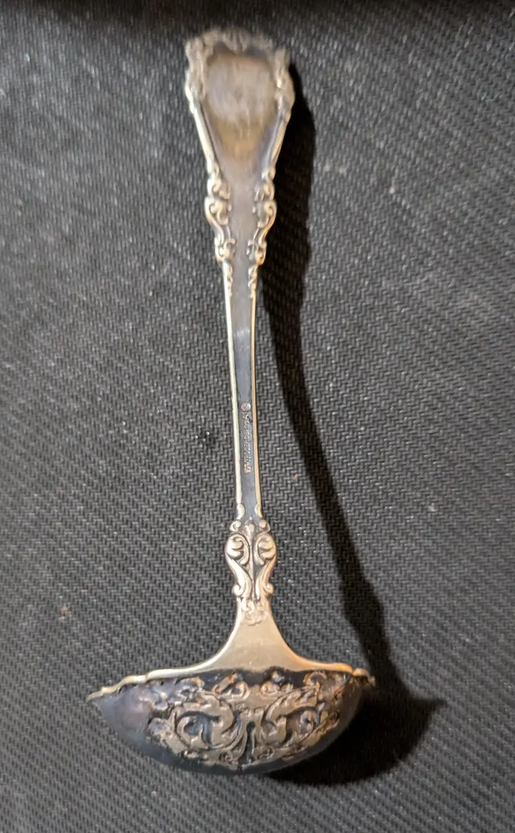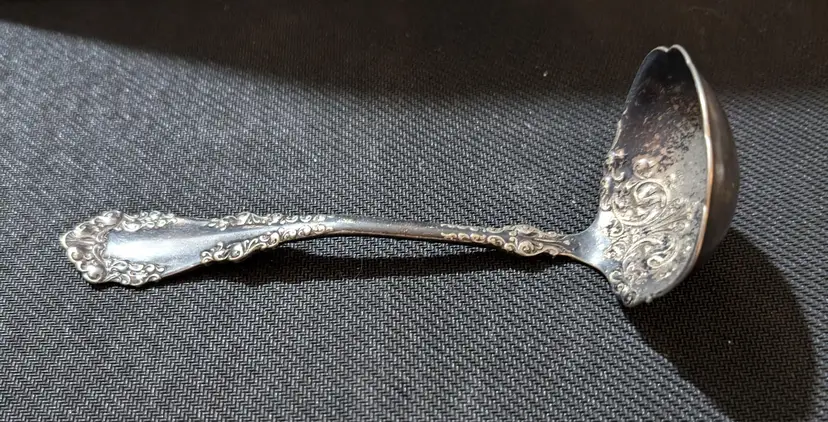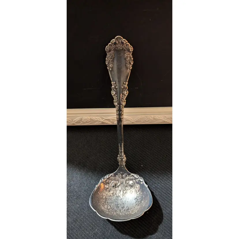 Beautifully crafted antique 1847 Rogers and Bros silver-plated soup ladle with intricate floral and scroll designs on the handle and bowl. This piece is in excellent condition with no visible tarnish or damage. Perfect for adding a touch of elegance to your dining experience or for collectors of vintage silverware. The ladle measures approximately 7 inches in length and 3 inches in width.