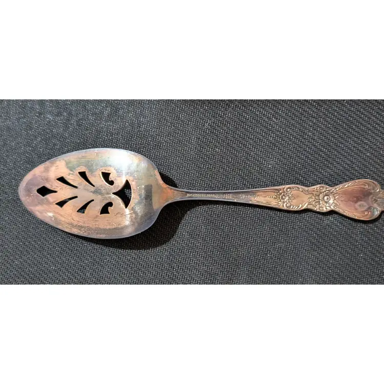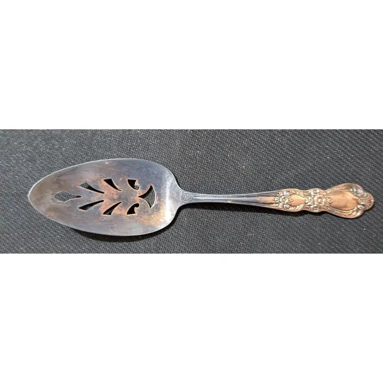 This antique Rogers and Bros 1847 silver-plated serving knife features a beautifully ornate handle and a slotted design, perfect for serving vegetables or other dishes. The spoon has a lovely patina that adds to its vintage charm. It is in good condition with some signs of wear consistent with its age, but no major damage. A wonderful addition to any antique silverware collection or for use in your vintage-themed kitchen.