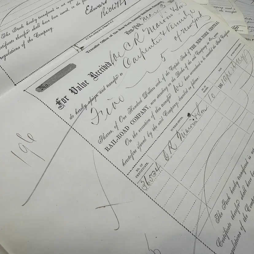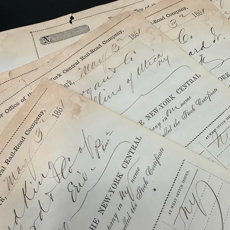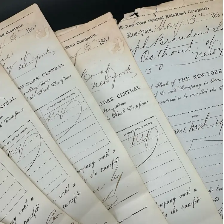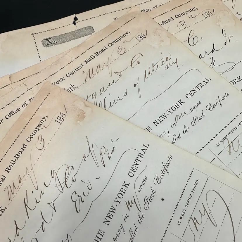 Amazingly antique paper that was very important back in the day! Shares of NYCentral RR in various amounts. Good condition for its age, some foxing but good overall.
