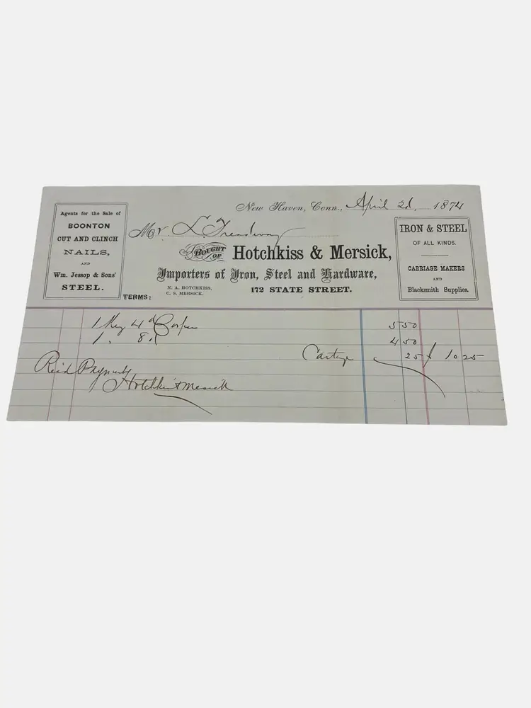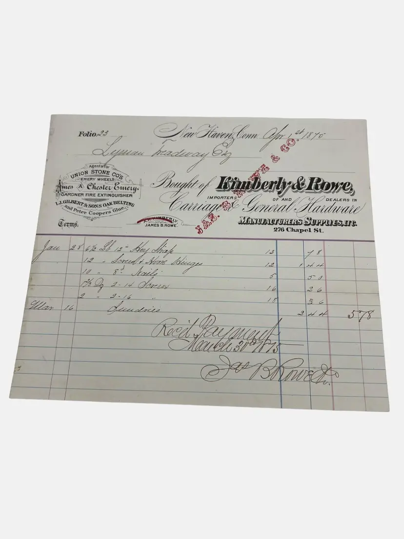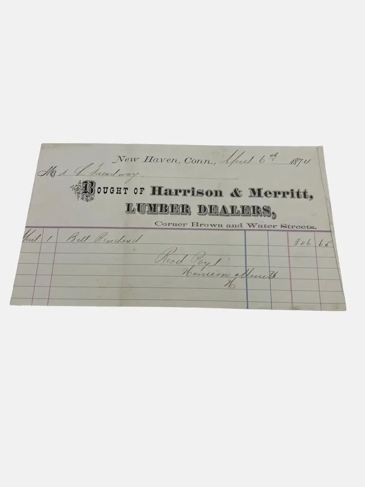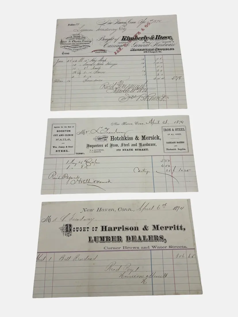These billheads from the 1870s offer a glimpse into the historical commerce of New Haven, Connecticut. Ideal for collectors and history enthusiasts. The billheads were all for Mr. Lyman Treadway and were from: Kimberly & Rowe: Imports of and Dealers in Carriage & General Hardware (1870) Harrison & Merritt: Lumber Dealers (1874) Hotchkiss & Mersick: Importers of Iron, Steel, and Hardware