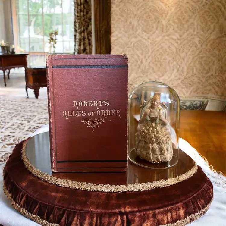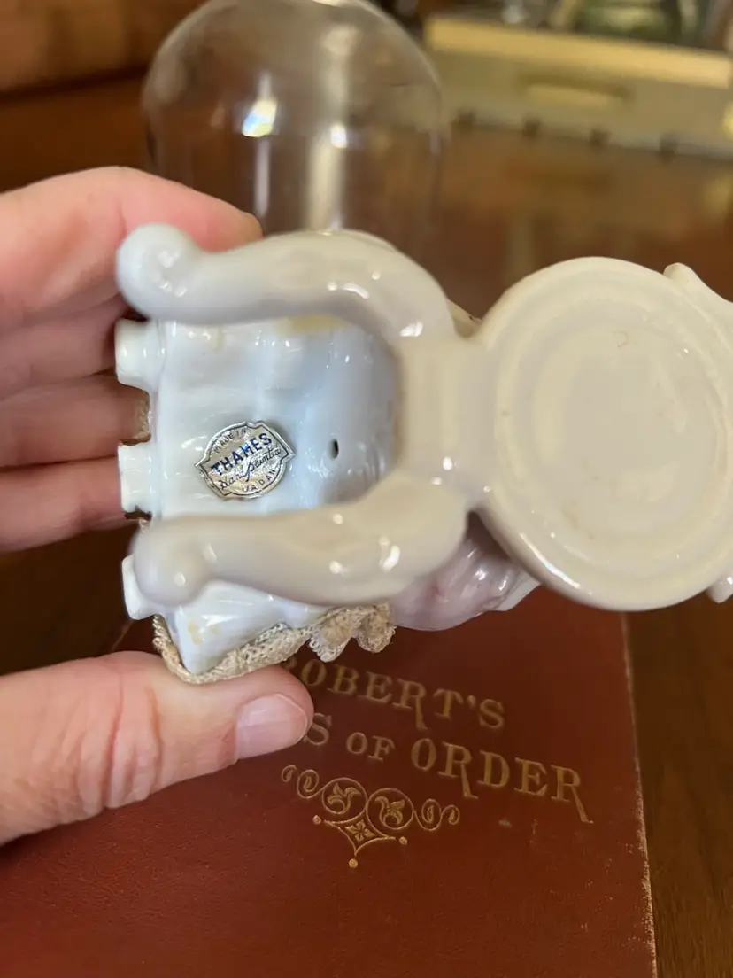 Lot of 3: antique book, cloche, Thames figurine! Book 176 pages Cloche 5” tall