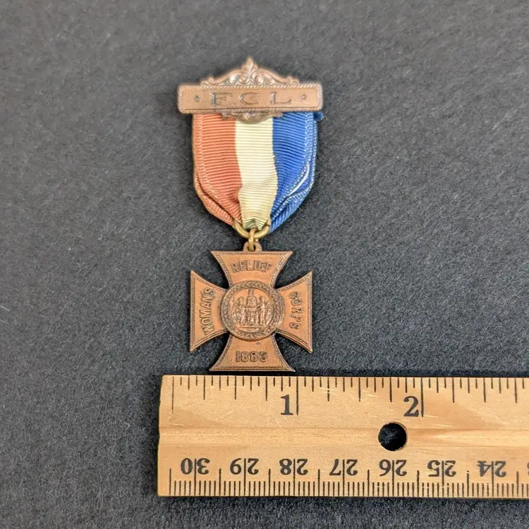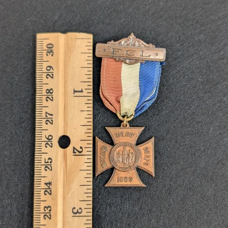 Metal for the 1883 Woman's Relief Corps which served as an auxiliary to the Grand Army of the Republic (GAR). The F.C.L. at the top represents the motto: Fraternity, Charity, and Loyalty. In nice, antique condition with some fading on the ribbon and minor wear. It comes with the Aug. C. Frank Co box. Measurements ~ 2.5 x 1.25"