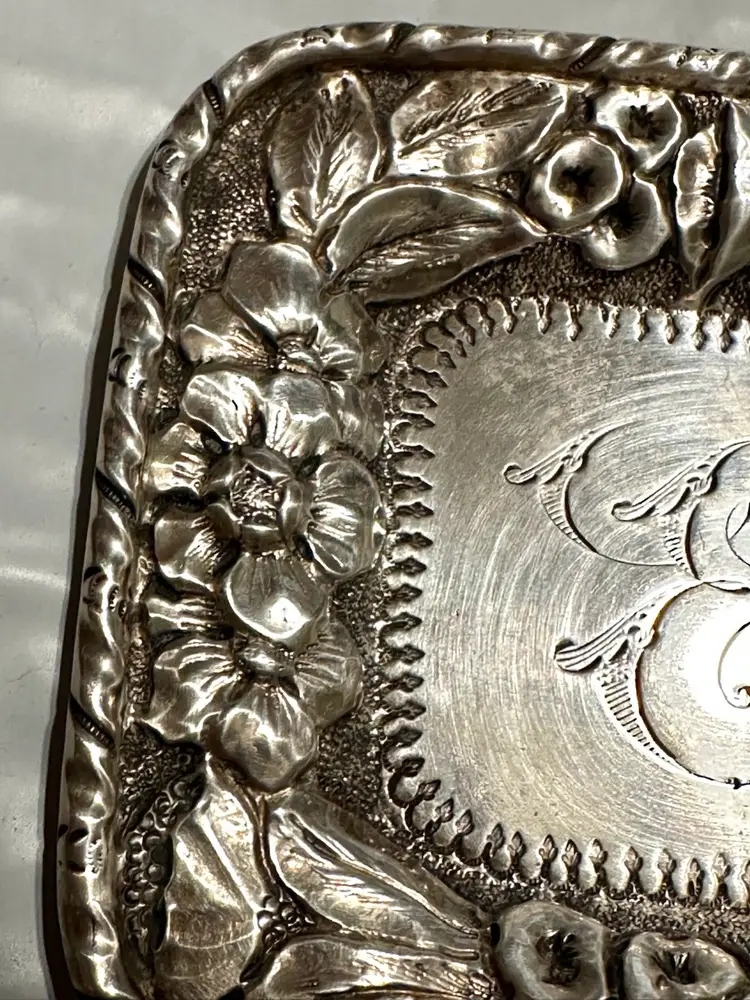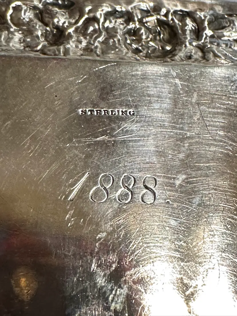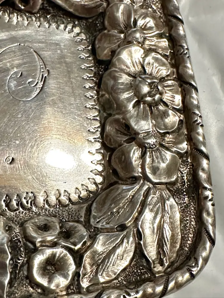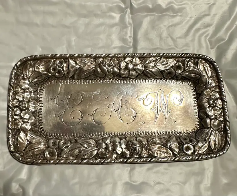 Beautiful Victorian antique calling card tray. It is solid sterling silver with a wonderful repose floral design. It has a fancy monogram EAW. It measures 6” x 3”. It weighs 72 grams. It is dated 1888. Very good condition.