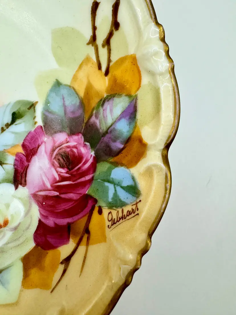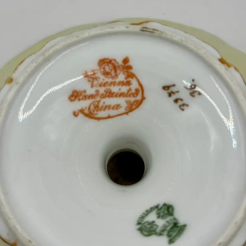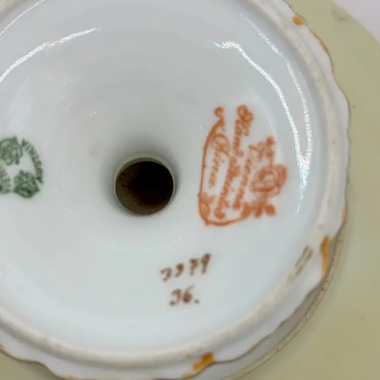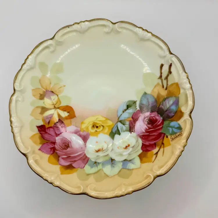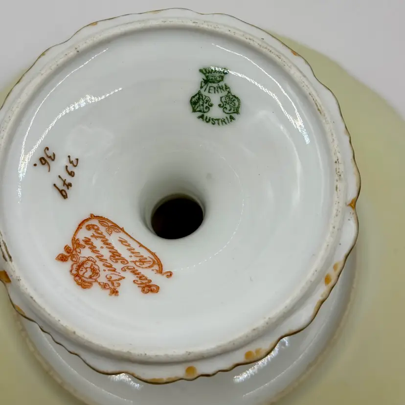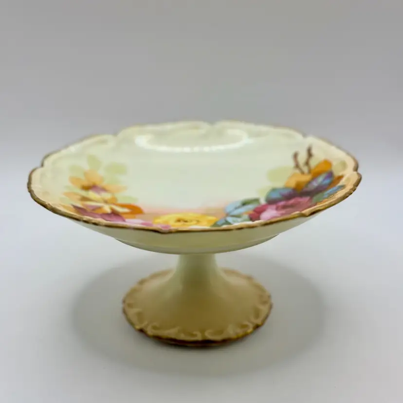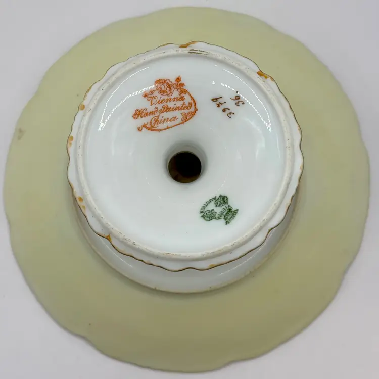 This antique porcelain compote plate pedestal boasts a beautiful array of hand-painted roses, complemented by an elegant gold trim. A perfect addition to any vintage tableware collection or as a charming wall display. In excellent condition with no chips or cracks. A timeless piece that exudes classic beauty. Measures 6.5x3.5x3.25. Weighs 1lb.