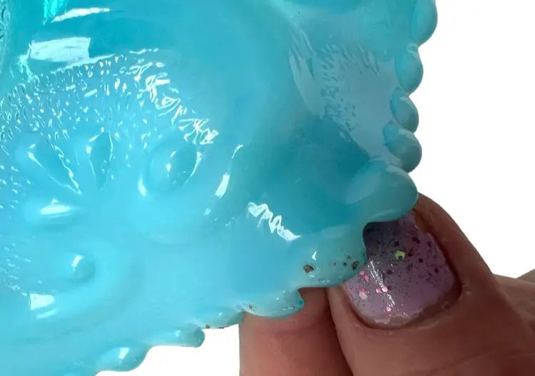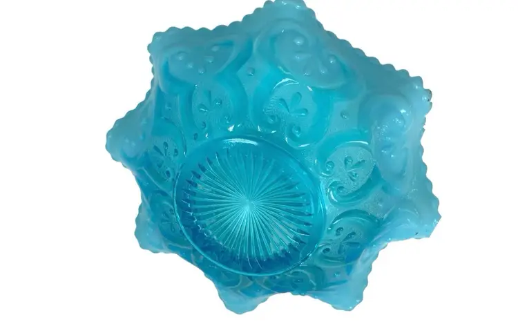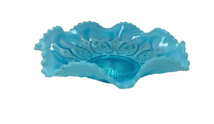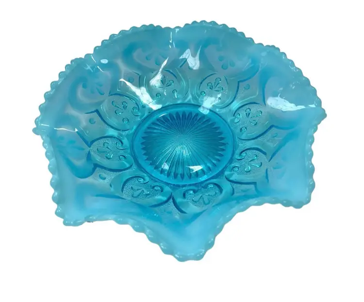 Antique 1900s Northwood blue/aqua opalescent ruffled bowl Small flaw/chip on sawtooth edge but this is common with antique and vintage items. Does not impact the design or beauty I believe this to be Cashews pattern see all photos