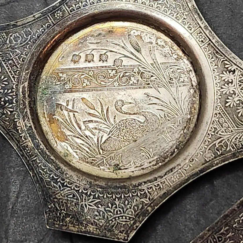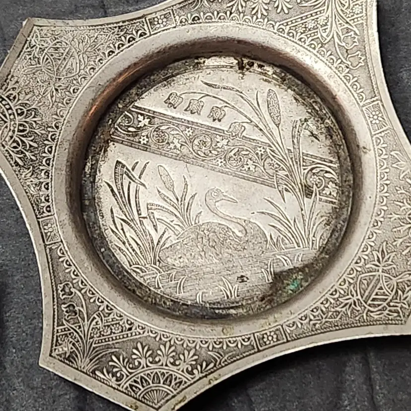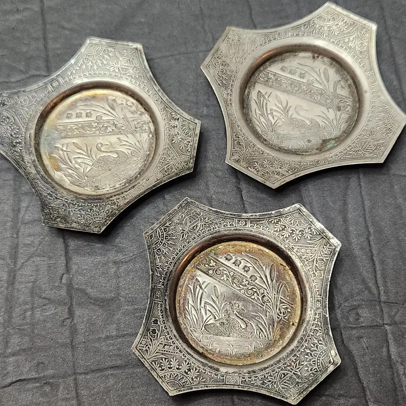 This is a wonderful set of three antique art Nouveau butter pats featuring a swan on a lake with some cattails.