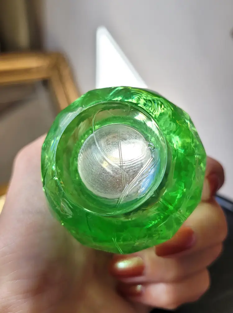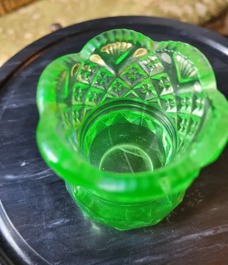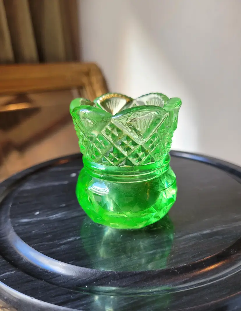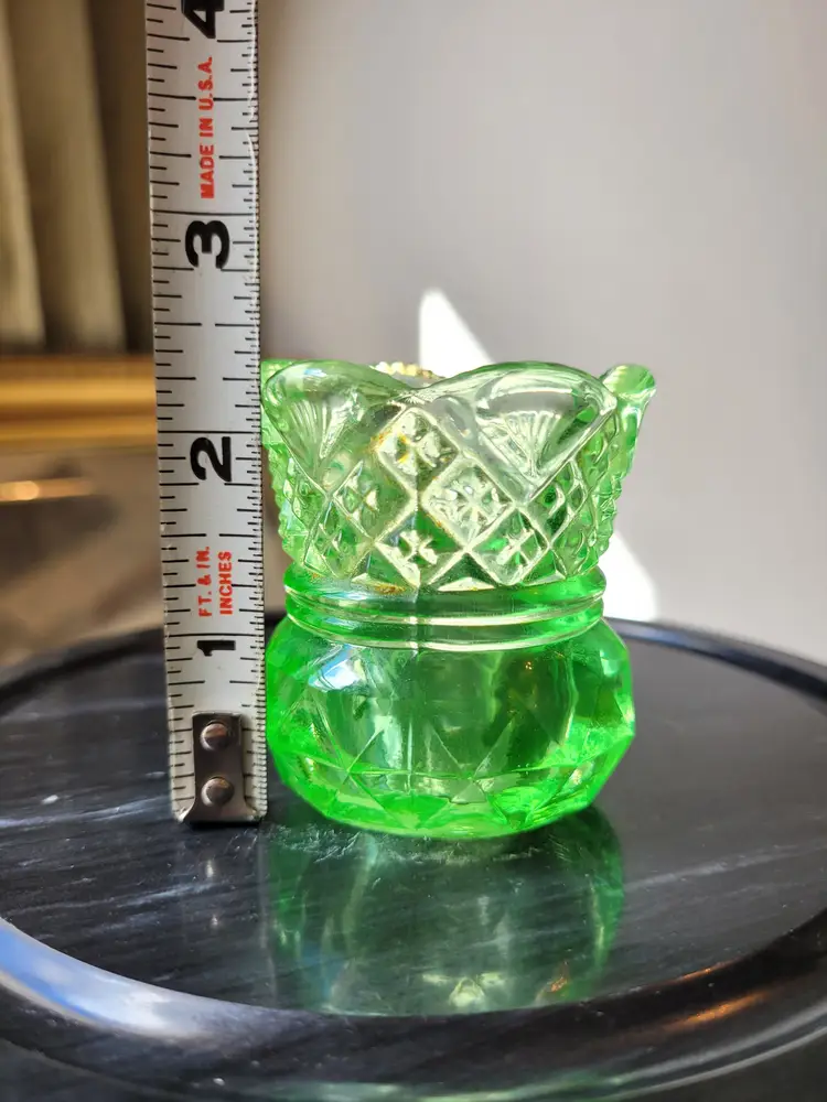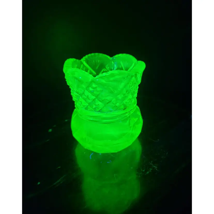 Beautiful little Edwardian UV-reactive ur&nium glass toothpick holder made by Westmoreland Glass, circa 1912. This dish is from an estate and in good condition, please see pictures for details and measurements.
