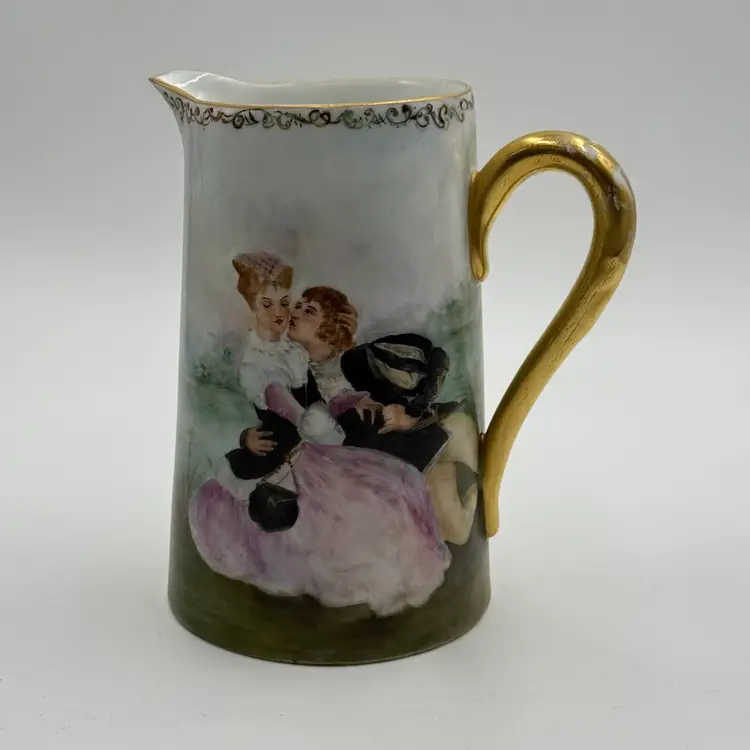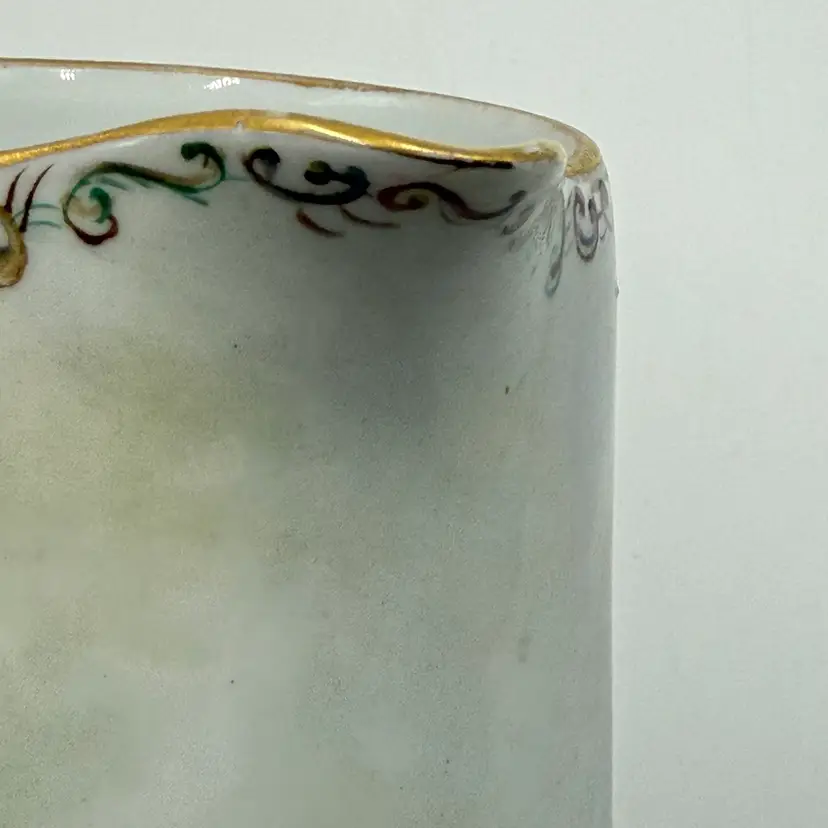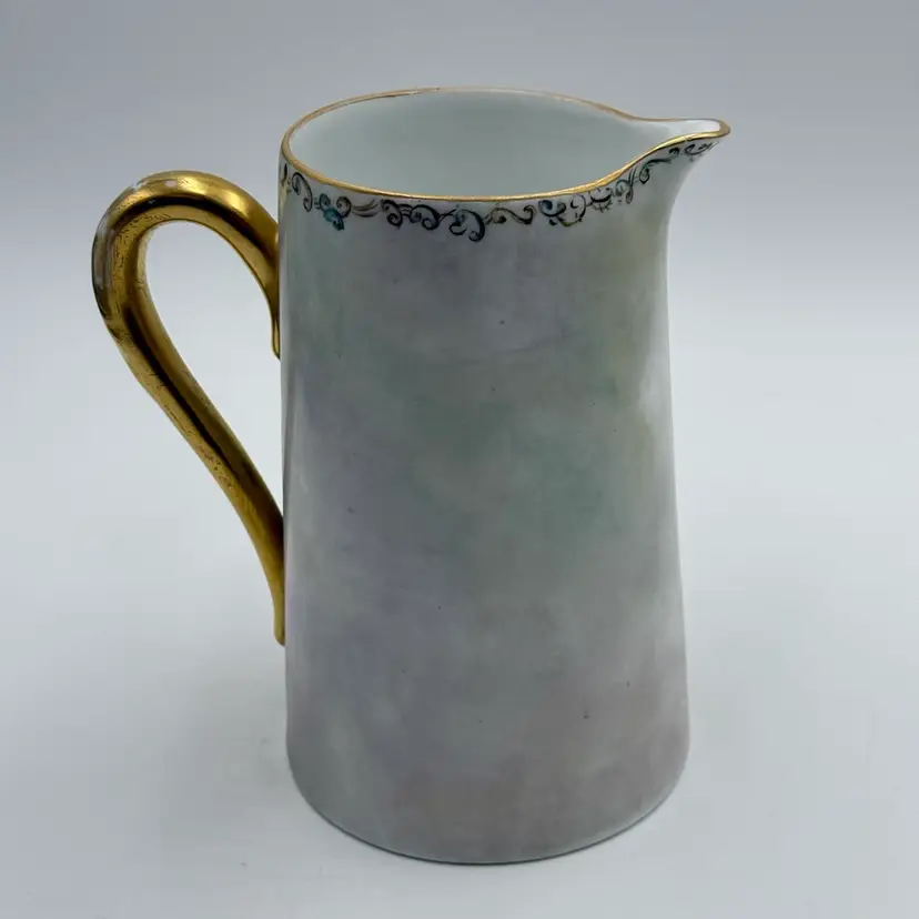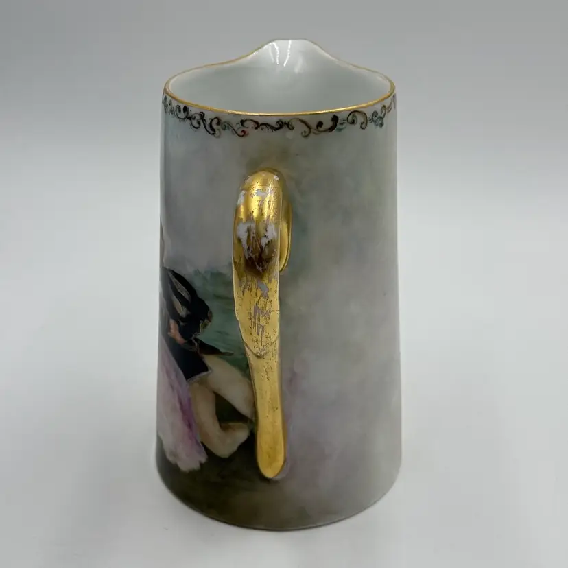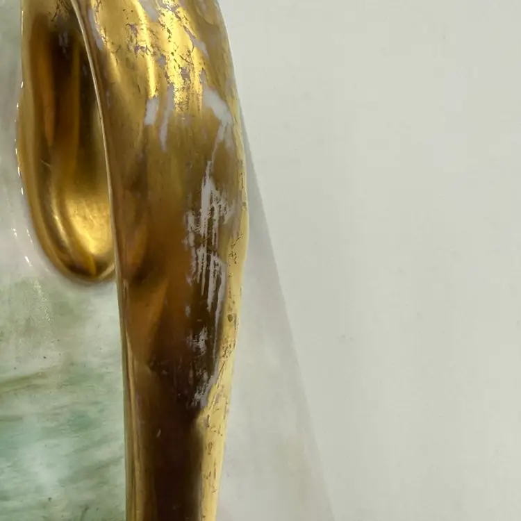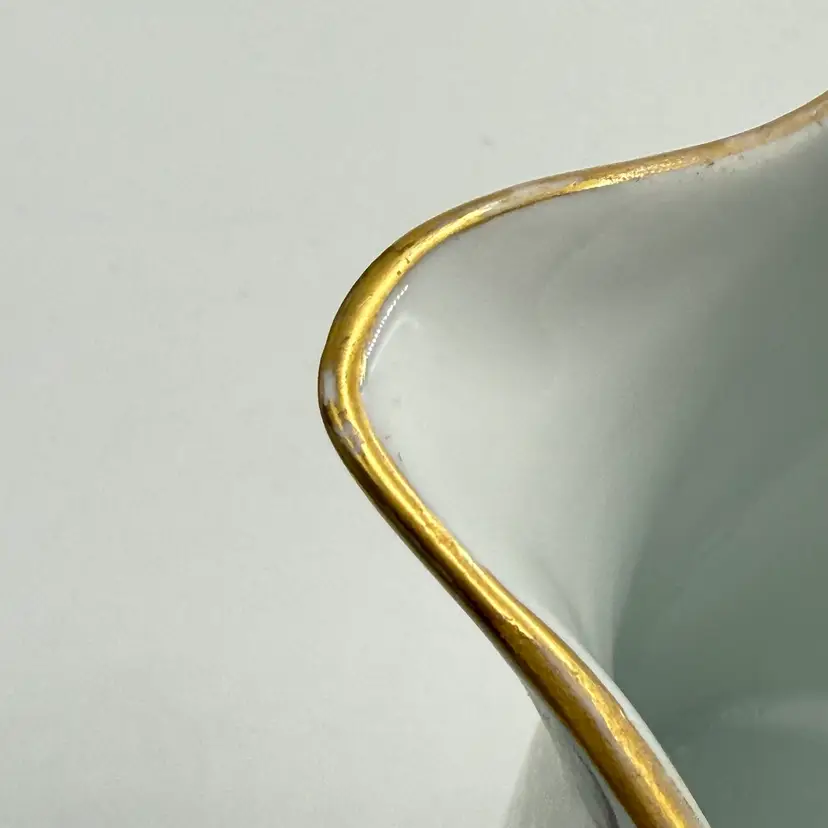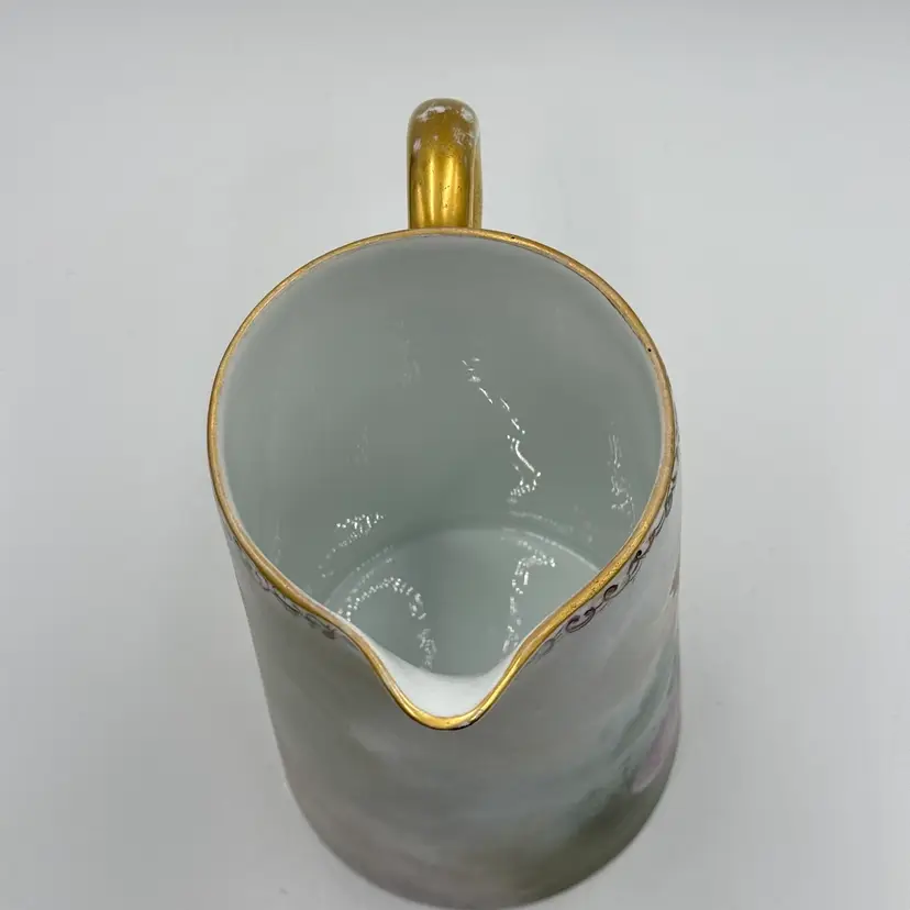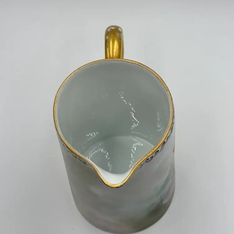 In good condition. Does not have any chips or cracks. There is wear on the gold gilding on the handle and rim. Measures 7 1/2 tall, 63/4 inches long from spout to handle and 4 3/4 inches in diameter at the bottom base.