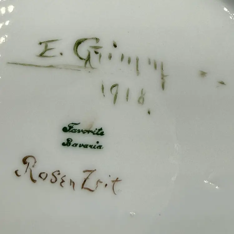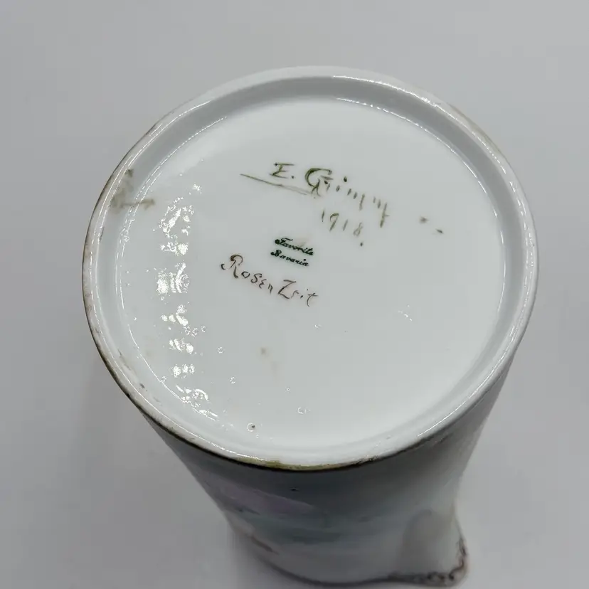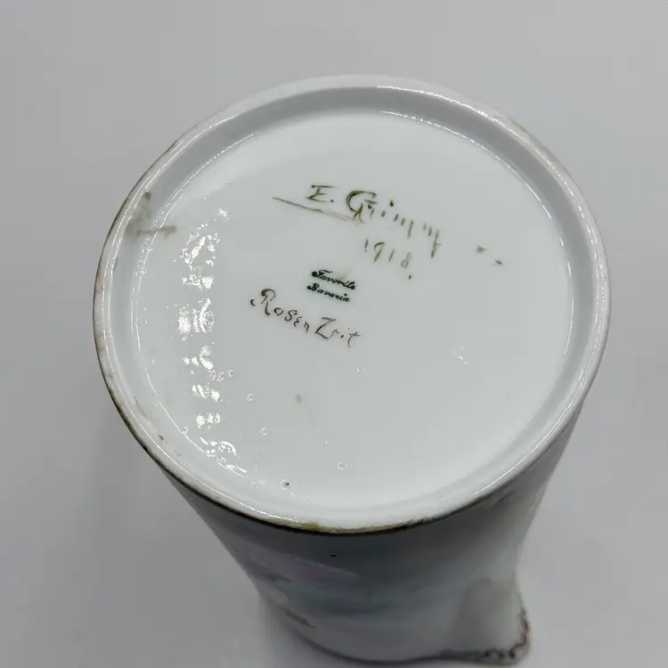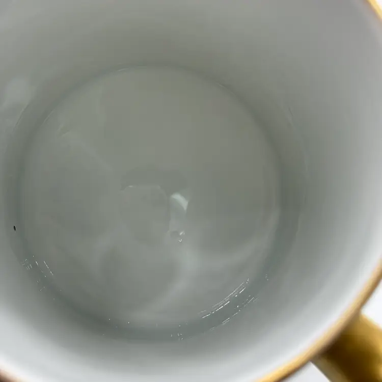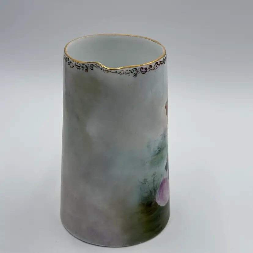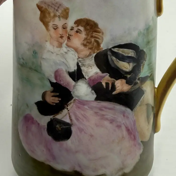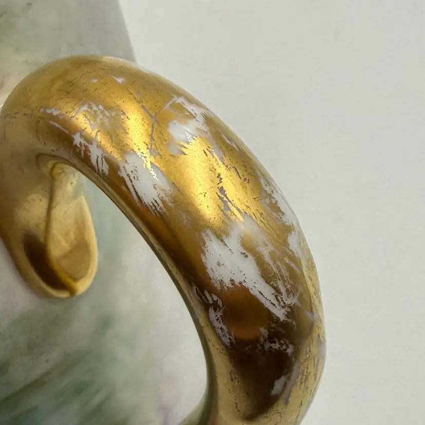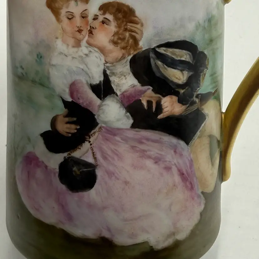 In good condition. Does not have any chips or cracks. There is wear on the gold gilding on the handle and rim. Measures 7 1/2 tall, 63/4 inches long from spout to handle and 4 3/4 inches in diameter at the bottom base.