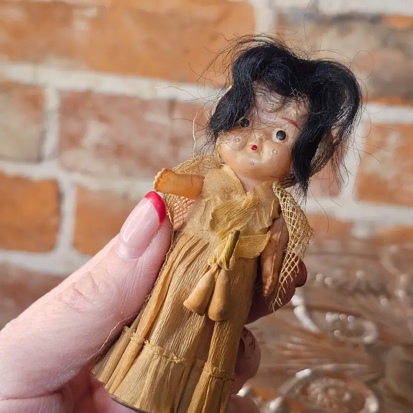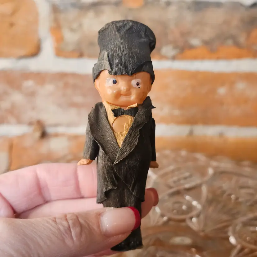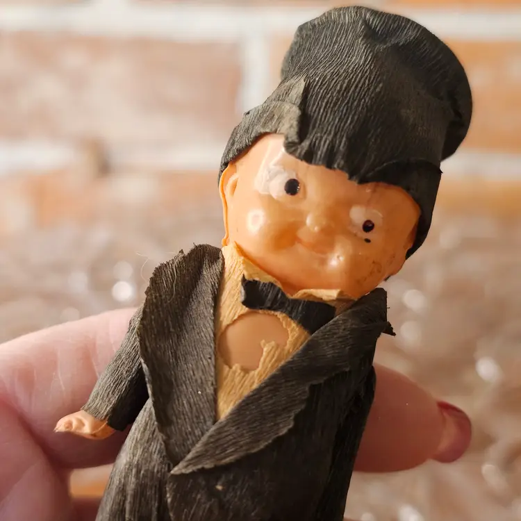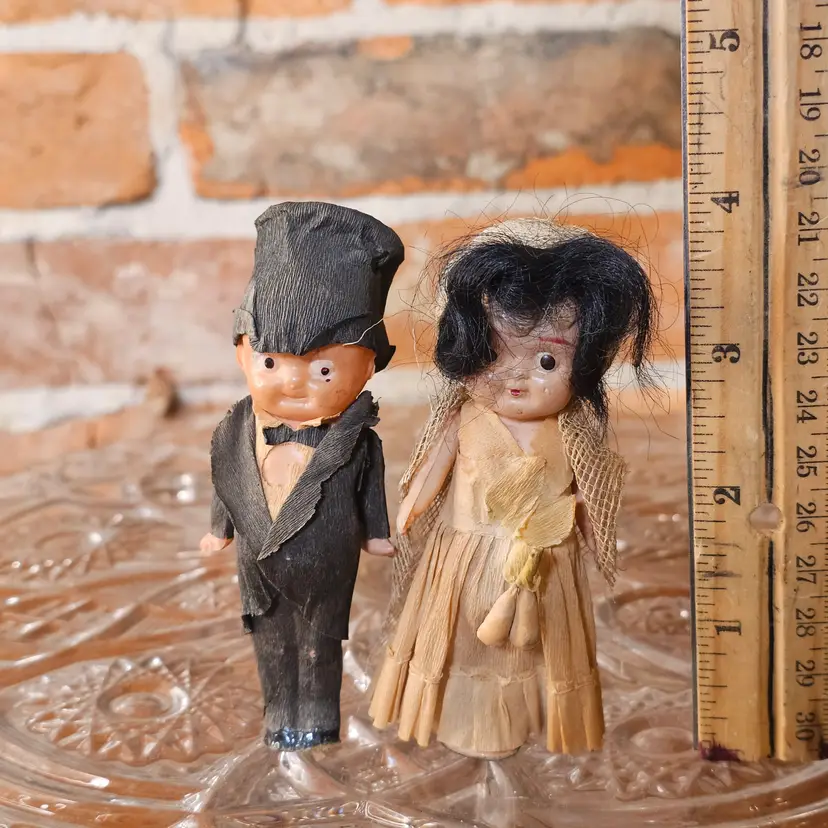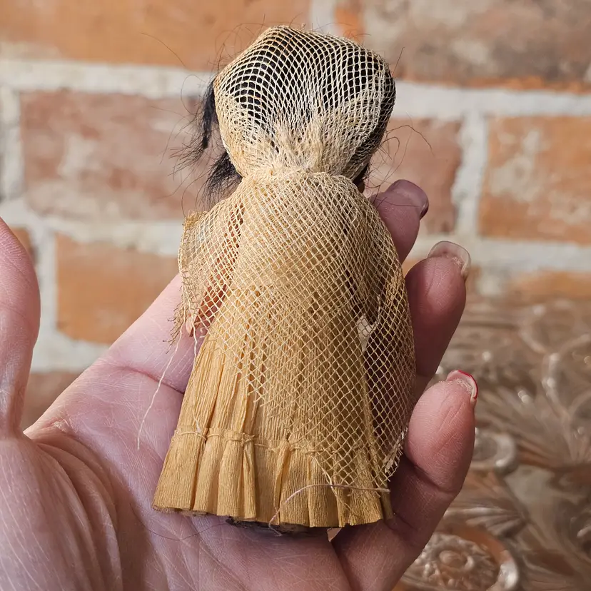 approx 4" tall. Both come in original crepe paper clothing. See all photos for condition.