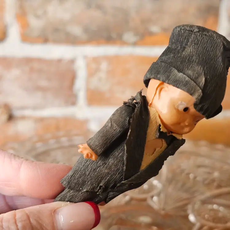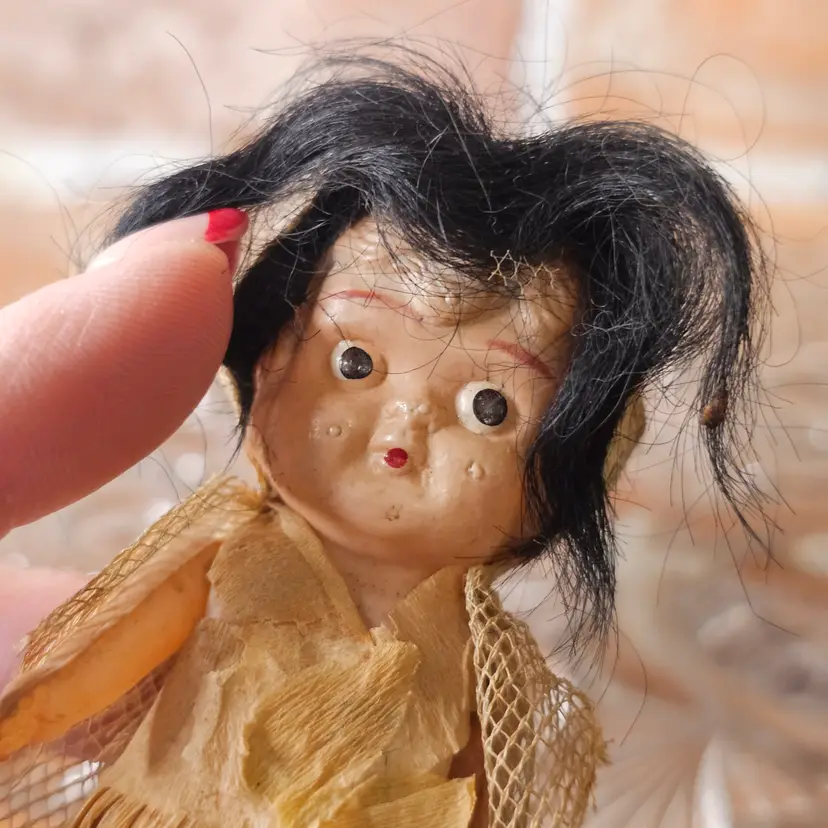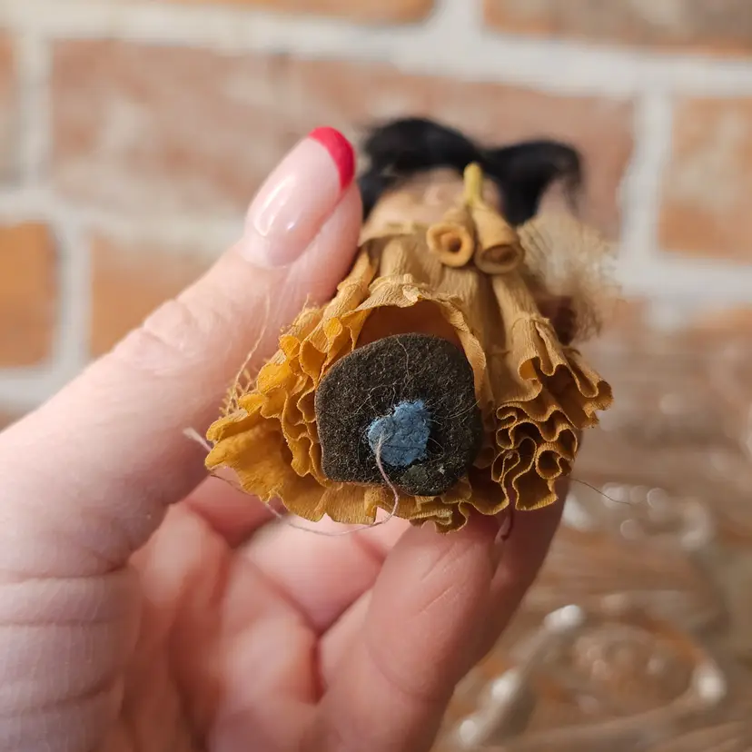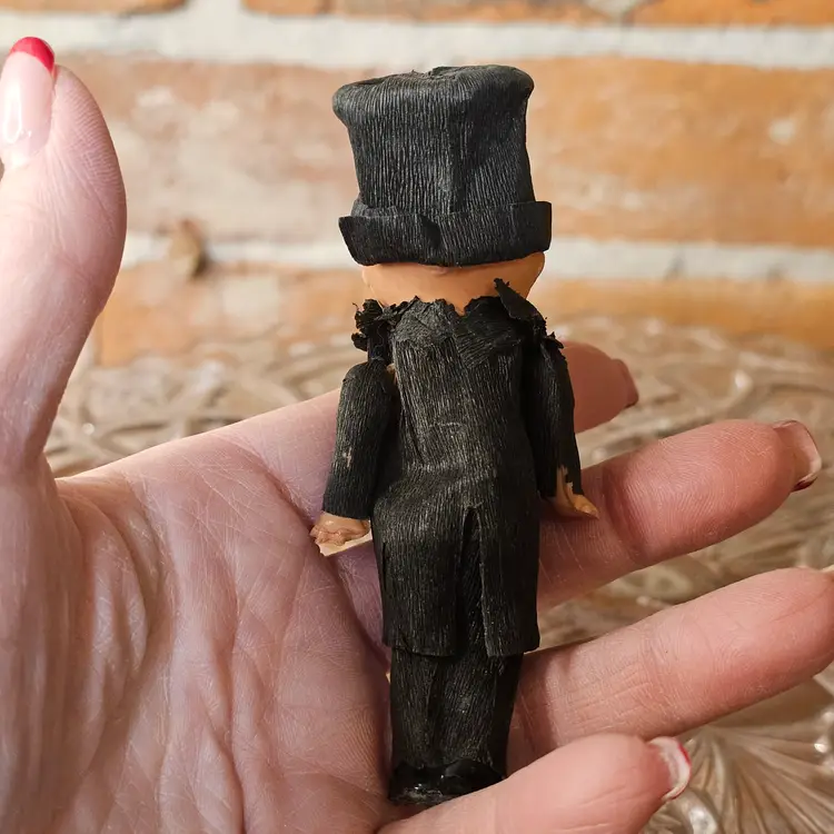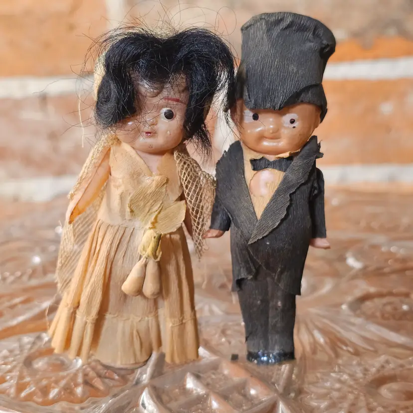 approx 4" tall. Both come in original crepe paper clothing. See all photos for condition.