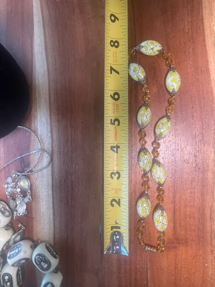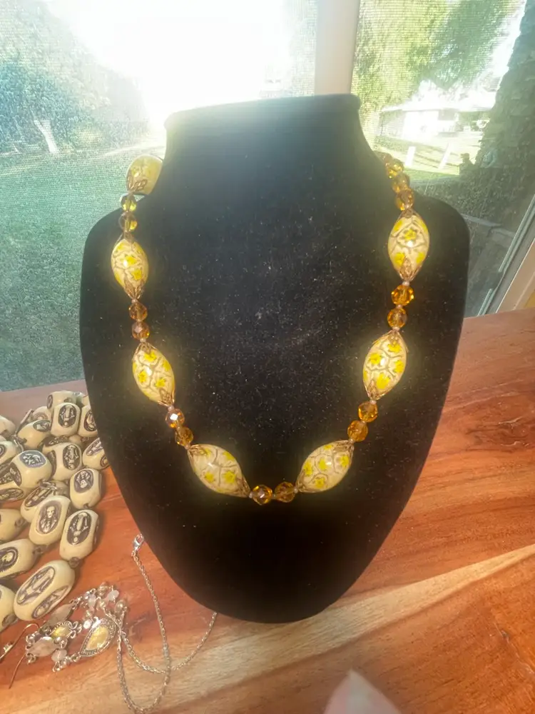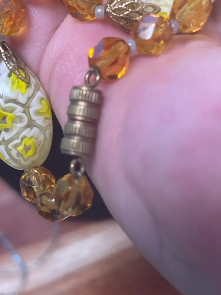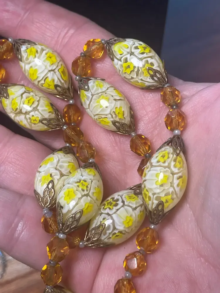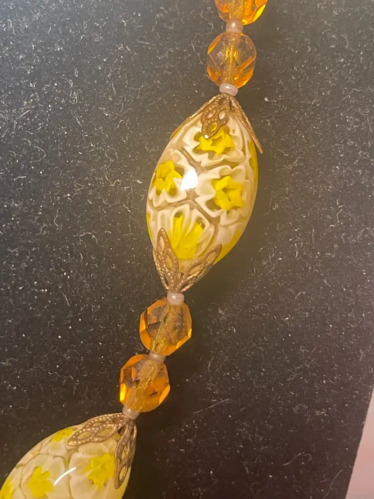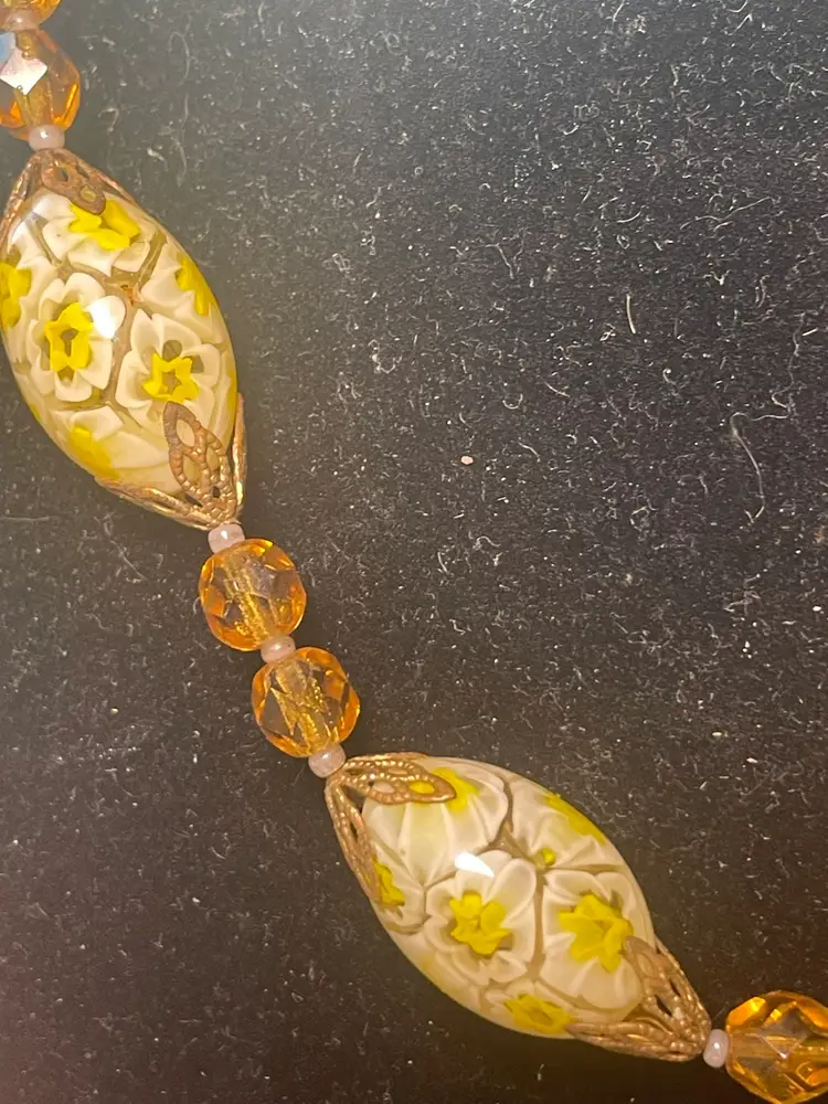 The oval beads are floral-patterned glass, likely Millefiori or lampwork glass beads. They have yellow flower designs embedded in creamy-white glass, and are capped with decorative filigree metal ends (common in vintage costume jewelry). Spacer Beads: Smaller faceted amber-colored glass beads (possibly Czech or Bohemian crystal) are used between the large floral beads. Tiny grey spacer beads between the amber ones suggest hand-stringing.