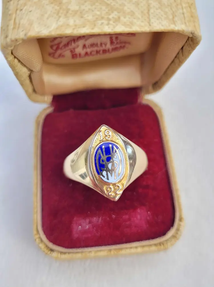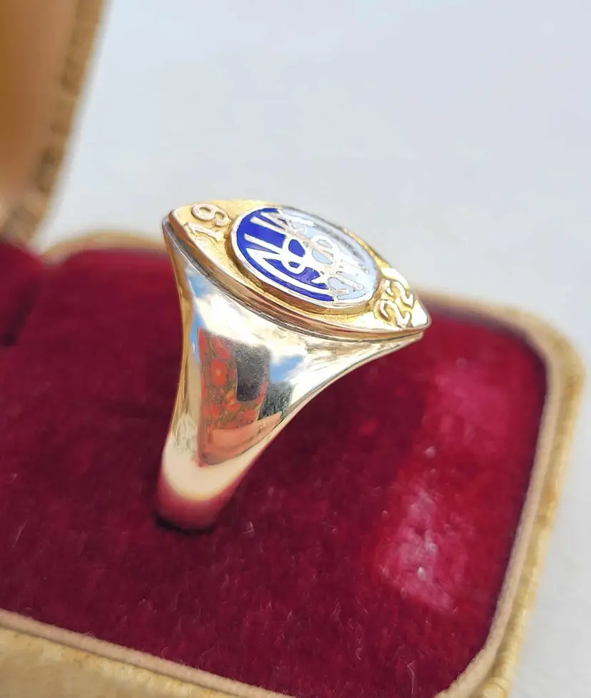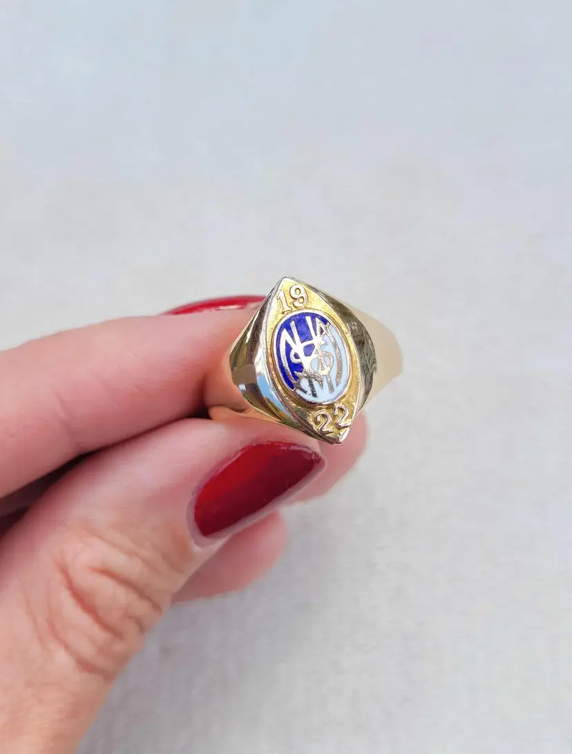 Handsome solid 10k yellow gold 1922 class ring! This is from an estate and in very good condition, weighing in at 5.59 grams. It is unmarked so has been tested via Auracle tester and acid testing to verify purity. There is beautiful cobalt blue enamel work on the front with a design that appears to say "MHS." Please see pictures for details and measurements, does not include my ring box.