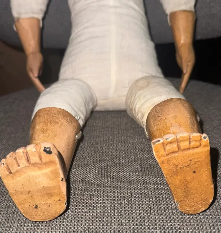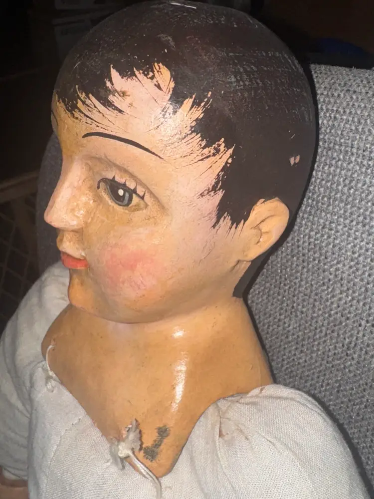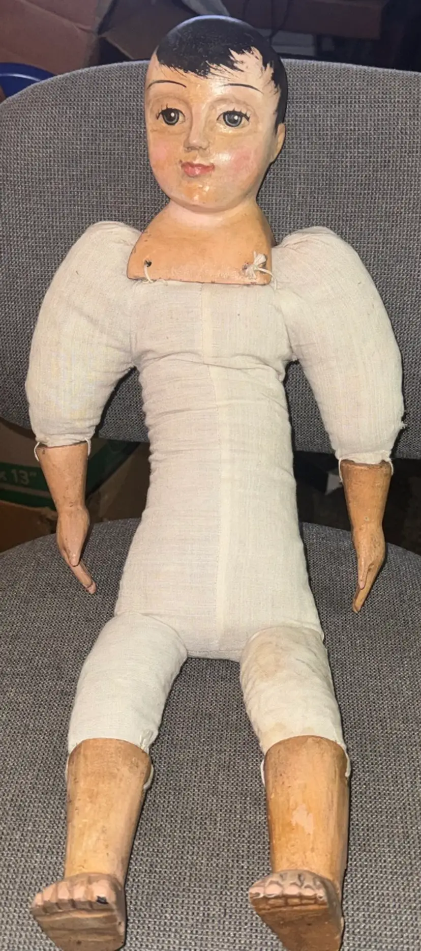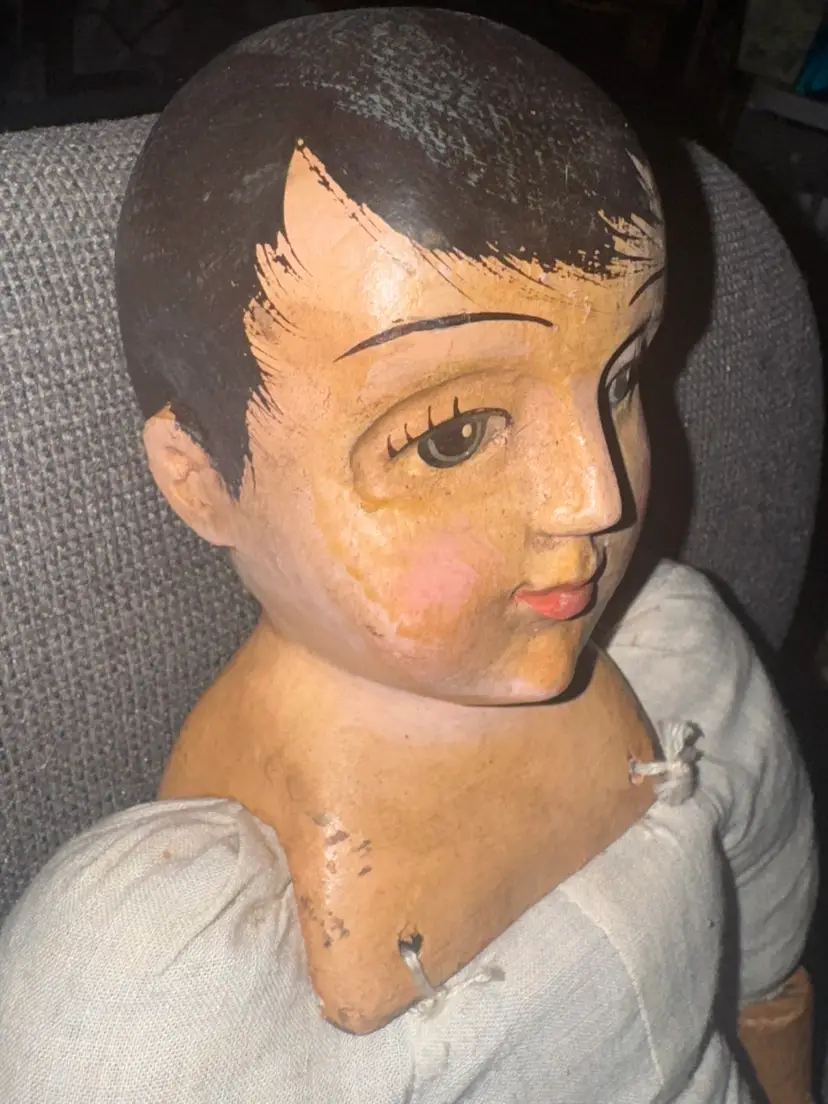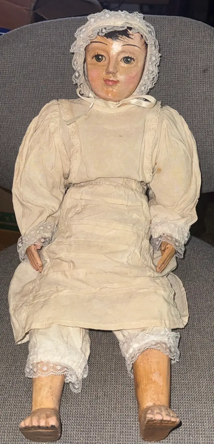 This antique 24-inch wood doll has a hand-carved and hand-painted head, hands, and feet, a Muslin sawdust stuffed body, with brown hair, blue eyes, and a light complexion. Handmade probably between 1880 and 1920 this original play doll represents a piece of history with its unique craftsmanship. Overall it is in very good condition with no chips or cracks to the head or hands and only minor chips to some of the toes which would have been hanging down when its little girl mommy was carrying it around. The body looks in good condition with no holes and only minimal discoloration to one leg. I would assume the head, hands, and feet have been reattached to then body at some point because those strings are bright white. The lace on the outfit has torn in the front but otherwise it looks good as well. Feel free to make me an offer or let me know if you have any questions or information about this doll, I have only been able find one or 2 others and not much information at all.