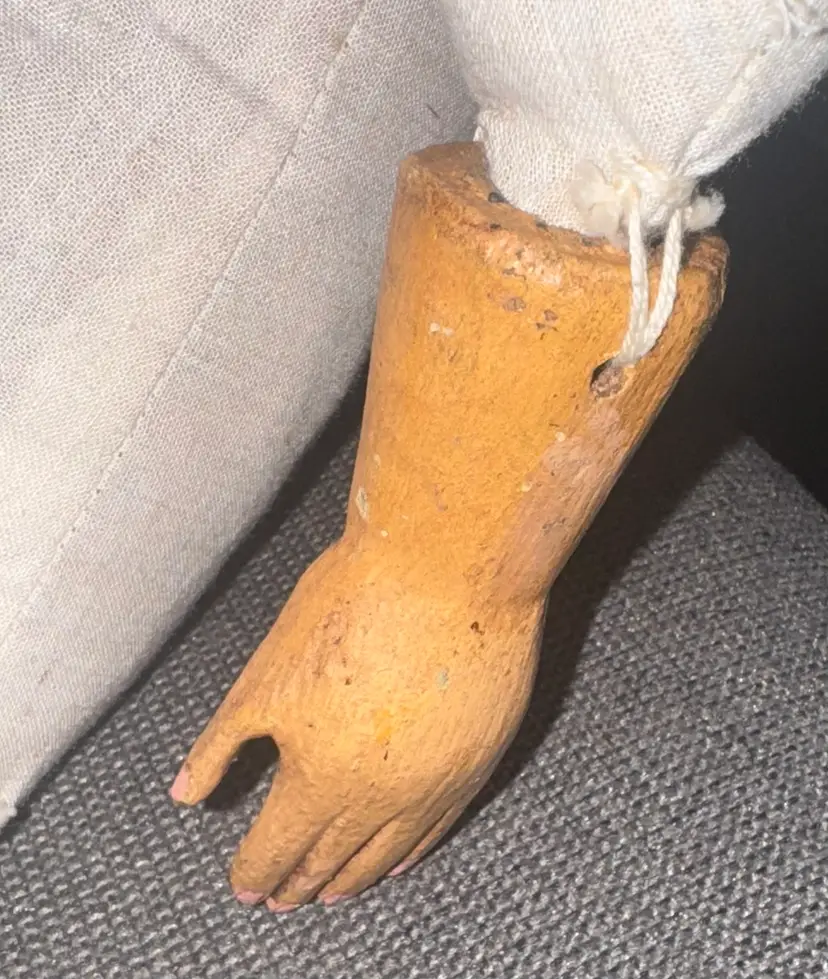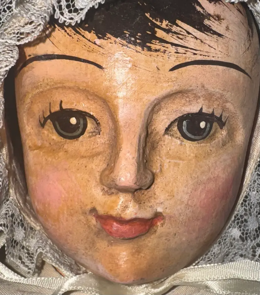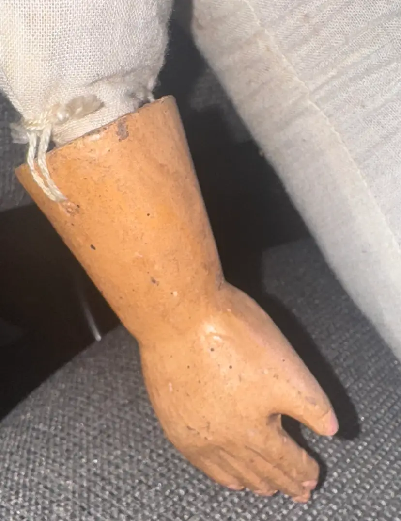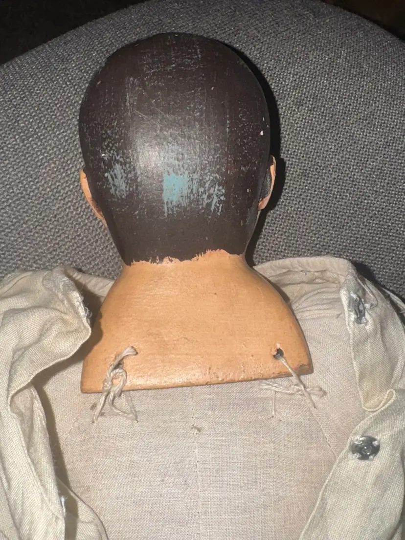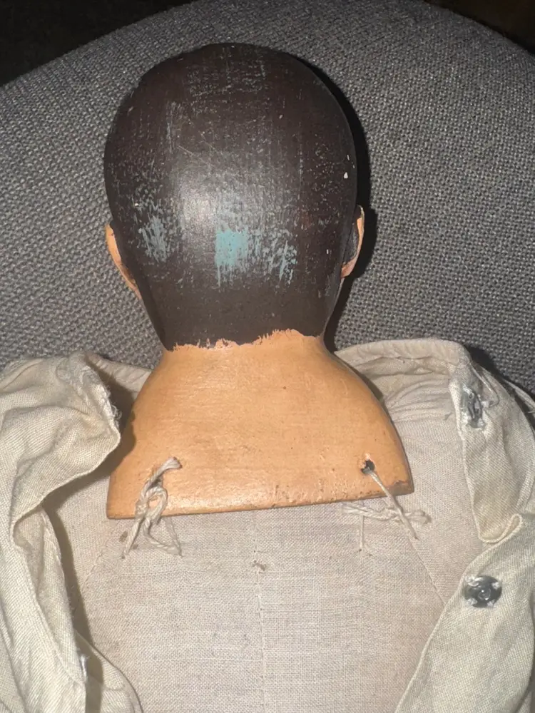 This antique 24-inch wood doll has a hand-carved and hand-painted head, hands, and feet, a Muslin sawdust stuffed body, with brown hair, blue eyes, and a light complexion. Handmade probably between 1880 and 1920 this original play doll represents a piece of history with its unique craftsmanship. Overall it is in very good condition with no chips or cracks to the head or hands and only minor chips to some of the toes which would have been hanging down when its little girl mommy was carrying it around. The body looks in good condition with no holes and only minimal discoloration to one leg. I would assume the head, hands, and feet have been reattached to then body at some point because those strings are bright white. The lace on the outfit has torn in the front but otherwise it looks good as well. Feel free to make me an offer or let me know if you have any questions or information about this doll, I have only been able find one or 2 others and not much information at all.