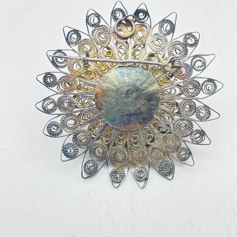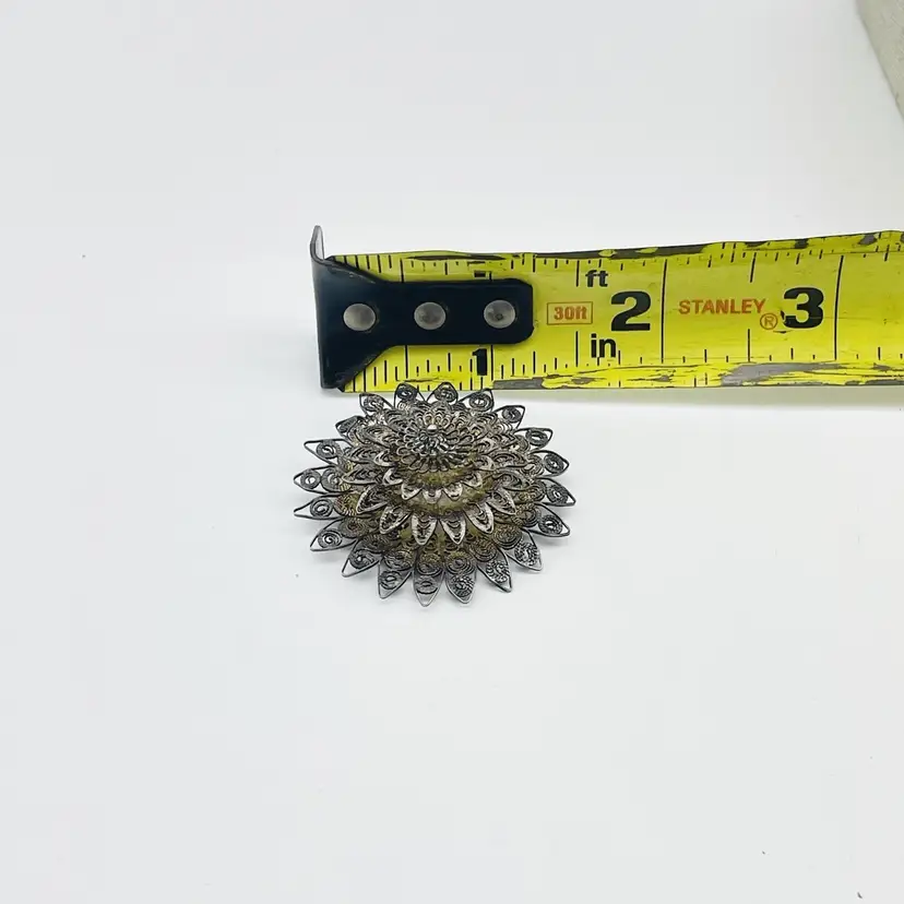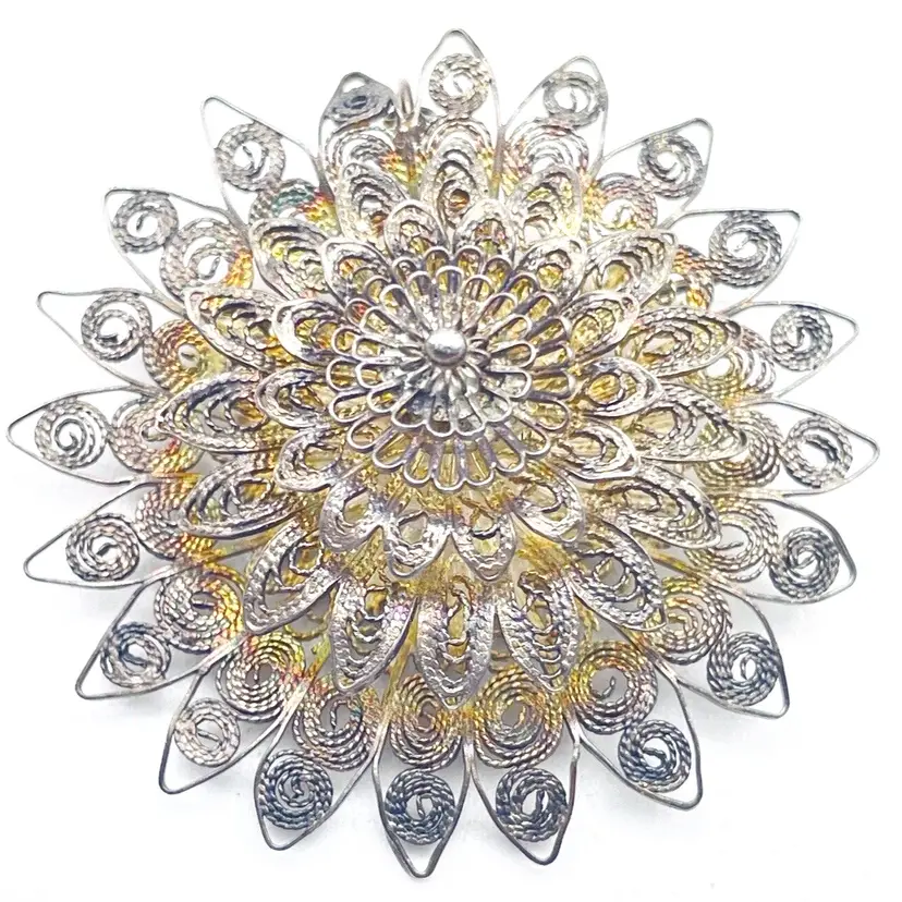 Stunning antique 800 silver filigree brooch featuring intricate handworked floral scrolls in a radiant starburst form. A fine example of early 20th-century European craftsmanship. Features: Hallmarked 800 silver Detailed filigree scrollwork Starburst floral motif, 1.25 inch Handcrafted artisan piece Secure pin and clasp Likely Italian or German origin Estimated era: early 1900s–1920s antique silver brooch, 800 silver filigree, European silver jewelry, vintage starburst brooch, antique floral pin, handcrafted silver brooch, early 1900s jewelry, collectible filigree brooch, Italian silver jewelry, German silver brooch, ornate vintage pin, antique artisan jewelry, heirloom silver piece